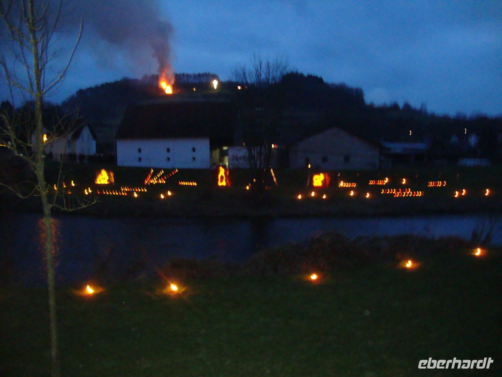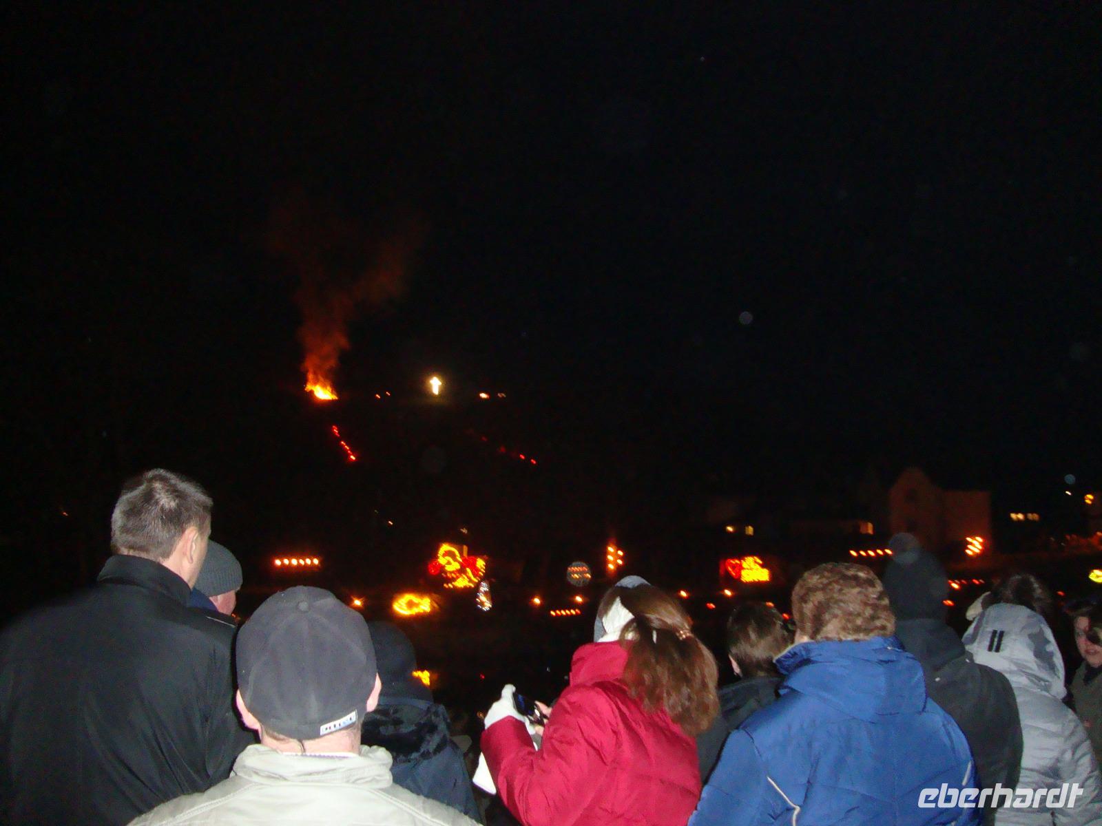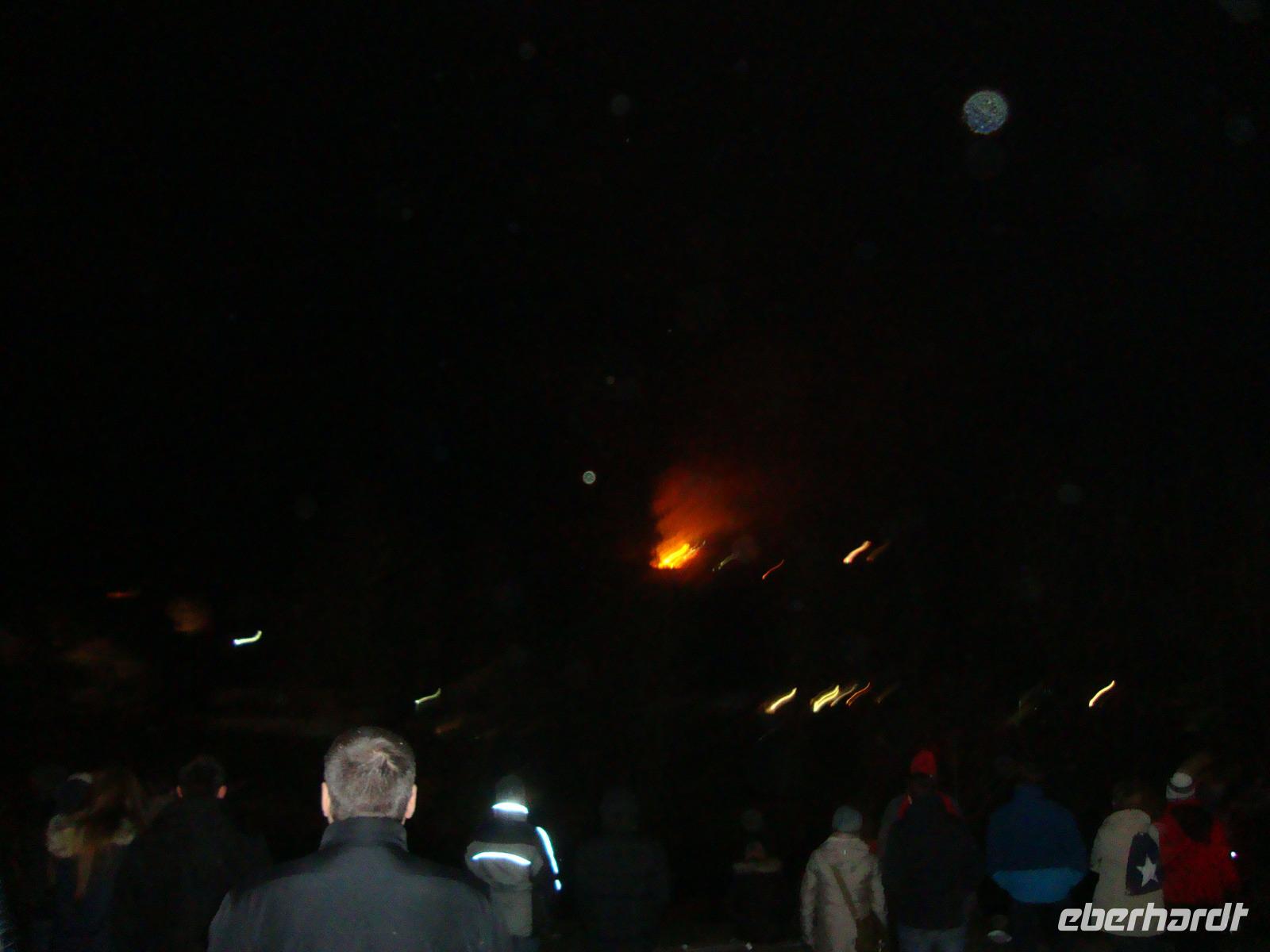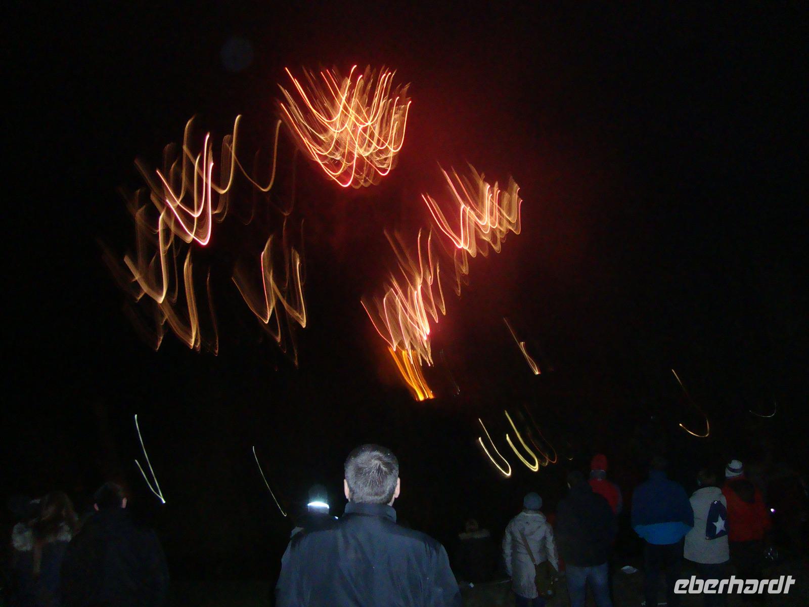 Der Höhepunkt unseres Programms folgte am Abend. Es waren geschätzt ca. 5000 Zuschauer in Lügde, um das Spektakel des Osteräderlaufes zu erleben. Das Volksfest beginnt schon am Nachmittag im Emmerauenpark.Das osterfeuer wird auf dem Osterberg angezündet. Am 35 m hohen Osterkreuz geht das Licht an. Wenn es dunkel ist, gegen 21.00 Uhr, wird das erste Rad zum Startplatz gerollt Das Licht des Osterkreuzes erlischt, ein Schuss aus der Kanone wird abgefeuert. Dann stecken die Dechen (Brauchtumswärter) das Rad oder genauer das Stroh mit Fackeln in Brand. Ein beidseitiger Schubs mit der Balancierstange und das lichterloh brennende Osterrad macht sich auf den Weg ins Tal hinab. Dabei springt es über Unebenheiten hinweg und das herausfallende Stroh hinterlässt eine lodernde Spur. Wenn alle 6 Räder bis ins Tal rollen, soll die kommende Ernte gut ausfallen, sagte man früher. Ein prächtiges Feuerwerk bildet den Abschluss dieses gewaltigen Spektakel.