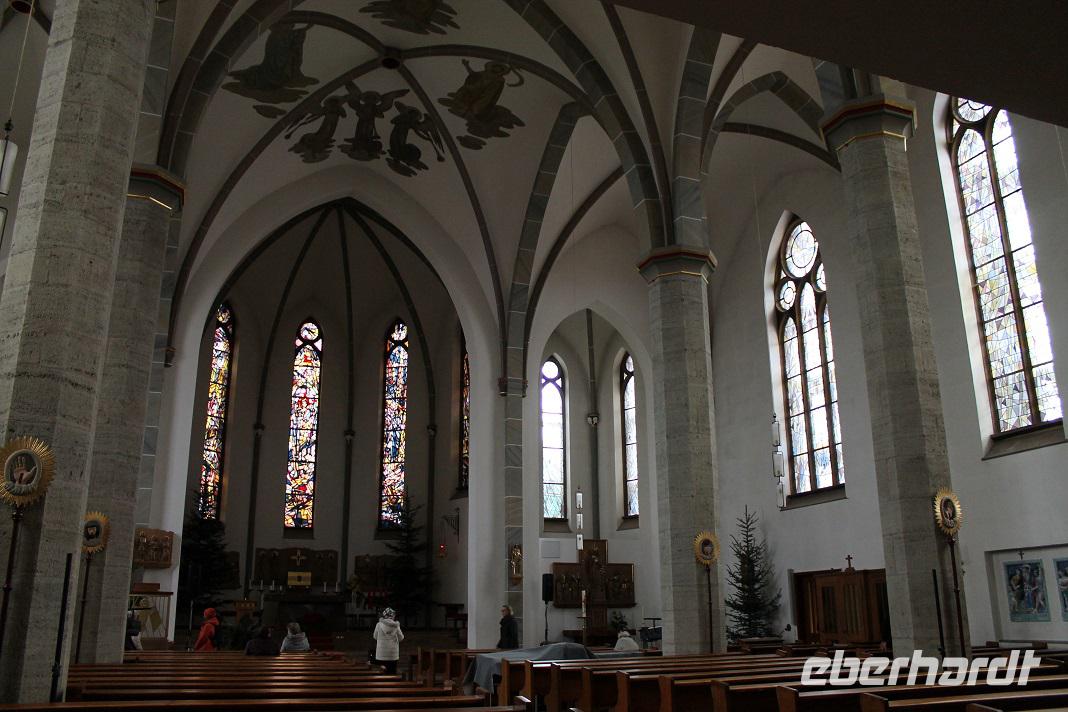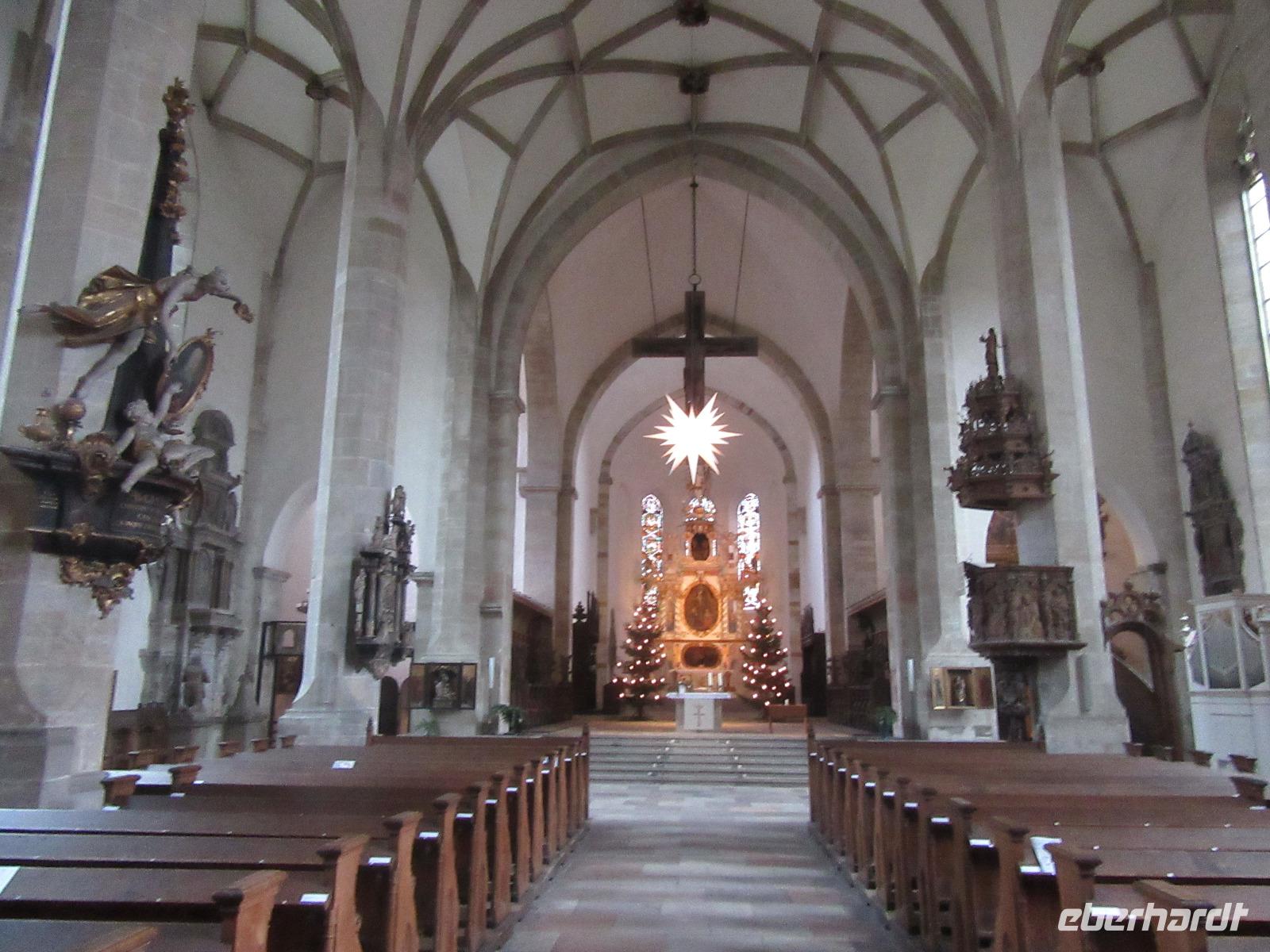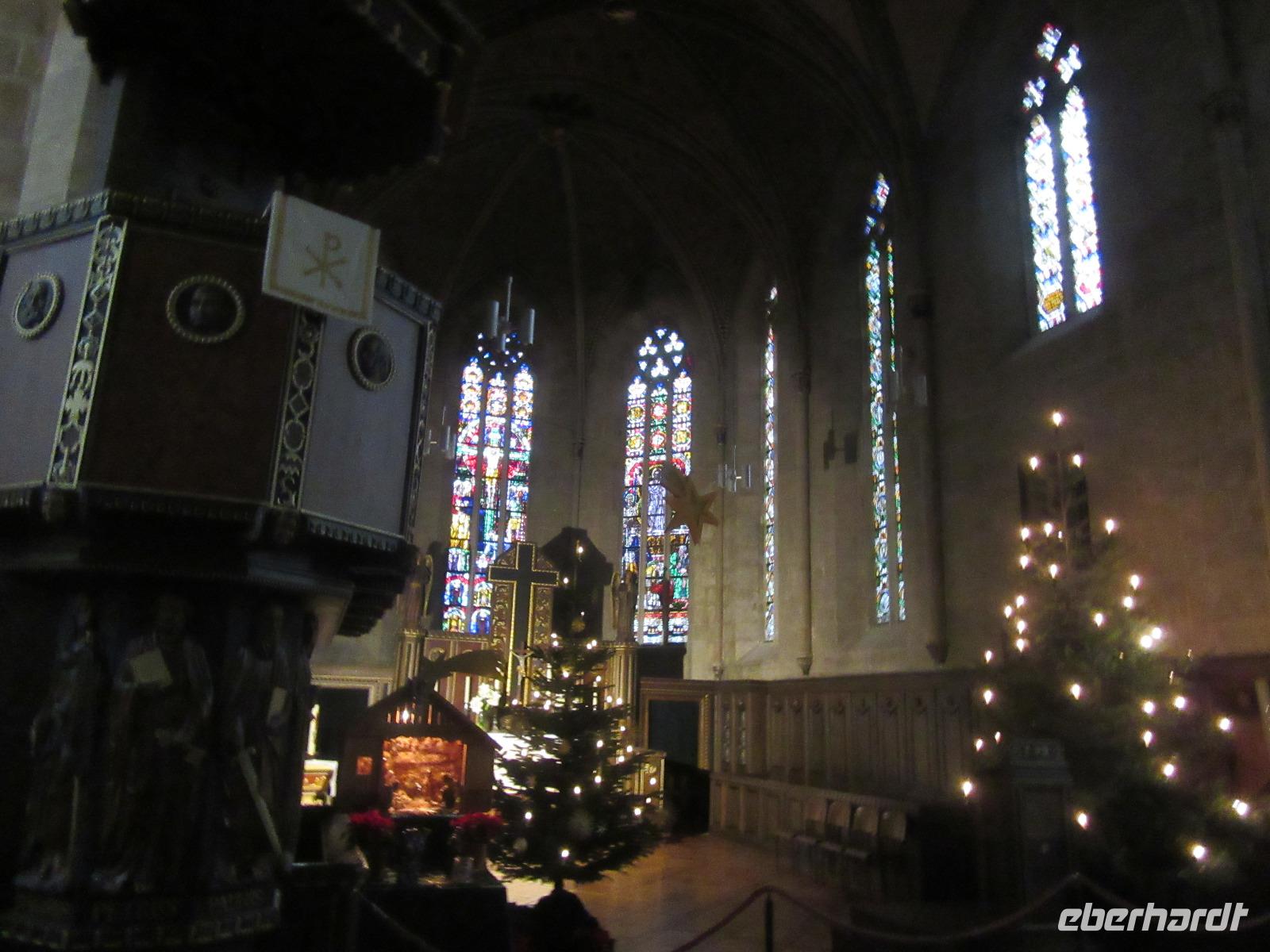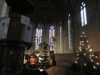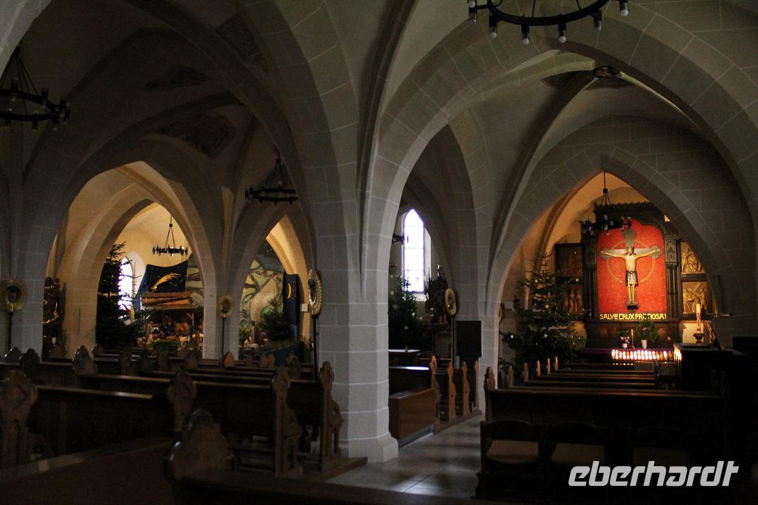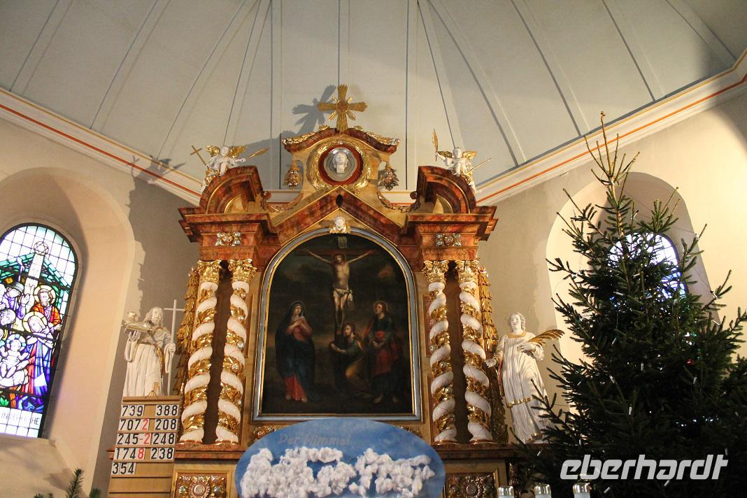 Danach ging unsere Fahrt weiter nach Küllstedt. Im Mittelpunkt steht die größte Pfarrkirche des Eichsfelds, mit Namen „St. Georg & Juliana". Das sollte zum Höhepunkt werden. Eine Krippe, die den ganzen Chorraum ausfüllt und aus 53 Holzfiguren, gefertigt vor über 60 Jahren im Oberammergau, besteht. Vor 13 Meter hohen Fichten und einem 3 Meter hohen Krippenstall findet man die typischen Krippenszenen und im Mittelpunkt die heilige Familie mit Ochs und Esel. Wir genossen diesen Anblick und haben lange inne gehalten.