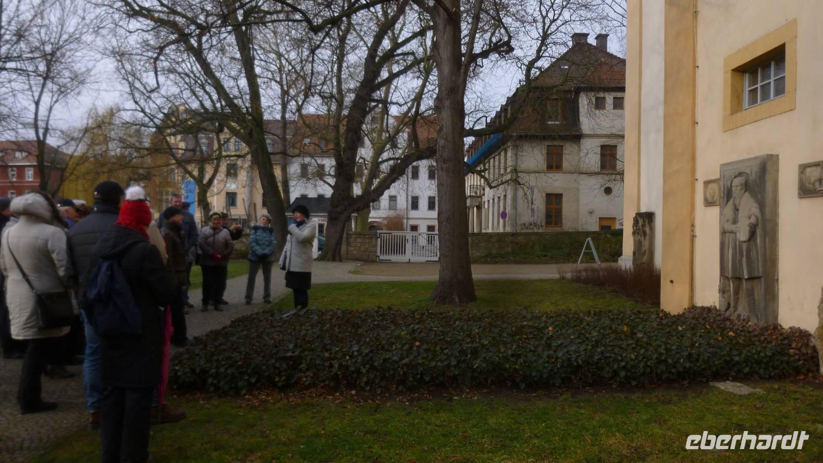 Noch ist die Reise nicht zuende. Unser letzter Programmpunkt - Weimar - erwartet uns. Es ist kälter geworden, aber es bleibt trocken. Wir haben schon wieder großes Glück mit unseren Stadtführerinnen, die uns mit großer Begeisterung die Stadt näher bringen. Auf dem Jakobsfriedhof erfahren wir mehr über viele Berühmtheiten der Stadt, wie zum Beispiel der Frau Goethes - Christiane von Goethe, oder Musäus, welcher damals viele alte Volksmärchen zu Papier brachte. Auf dem Weihnachtsmarkt ... nein.. Wintermarkt lernen wir zum Beispiel auch die Geschichte hinter dem Hotel Elephant kennen. Und natürlich darf viel Hintergrundwissen über Goethe und Schiller nicht fehlen. Unsere anschließende Freizeit nutzen wir für einen wärmenden Kaffee oder ein leckeres Mahl in einem der heimischen Restaurants.