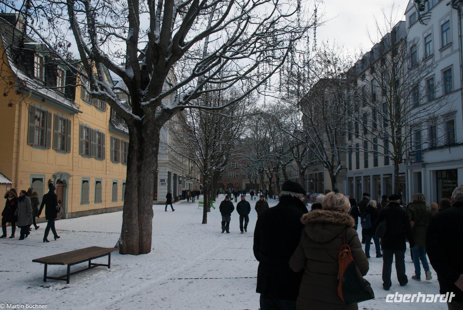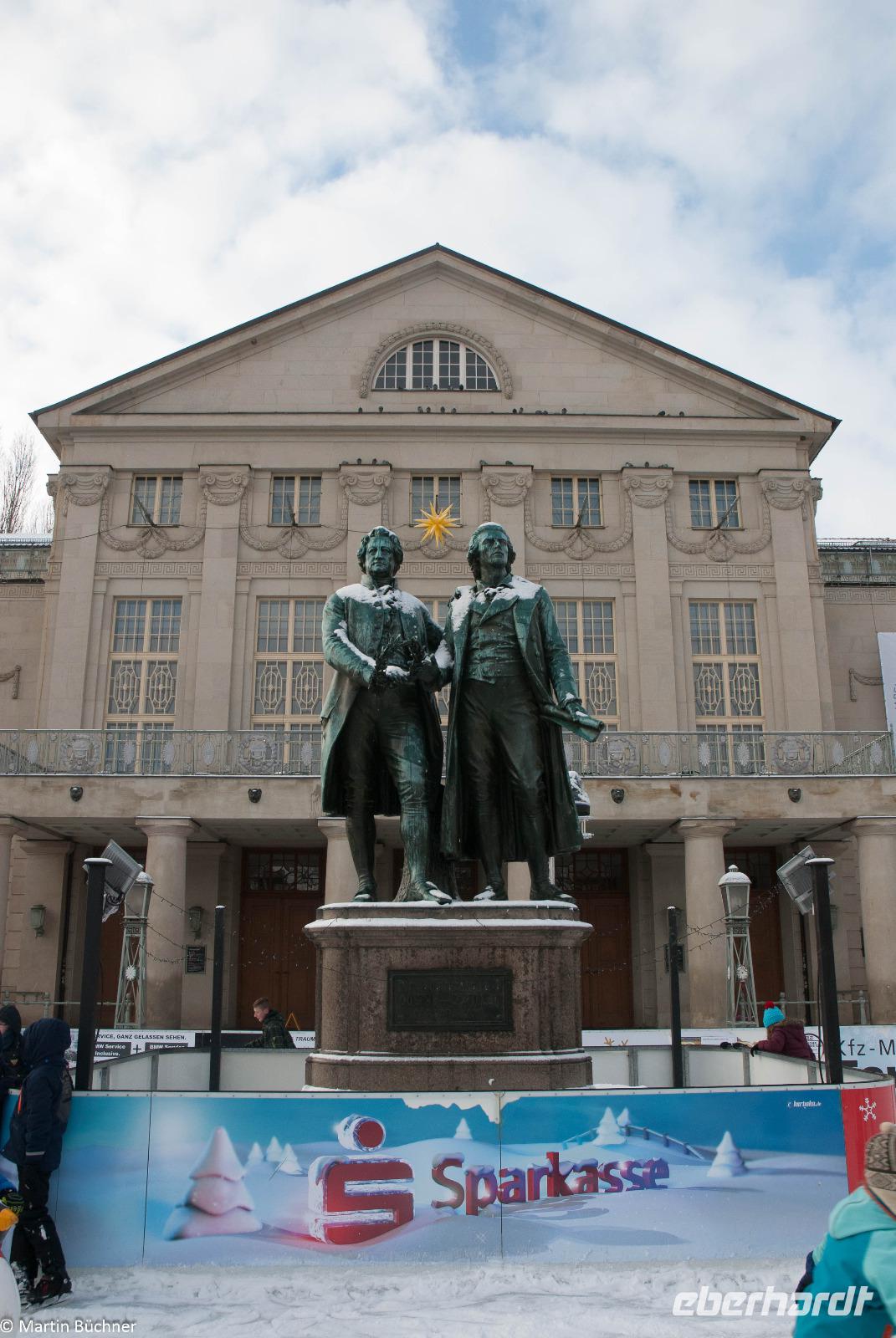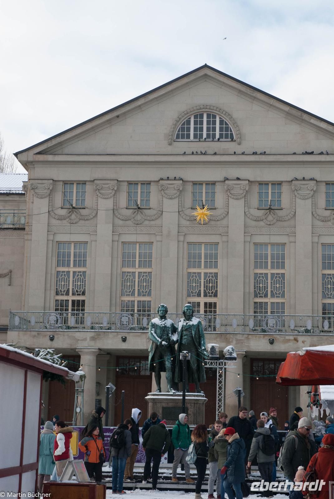 Der Tag der Rückreise. Die verhältnismäßig geringe Entfernung nach Dresden erlaubt uns noch eine wunderbare Stadtführung in Weimar. Wir starten am Markt, besuchen die Kirche St. Peter & Paul, im Volksmund „Herder Kirche" genannt. Hier bestaunen wir den berühmten Cranach Altar. Am Deutschen Nationaltheater mit dem berühmten Goethe-Schiller-Denkmal legen wir im verschneiten Weimar eine kleine Glühwein-Unterbrechung ein, es ist noch Wintermarkt.