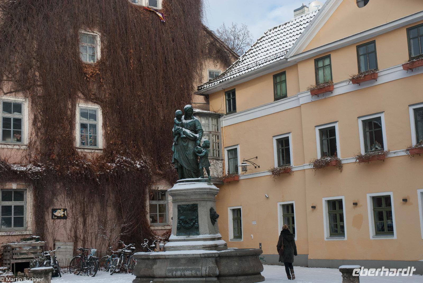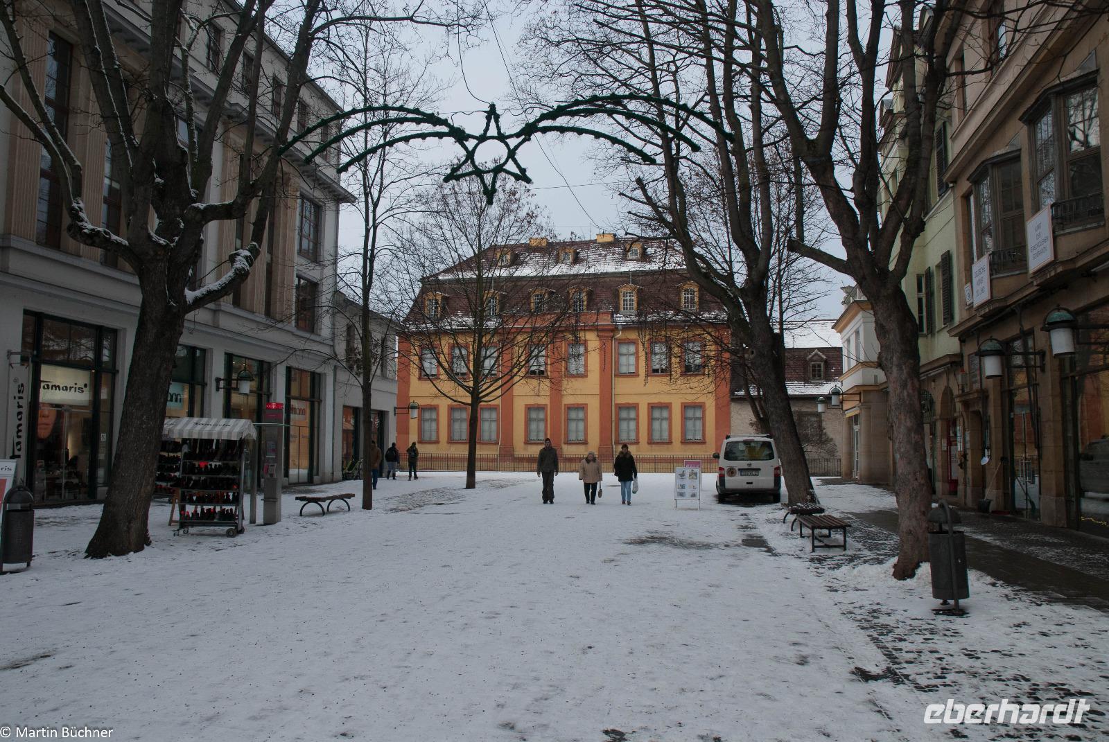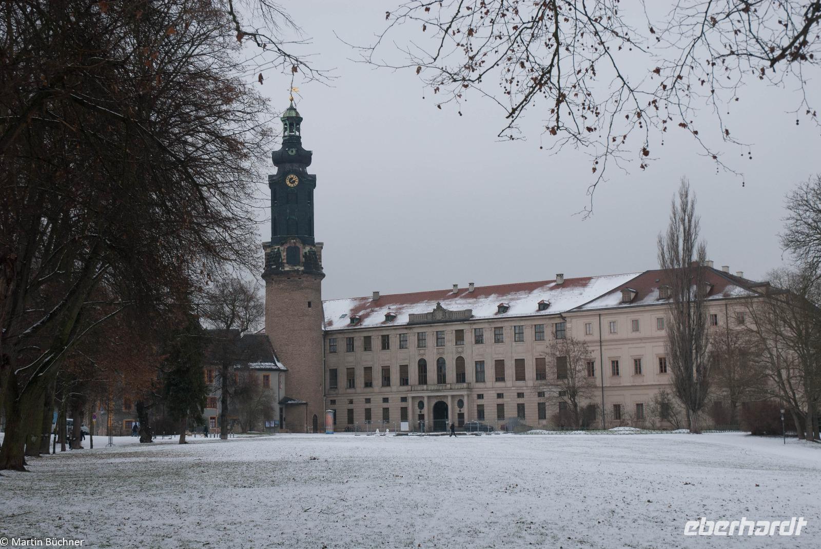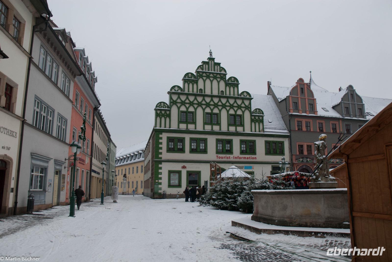 Der Tag der Rückreise. Die verhältnismäßig geringe Entfernung nach Dresden erlaubt uns noch eine wunderbare Stadtführung in Weimar. Wir starten am Markt, besuchen die Kirche St. Peter & Paul, im Volksmund „Herder Kirche" genannt. Hier bestaunen wir den berühmten Cranach Altar. Am Deutschen Nationaltheater mit dem berühmten Goethe-Schiller-Denkmal legen wir im verschneiten Weimar eine kleine Glühwein-Unterbrechung ein, es ist noch Wintermarkt.