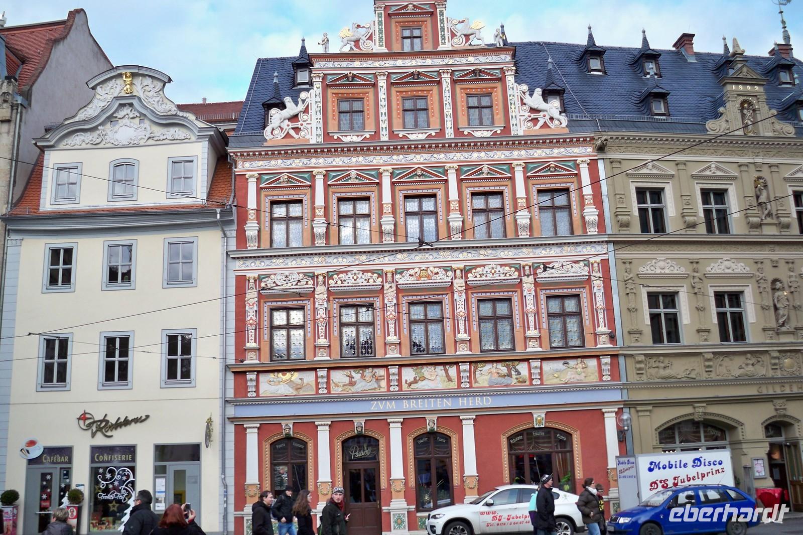 Nach einem ausgiebigen Frühstück begann bei sehr schönem Wetter unser Rundgang durch Erfurt. In zwei Gruppen unternahmen wir mit „Luther“ und dem Prediger „Johannes Lang“ in zwei Stunden einen gemütlichen Stadtrundgang an den Wirkungsstätten Luthers vorbei. Kurzweilig und mit viel Humor verstanden es beide Stadtführer die Gäste zu unterhalten. Knapp drei Quadratkilometer des mittelalterlich geprägten Stadtkerns mit seinen 25 Pfarrkirchen und zahlreichen Fachwerk- und Bürgerhäusern haben wir zu Fuß erkundet. Die Landeshauptstadt des Freistaates Thüringen beeindruckte wirklich alle Gäste. Vorbei am Erfurter Dom, einer der Hauptsehenswürdigkeiten der Stadt, spazierten wir bis zum „Anger“. Am Lutherdenkmal endete unser Rundgang und die von Eberhardt Travel spendierte original Thüringer Rostbratwurst schmeckte wirklich lecker. Der Nachmittag stand zur freien Verfügung. Es gab ja noch so viel individuell zu entdecken und ein wenig ausruhen bis zum Abend war auch angesagt. 19.00 Uhr fanden sich alle zur Silvesterfeier im historischen „Lutherkeller“ ein. Der „Mittelalterliche Jahreswechsel“ mit dem Ratsherrn Schmaus, reichlich und deftig, erwartete uns. Von Hans, unserem Minnesänger, wurden wir herzlich begrüßt und trefflich den gesamten Abend unterhalten. Eine besonders sangesfreudige Reisegruppe verbrachte die letzten Stunden des Jahres gemeinsam. Zwischendurch testete unsere Reiseleiterin Irene das Wissen der Teilnehmer bei einem Quiz, passend zur Reise, zum Mittelalter. So verging die Zeit bis zum Jahreswechsel schnell. Mit vielen guten Wünschen für das Neue Jahr bedachten wir uns gegenseitig und auf den Straßen Erfurts feierten die Thüringer und ihre Gäste das Neue Jahr mit einem nicht endend wollenden Feuerwerk.