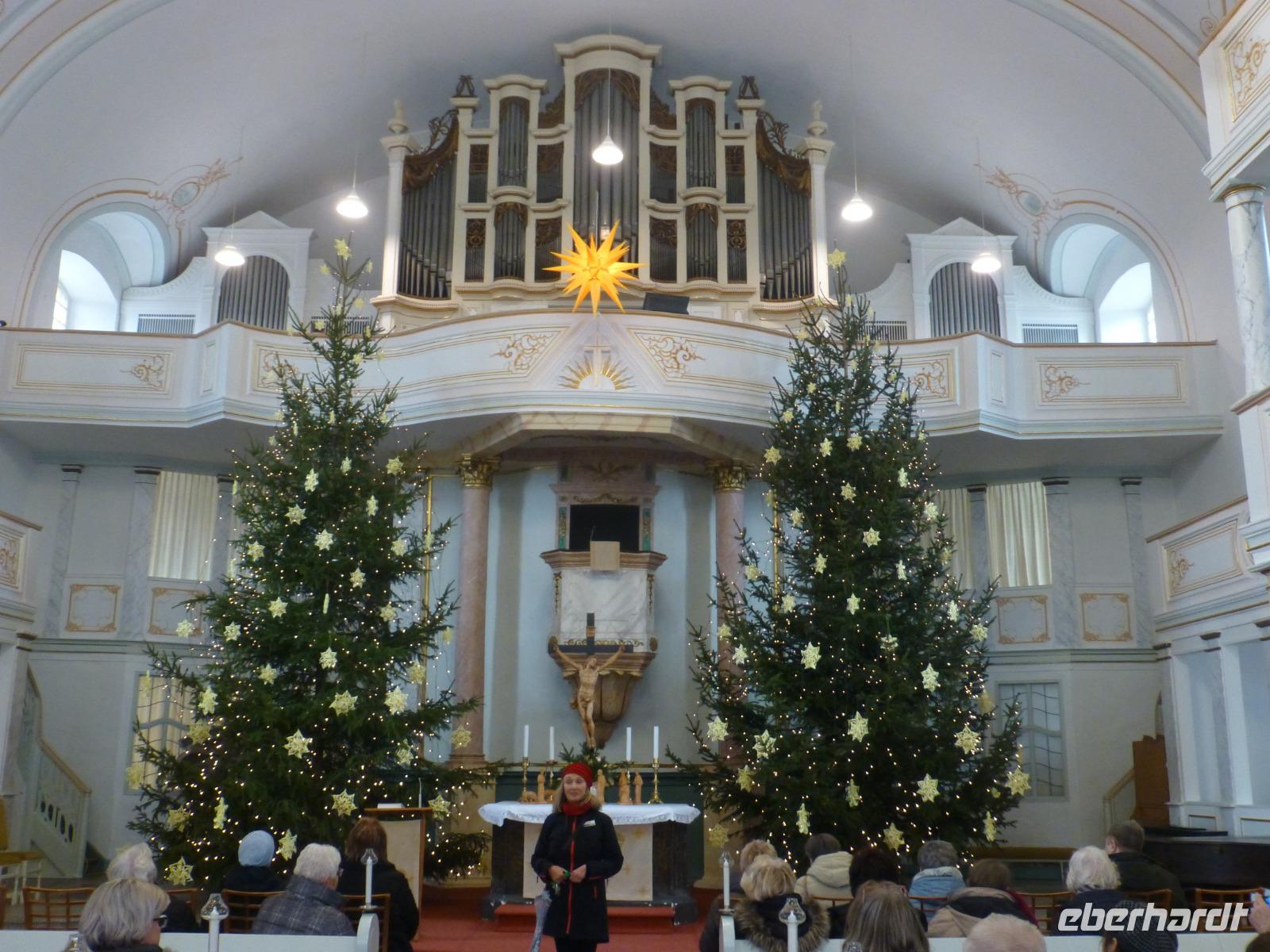 Unser Weg führte uns in das Werratal in die schöne Fachwerkstadt Eschwege. Immerhin sind dort über 1000 Fachwerkhäuser zu bewundern. Zur Stadtführung teilten wir uns in zwei Gruppen auf. Die erste Gruppe besuchte zuerst das Zinnfigurenkabinett. Extra für uns haben sich zwei Mitarbeiter des Vereins bereit erklärt die Ausstellung zu öffnen. Mit viel Leidenschaft und Lebensfreude wurden uns die verschiedenen Vitrinen erläutert und die eine oder andere Geschichte erzählt. Dabei tauchten wir 5000 Geschichte ein und bestaunten 15.000 Zinnfiguren. Die anderen Gäste unternahmen einen Stadtrundgang durch die Straßen und Gassen der Stadt und erfuhren Interessantes über die Fachwerkhäuser und ihre Verzierungen. Wir erreichten den Schulberg und hatten einen schönen Blick in das Werratal. Zurück in Bad Tabarz besuchten wir in der Peter und Paul Kirche die Kinderchristmette. Die Kinder trugen die Weihnachtsgeschichte vor und zwischen drin wurden gemeinsam Weihnachtslieder gesungen. Am späten Nachmittag wurden wir am Restaurant zu einer kleinen Feier begrüßt. Das Tabarzer Echo erfreute uns mit Weihnachtsliedern und weihnachtlichen Geschichten. Nach dem guten Weihnachtsbuffet schaute sogar der Weihnachtsmann vorbei und verteilte Geschenke. Wir ließen uns das Gala Buffet munden.