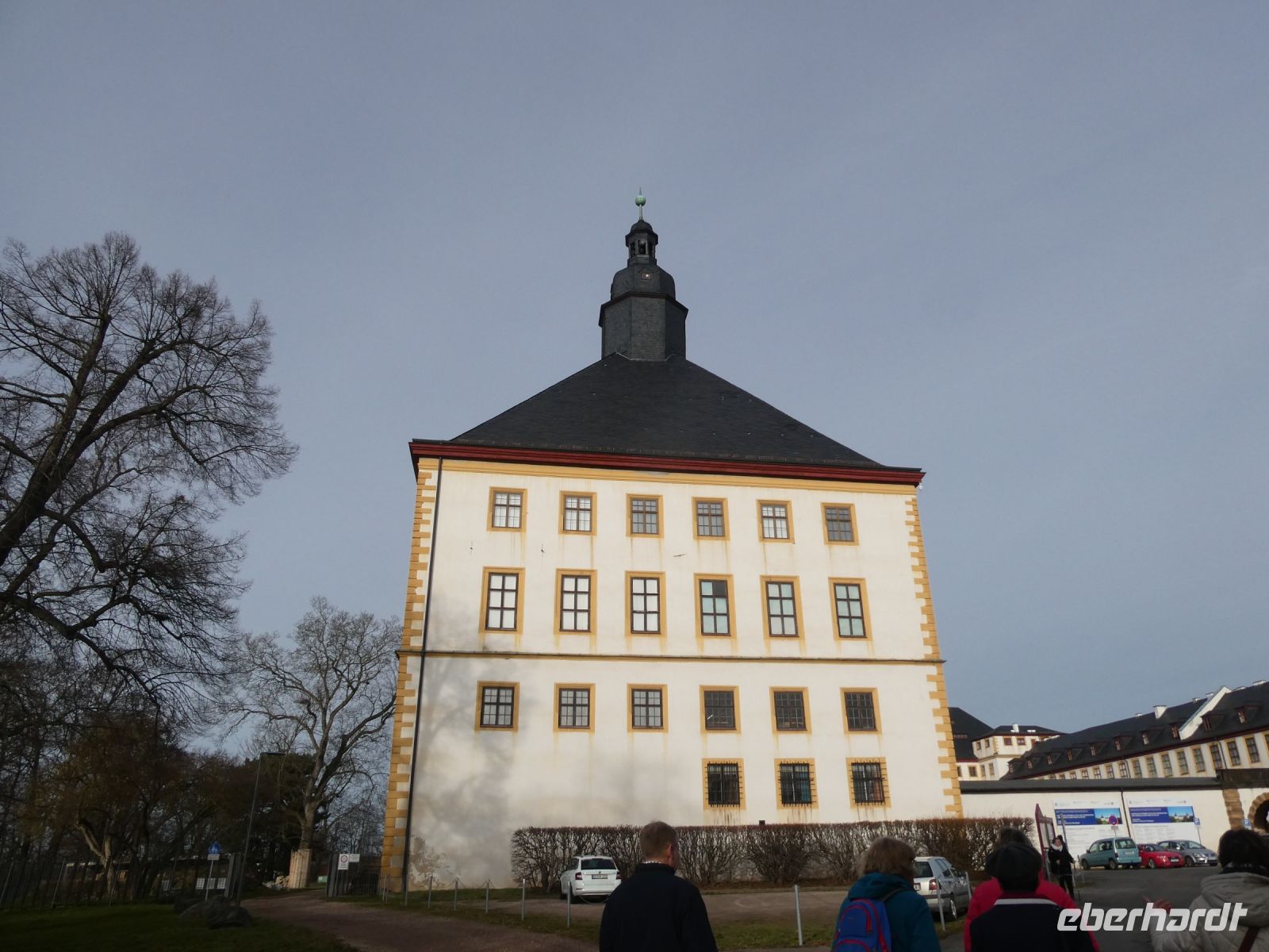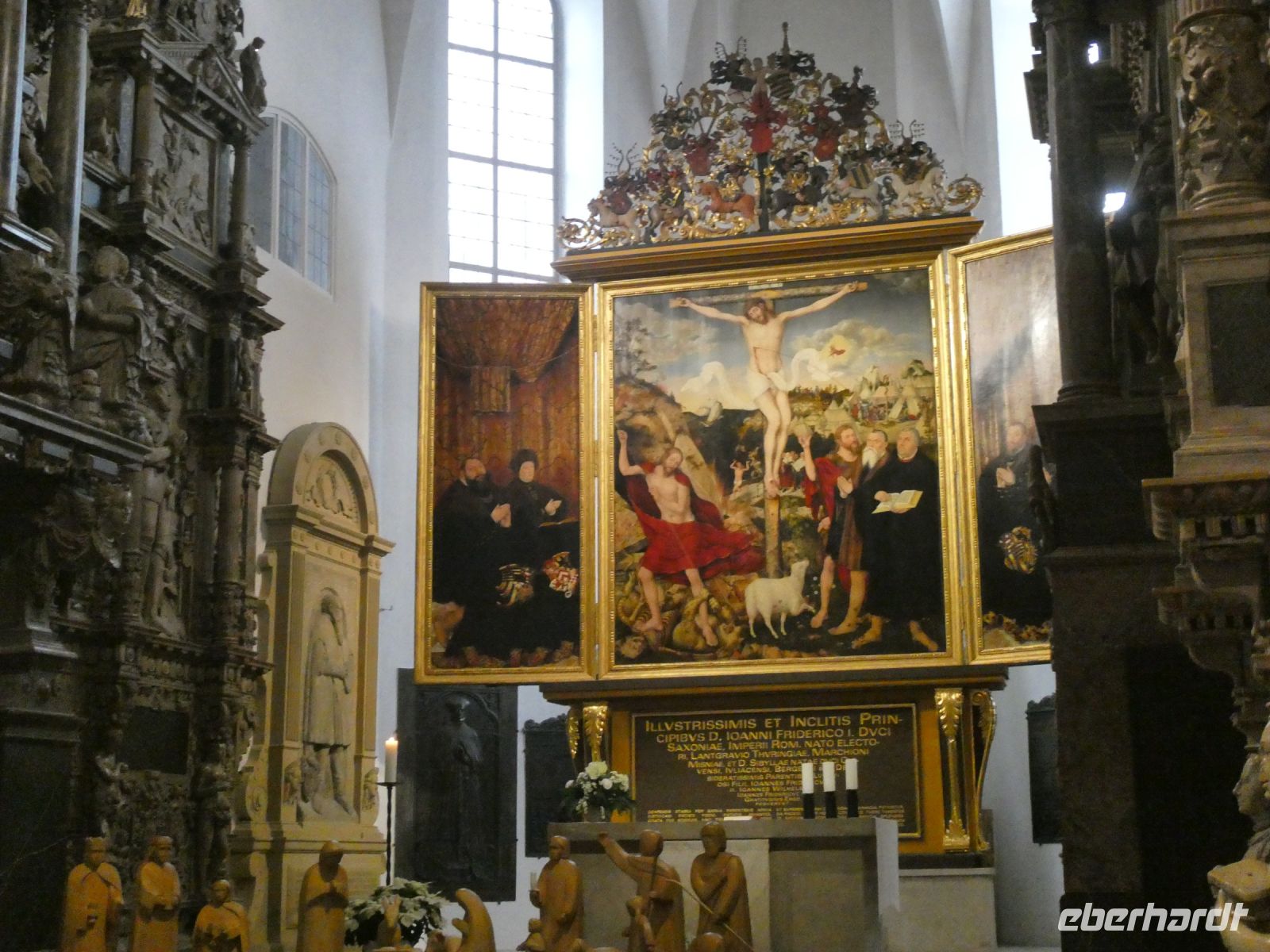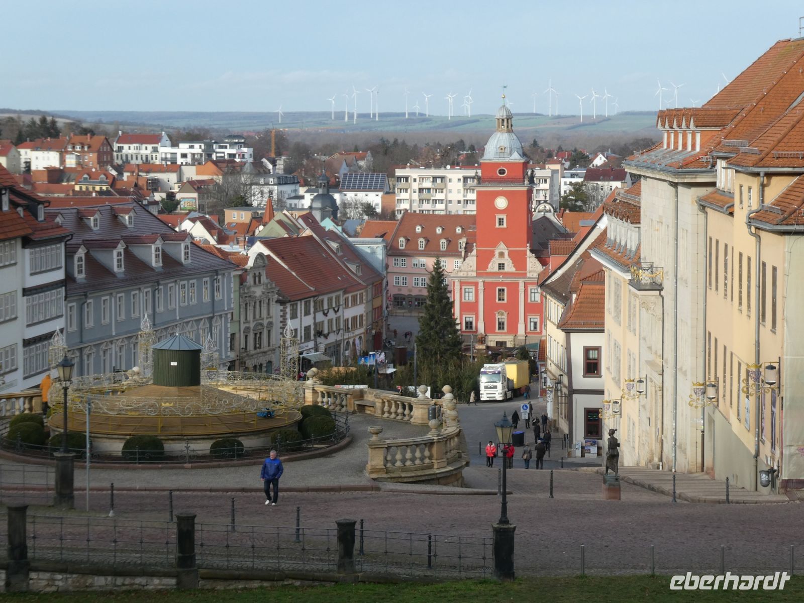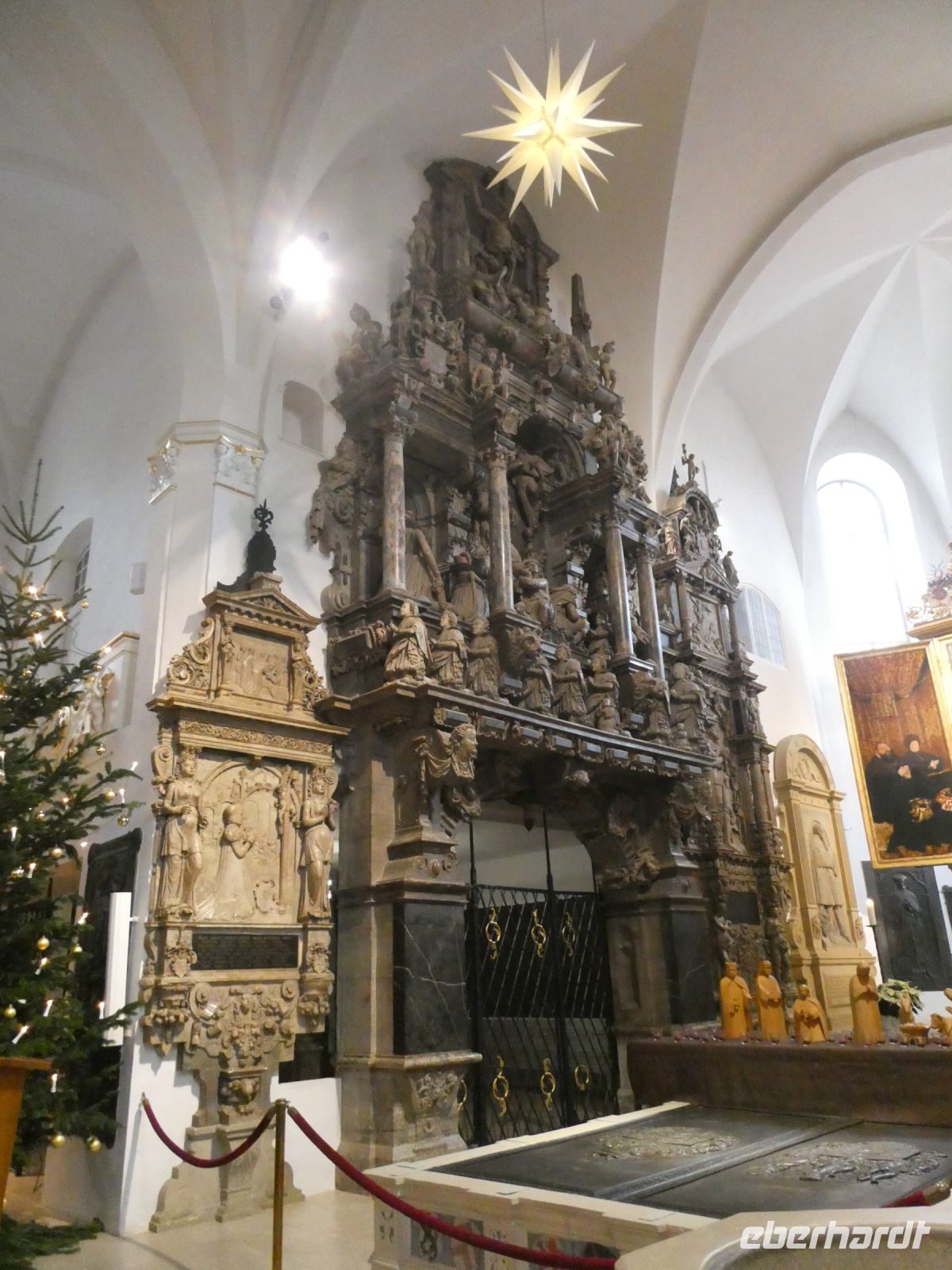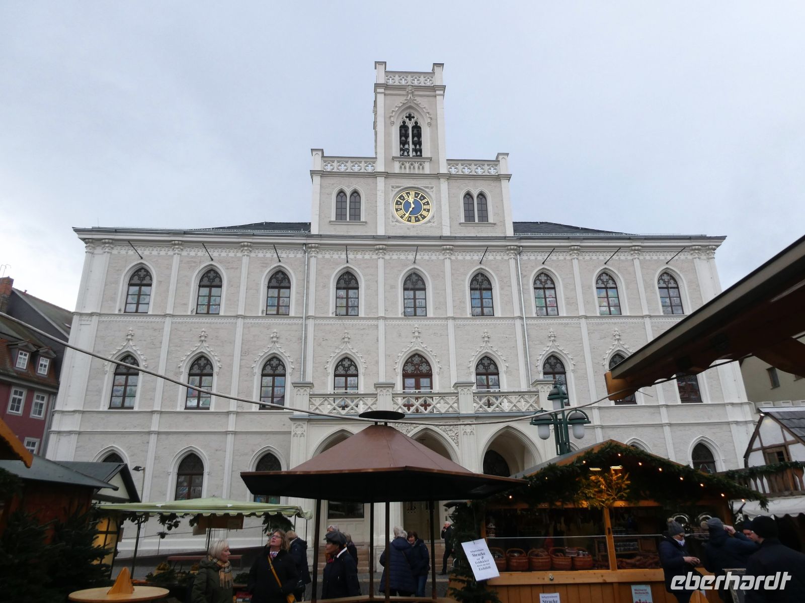 Auf dem Weg nach Weimar gibt es eine kleine Einführung in den Freistaat Thüringen und ein paar Details zu der Stadt Weimer die unser erstes Ziel heute ist. Wir hören vom „Goldenen“ und „Silbernen Zeitalter“ Weimars und der Weimarer Klassik. Viele berühmte Häupter haben hier gewirkt und einige sogar gewohnt. Die Herzogin-Amalia Bibliothek liegt auf unserem Weg und ebenfalls das Liszt-Haus und die Bauhaus-Universität Weimar. Goethes Wohnhaus, welches wir von hinten sehen können und das Haus einer seiner Freundinnen liegen auf unserer Fahrt. Vorbei am Schloss landen wir dann an unserem Busparkplatz. Von hier aus geht es zu Fuß in die Innenstadt und wir spazieren vorbei an der Stadtkirche St-Peter und Paul, die wir uns von innen anschauen. Bemerkenswert ist das Altarbild von Lucas Cranach dem Jüngeren und der Lutherschrein. Heute ist es eine evangelische Kirche. Weiter kommen wir zum Marktplatz mit dem neugotischen Rathaus und seinem bemerkenswerten Glockenspiel mit Glocken aus Meissner Porzellan. Der traditionelle Adventskalender mit echten Fenstern ist noch zu sehen.