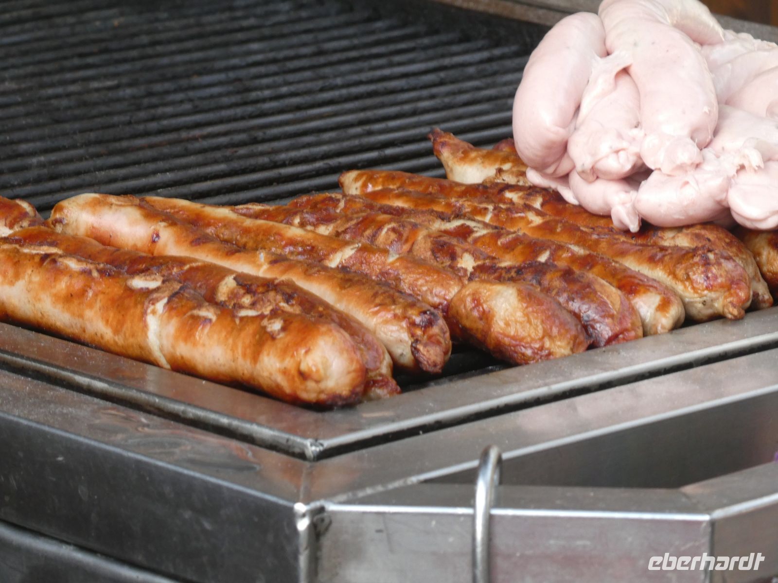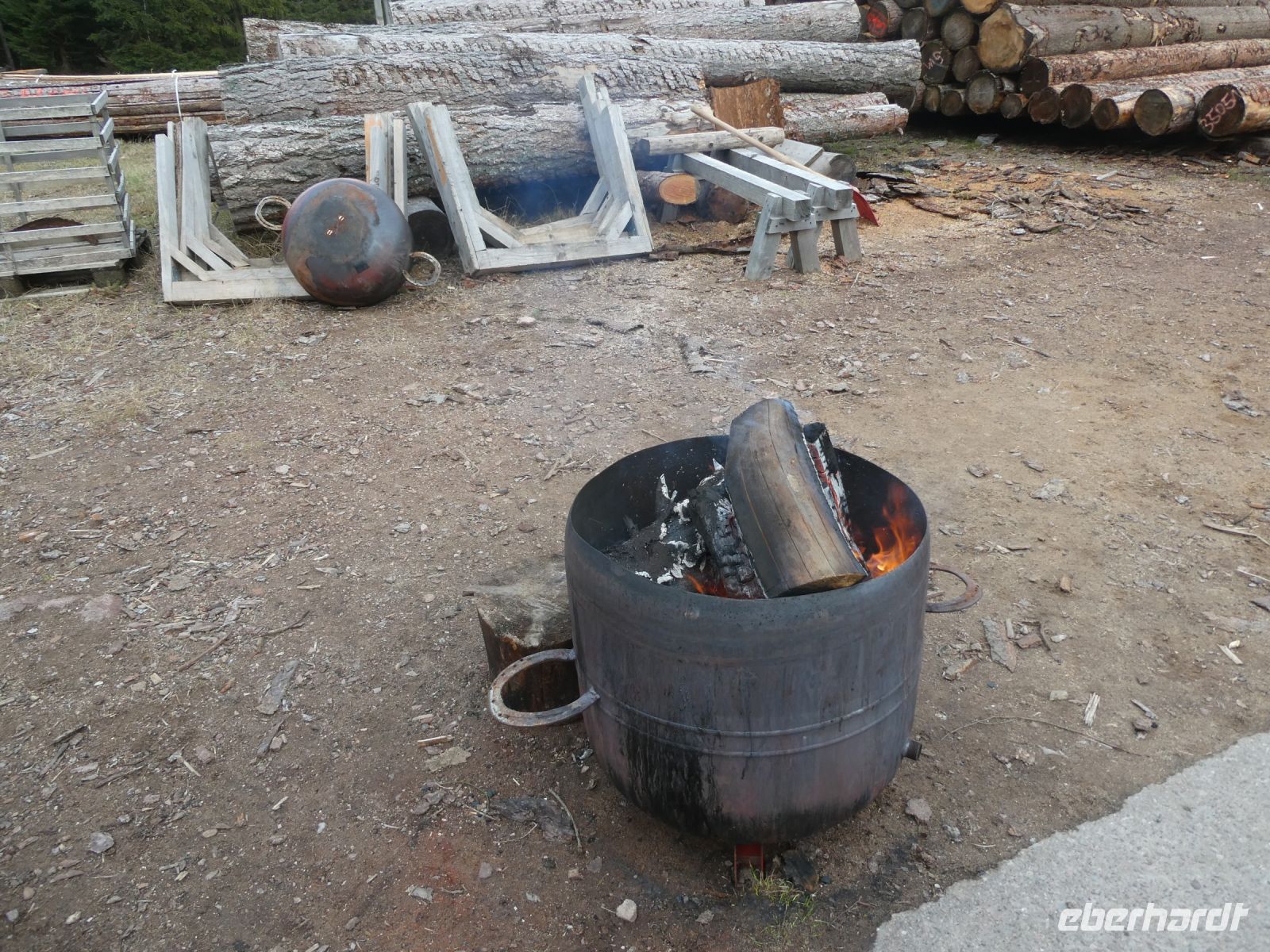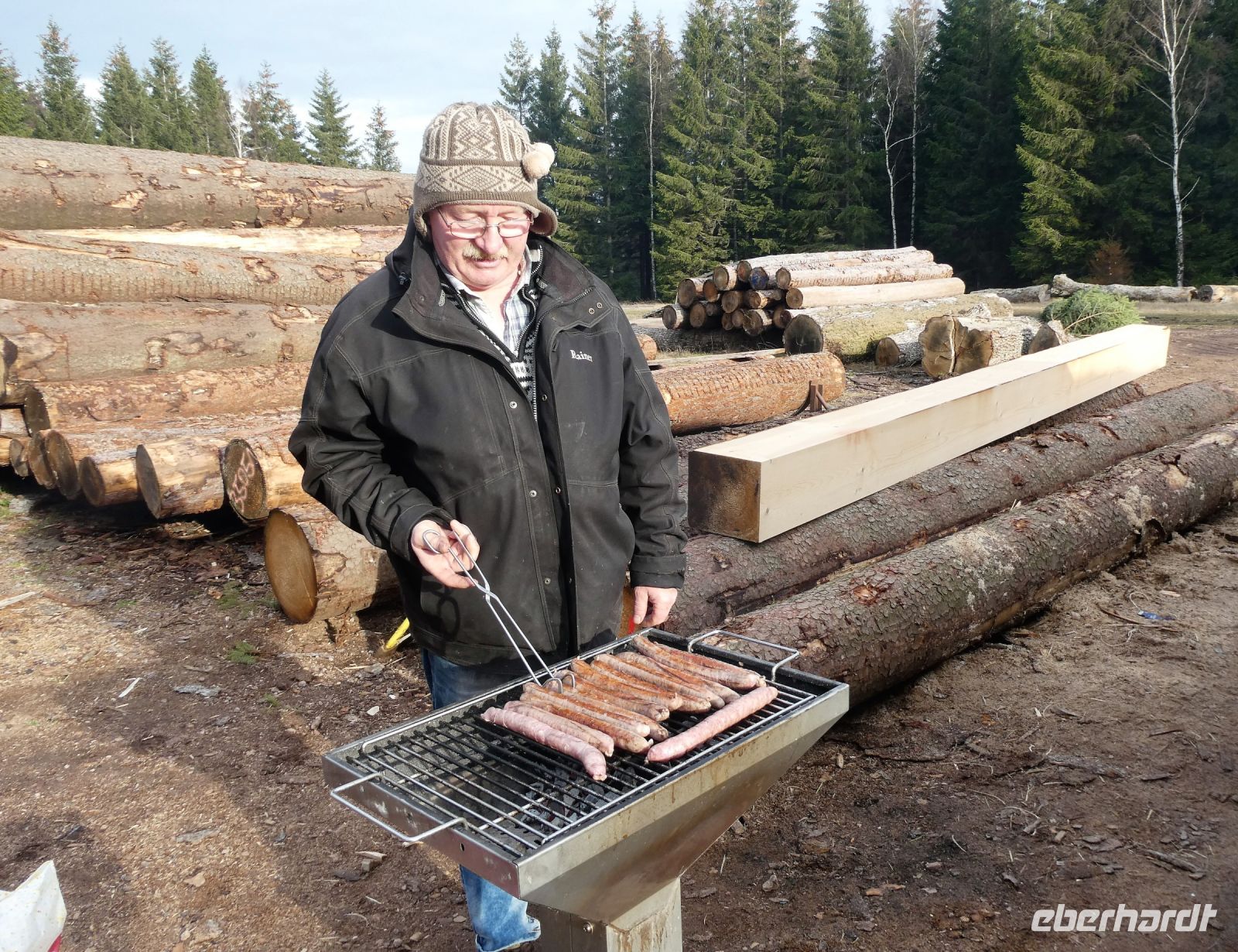 Erst geht es vom Parkplatz ein wenig durch die Stadt, dann biegen wir in den Wald, in dem Nadelbäume überwiegen, ab. Ein Hund begleitet uns. Er ist der Hund des Eigentümers des Unternehmens und kennt den Weg und die Pferde genau. Schließlich halten wir an einer Lichtung an und von einiger Entfernung sehen wir schon, dass ein Würstchengrill aufgebaut ist. Original Thüringer Rostbratwürste gibt es. Wir trinken Glühwein und bekommen von Eberhardt-Travel zur Feier des 1.Tages im neuen Jahr die Bratwurst spendiert. Es ist ja schließlich schon Mittag. Sie schmeckt gut und sie tilgt den Hunger, der sich langsam eingestellt hat. Ein Feuer ist in einer Metalltonne angezündet und gibt einige Wärme ab ….. und Rauch.