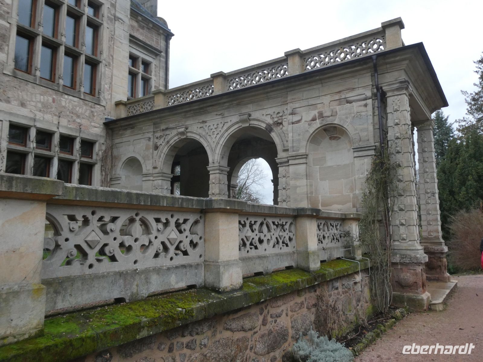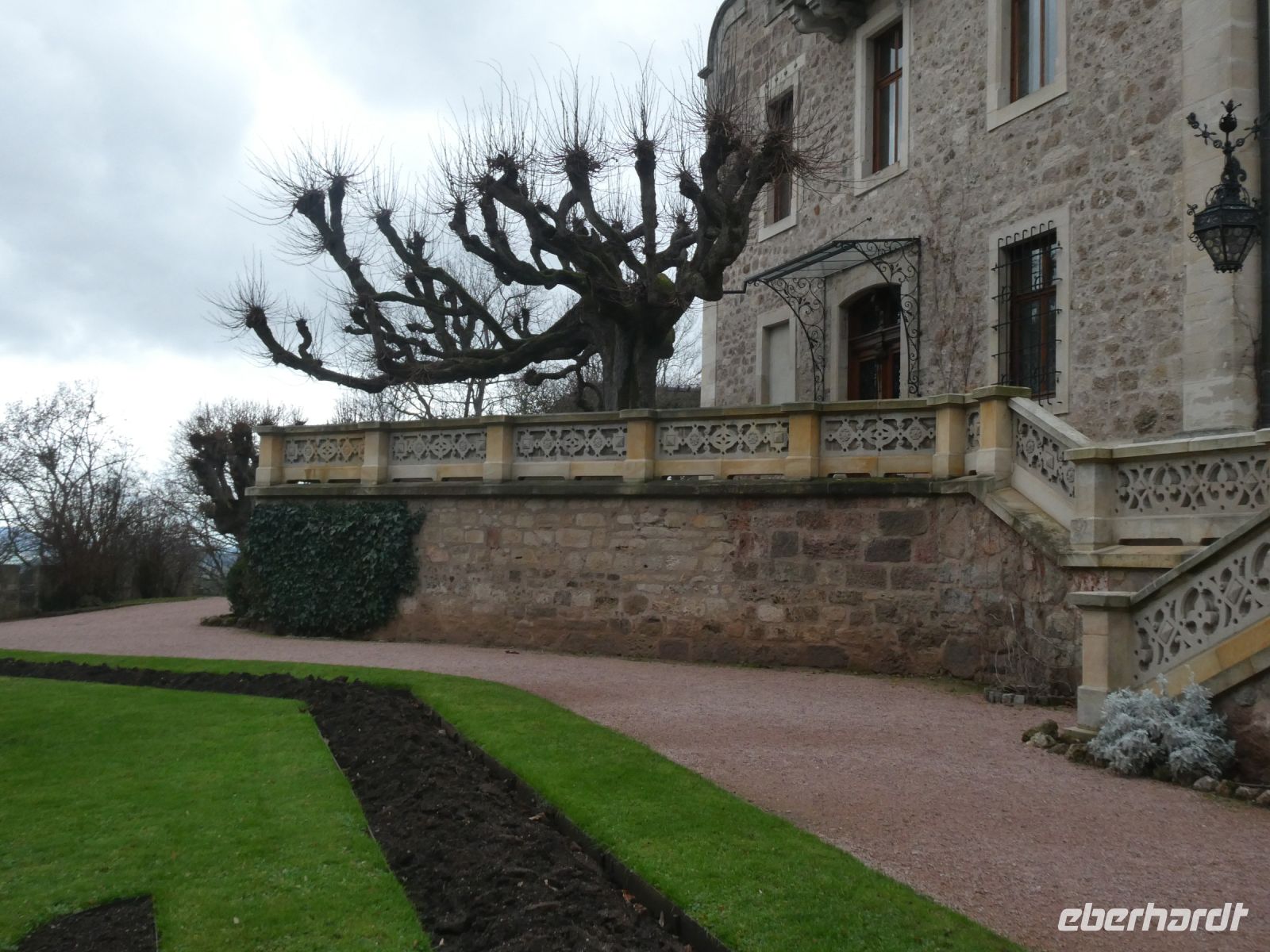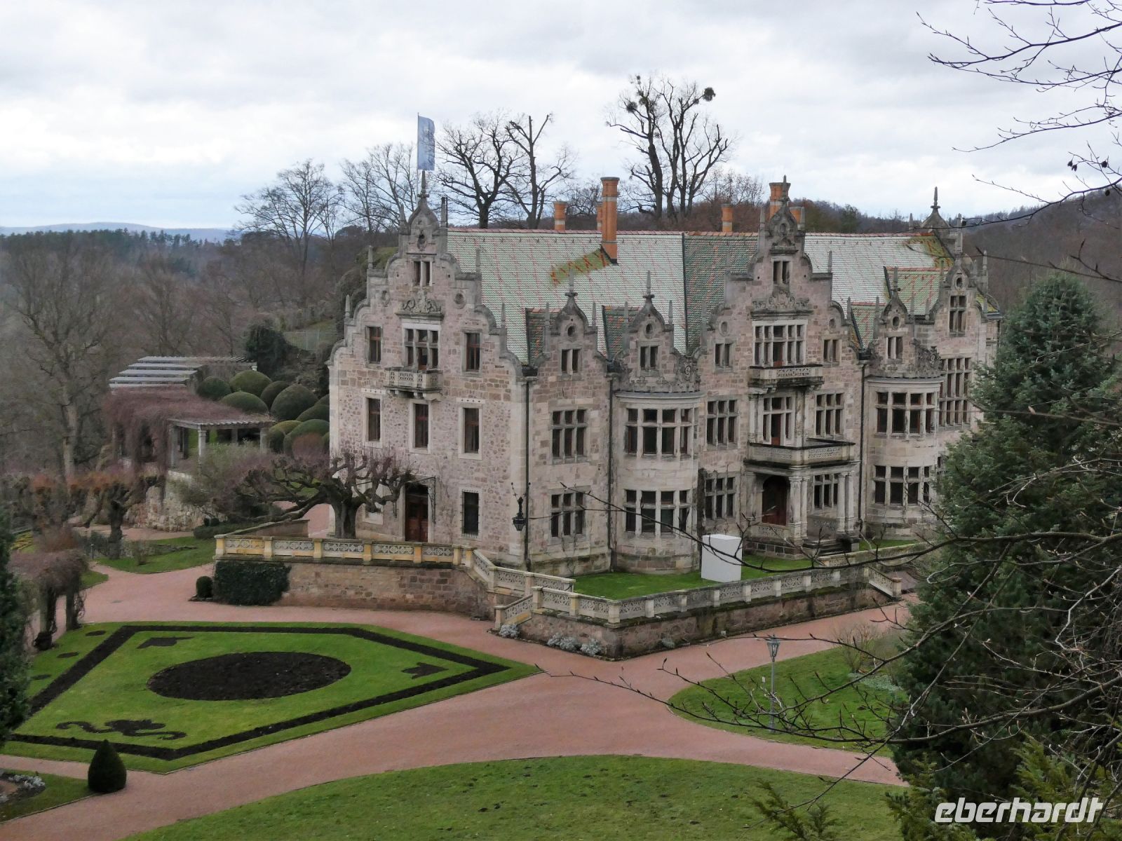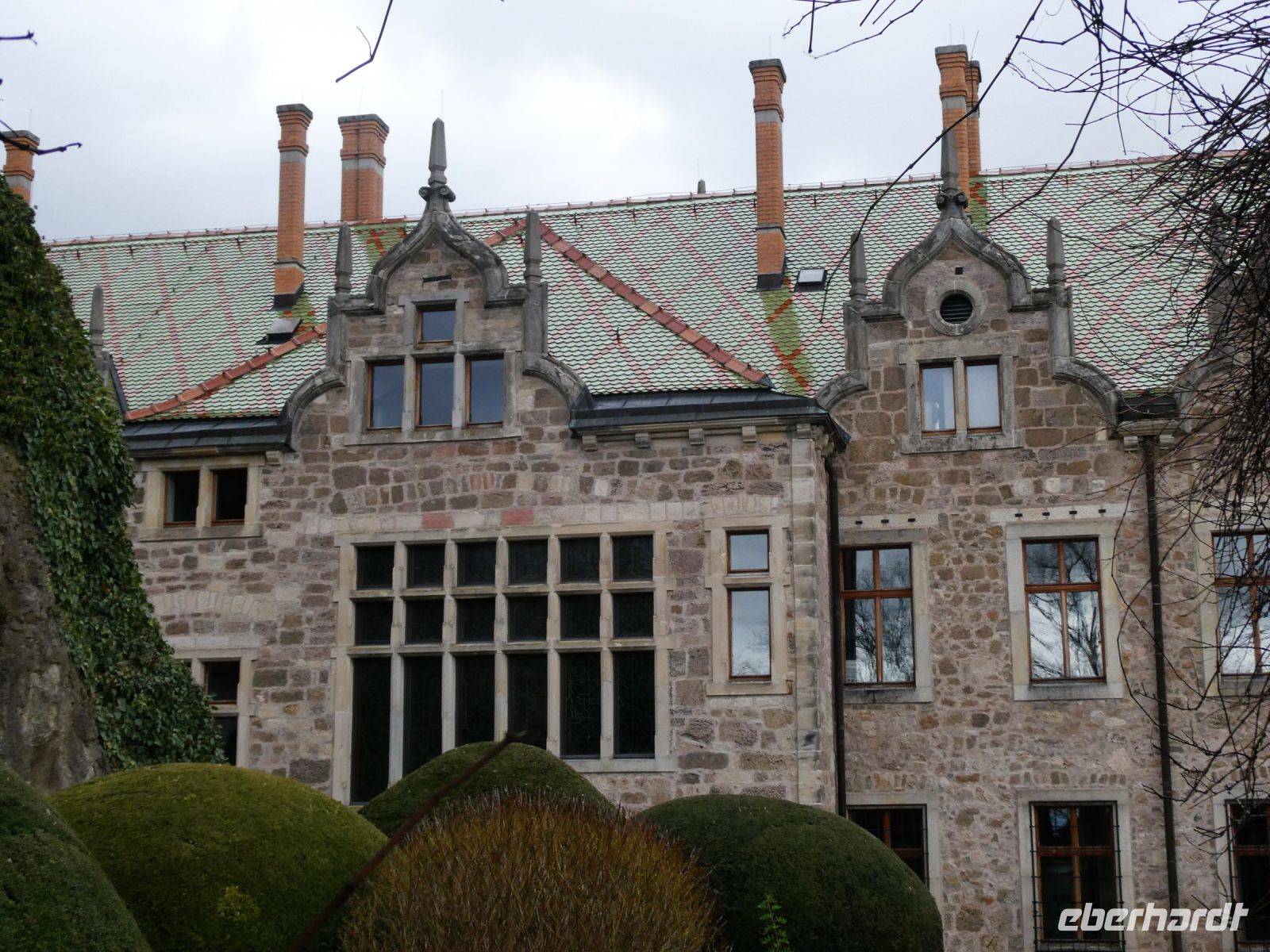 Ein wenig später geht es los und es dauert nicht lange, da haben wir die Auffahrt zum Schloss erreicht. Unsere Führerin für den Schlosspark erwartet uns schon und wir beginnen einen kurzweiligenr und spannenden Rundgang durch einen Teil dieses großen Landschaftsparks. Er ist einer der größten Parks Thüringens. Wir erfahren etwas über die verschiedenen Familienmitglieder der Herzöglichen Familie und ihre Verbindung zum Englischen Königshaus. Das Schlossgebäude im Neorenaissance-Stil sieht aus wie ein englisches Herrenhaus und der dazugehörige Park besitzt eine Vielzahl interessanter Bäume.