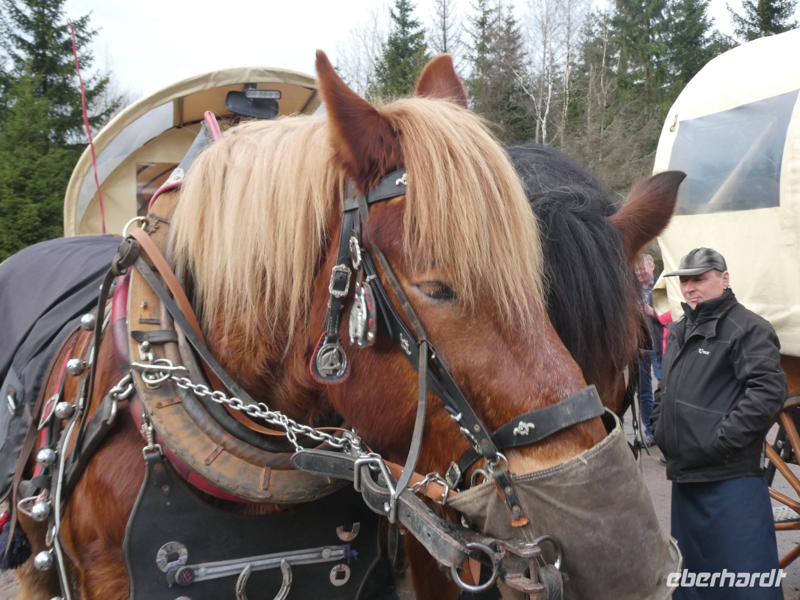 Die Pferde haben auch etwas zu fressen in ihrem Fressbeutel und lassen sich nicht stören.
