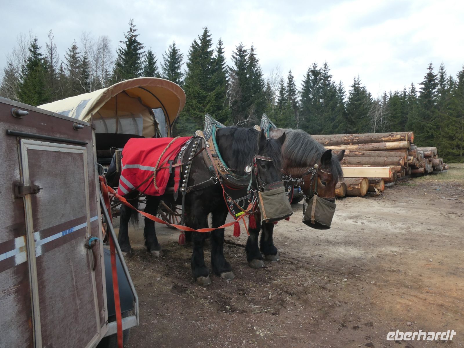 Unsere Pferdeschlitten sind heute Planwagen. Wir bekommen 2, jeweils von 2 Pferden gezogen.