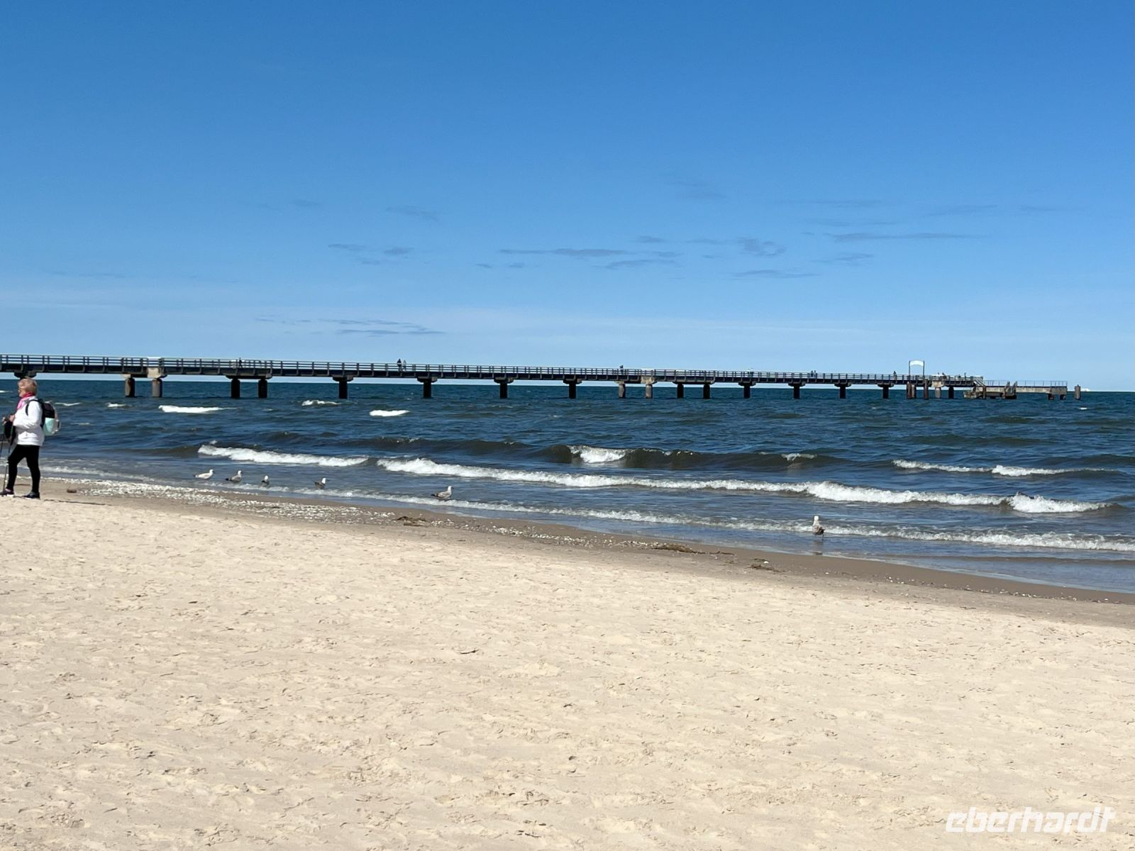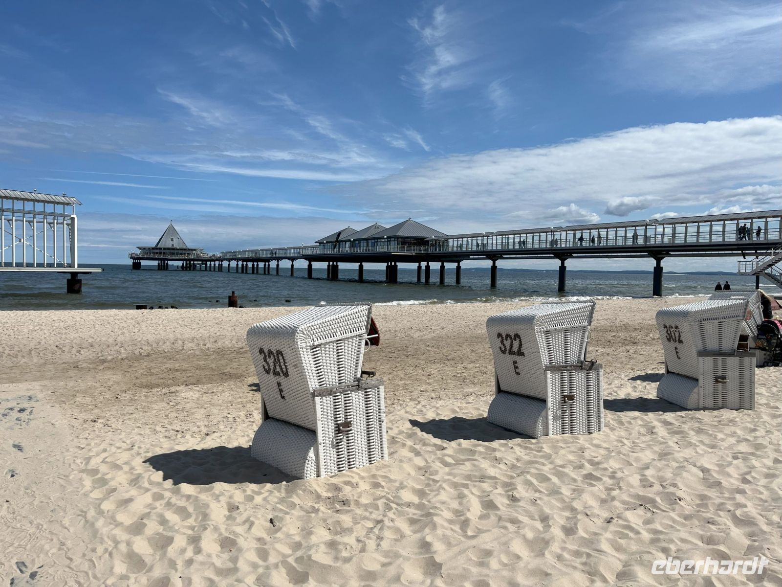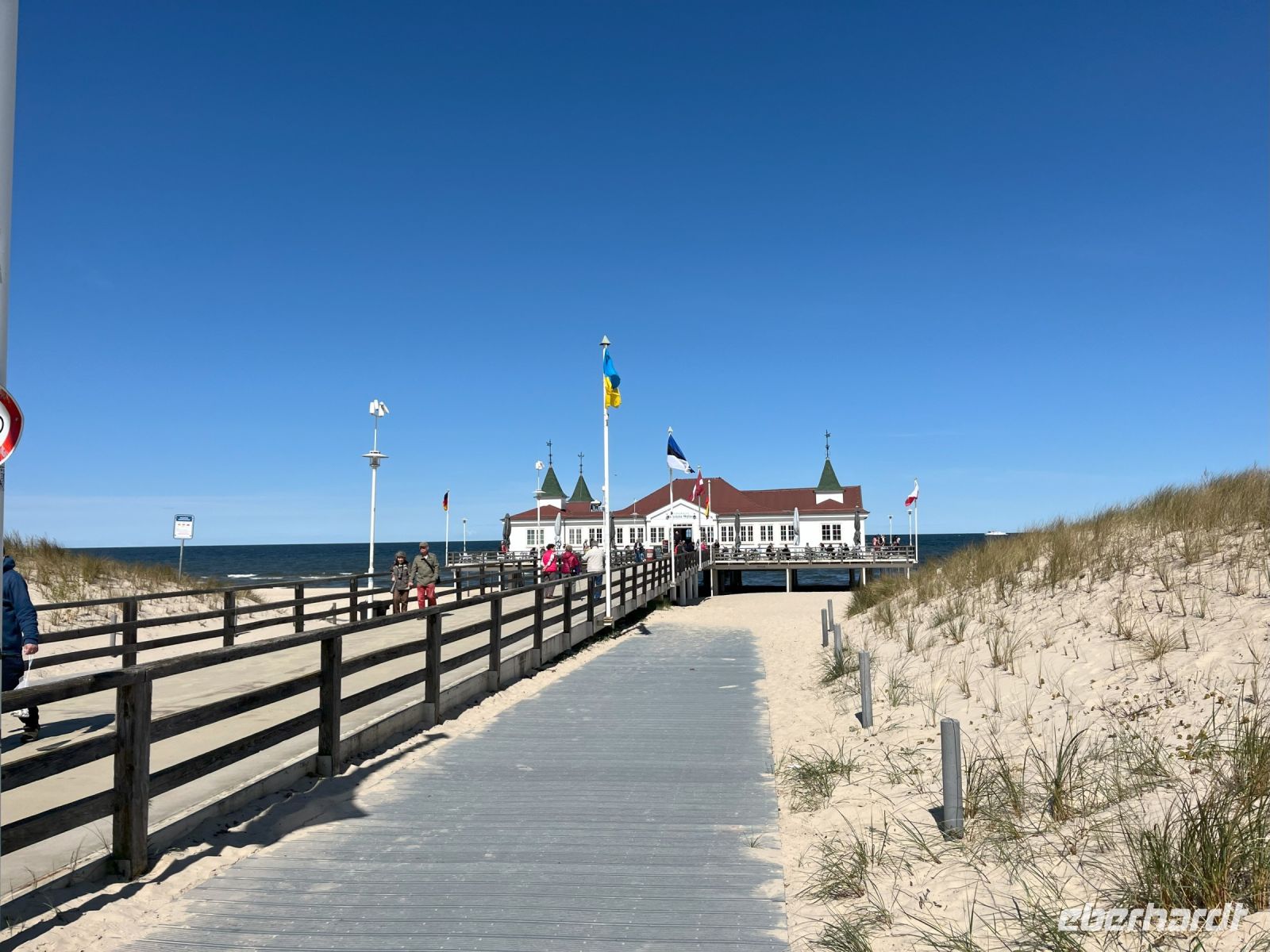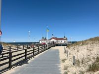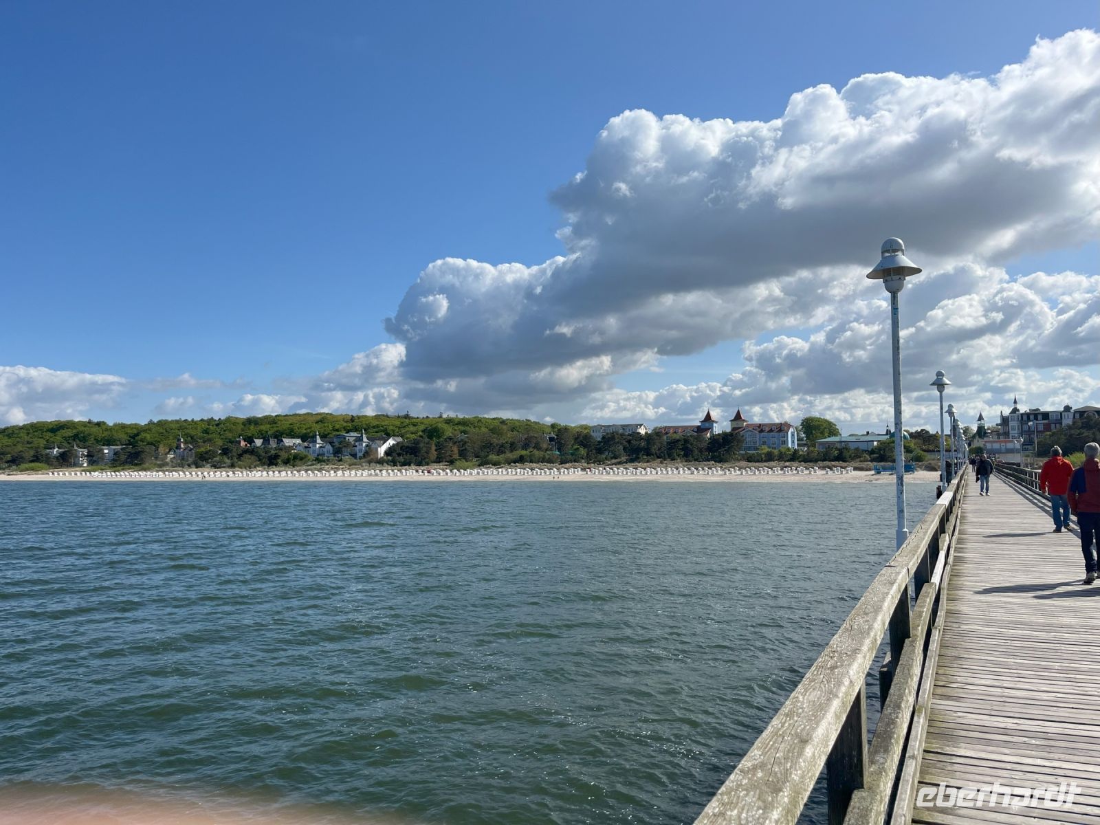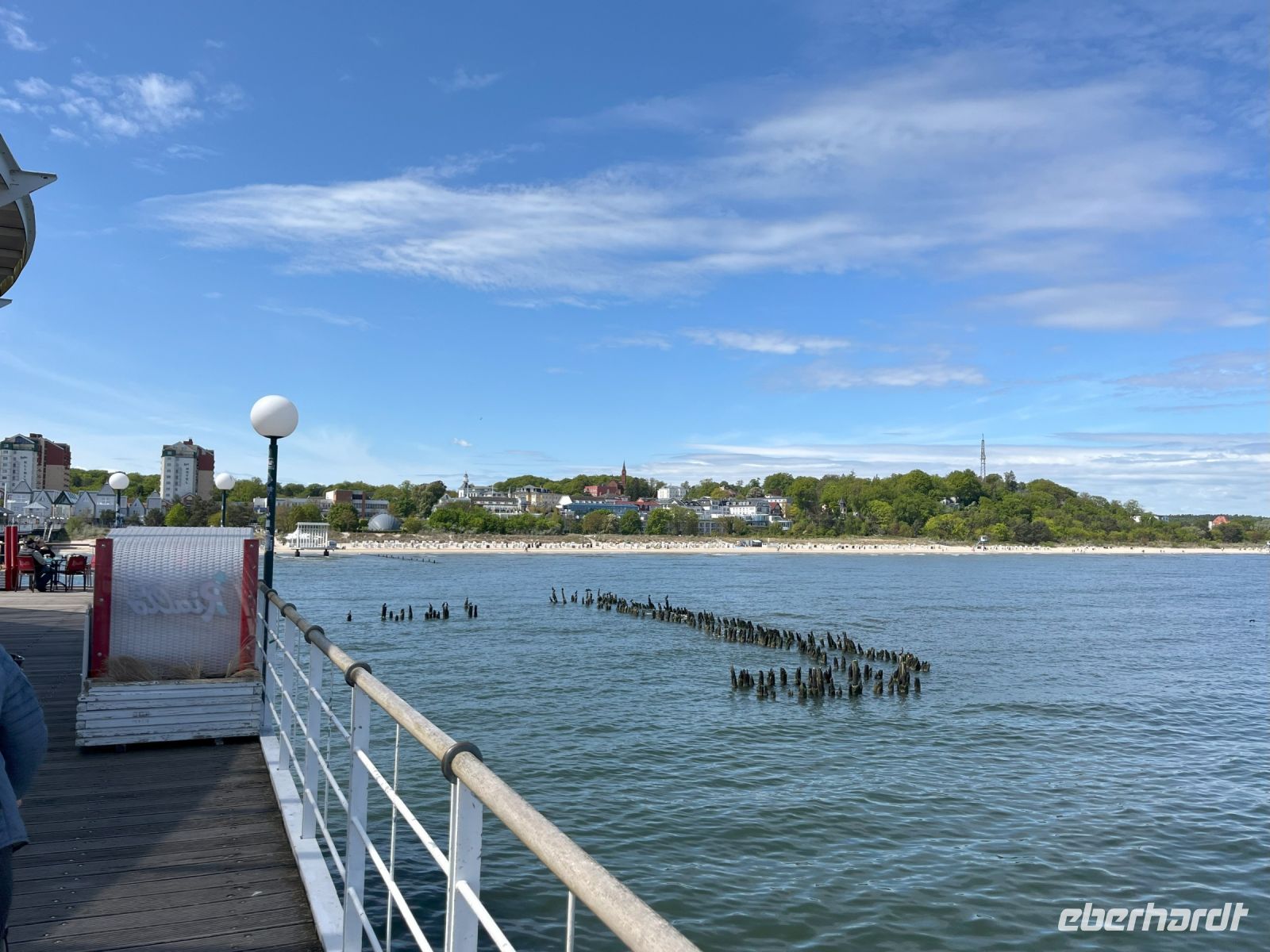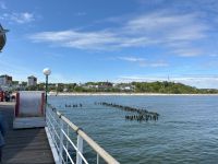 An diesem Tag begleitete uns ein Gästeführer auf unserer Rundfahrt, der mit uns zunächst nach Peenemünde fuhr, wo von 1936 bis 19045 das größte militärische Versuchszentrum Europas war. Der erste Marschflugkörper und die ersten funktionierenden Großraketen wurden hier gebaut. Wir erfuhren auch von Leben und Arbeit von dem bedeutenden Wissenschaftler Wernher von Braun. Danach fuhren wir zunächst nach Heringsdorf, um die dortige Seebrücke zu erkunden. Wir hatten eine gute Aussicht nach allen Seiten und konnten viele schöne Fotos machen. Danach fuhren wir mit dem Bus durch einige Straßen in Banin und Heringsdorf und sahen viele schöne Villen im Stil der Bäderarchitektur. Es gab viele Balkone mit Ornamenten, weiße Säulen und Türmchen auf den Häusern. Am Schluss fuhren wir noch nach Ahlbeck um die dortige schöne Seebrücke auch zu würdigen. Hier gab es ausreichend Zeit für einen Spaziergang auf der Promenade oder einen Cafebesuch.