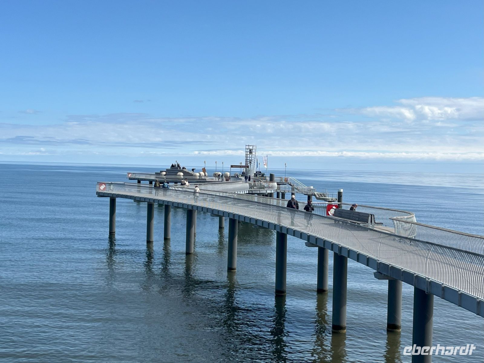 An diesem Morgen hatte unser Hotel leider einen Stromausfall. Wir wurden aber mit Frühstück auf den Zimmern gut versorgt. Nachdem die Aufzüge wieder fuhren, brachen wir nach Heringsdorf er zum Baumwipfelpfad auf Der Aufzug brachte uns in die Höhe von 23 Metern, wo der Pfad sich an den Baumkronen entlang schlängelte. Es gab informative Tafeln über die Entstehung von Usedom und die Entwicklung des Badebetriebs. Sanft führte der Pfad in Serpentinen auf den Aussichtsturm. Von dort hatten wir eine wunderbare Aussicht auf die Ostsee biss nach Swinemüne und über das Achterwasser. Am Nachmittag machten wir vom Hotel aus mit unserem Gästeführer einen Spaziergang in Zinnowitz. Wir sahen die Kirche, das Kurhaus, die Konzertmuschel und die Seebrücke mit der Tauchgondel.