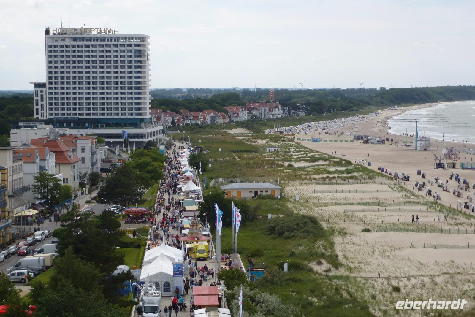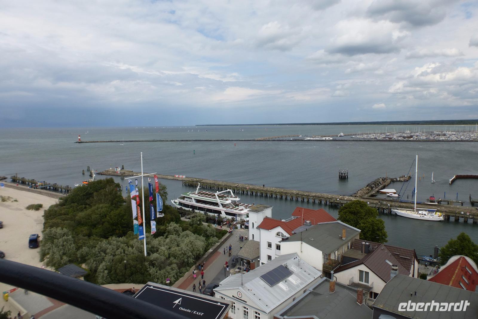 Neben dem Teepott am Beginn der Seepromenade, mit seiner gewagten Architektur der sechziger Jahre, ragt der alte Leuchtturm empor. 135 Stufen gilt es zu erklimmen, dann wird man mit einer fantastischen Aussicht belohnt. Teepott und Leuchtturm sind die Wahrzeichen Warnemündes. Nachmittags gibt es hier Konzerte und allerlei Veranstaltungen.