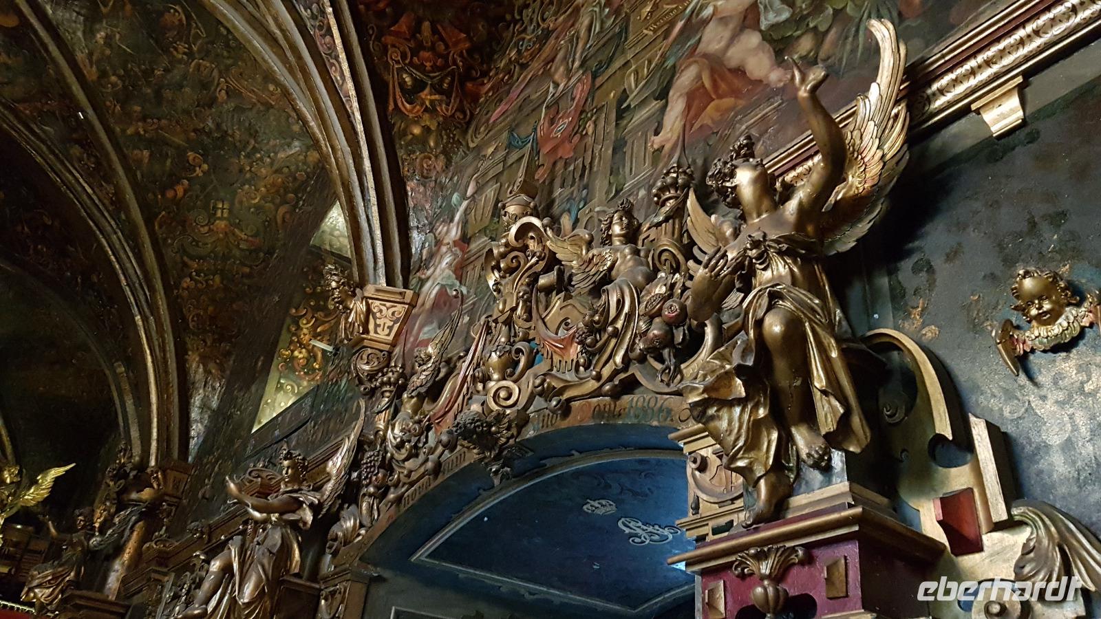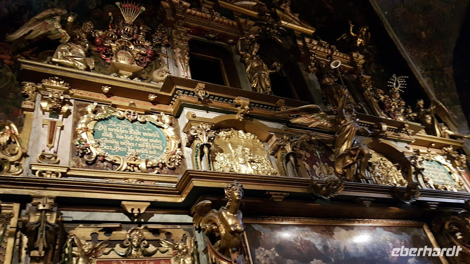 gleich in Augenschein nehmen. Dies ist Stammsitz der Fürsten zu Schaumburg Lippe , wurde um 1300 als Wasserschloß errichtet und schließlich Mitte des 16. Jahrhunderts zum Schloß Bückeburg umgebaut, heute stehen die Kavaliershäuser zu Seiten des Schlosses, zur Anlage gehören der Marstall und das drittgrößte Mausoleum der Welt, Museen und Gartenanlagen. Bei einer Führung konnten wir auch die aufwändig sanierte Kapelle besuchen: was für eine Pracht! Noch heute wohnt hier der Prinz von Schaumburg-Lippe, ihm stehen mehrere hundert Zimmer zur Verfügung, einige davon konnten wir während unserer Schloßführung ansehen. Danach war etwas Zeit zum individuellen Erkunden bevor wir im Schloßcafe ein leckeres Mittagessen genossen. Weiter ging unsere Fahrt nach Hessisch Oldendorf, besser gesagt zur