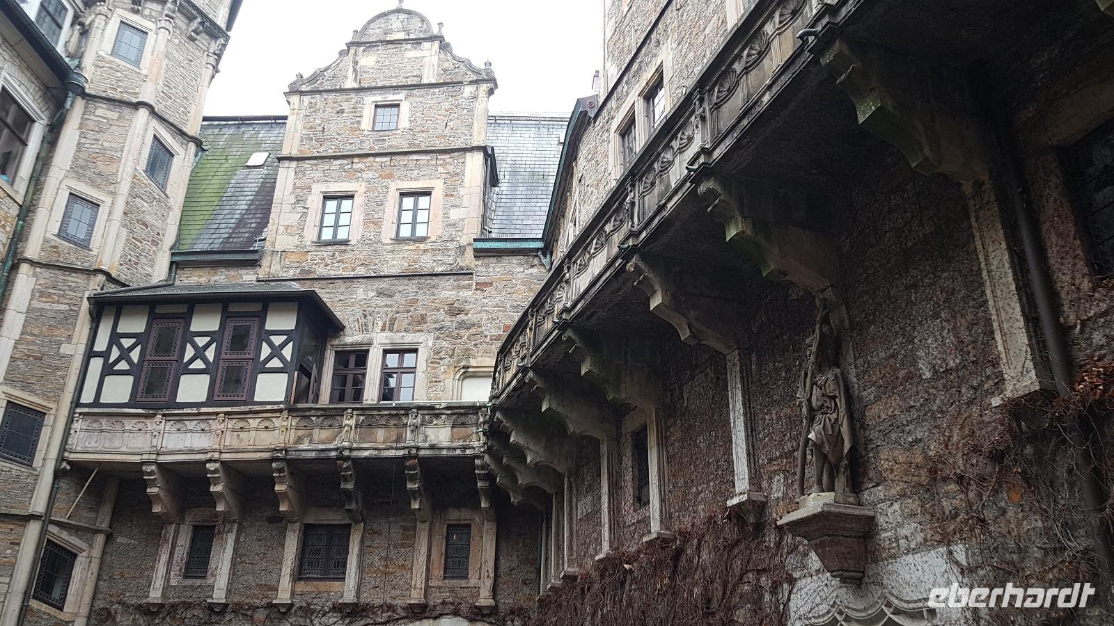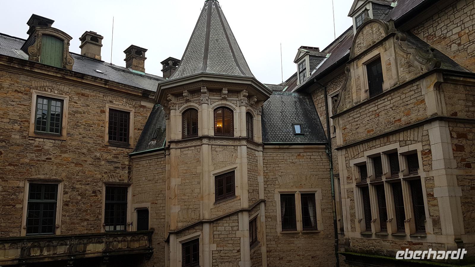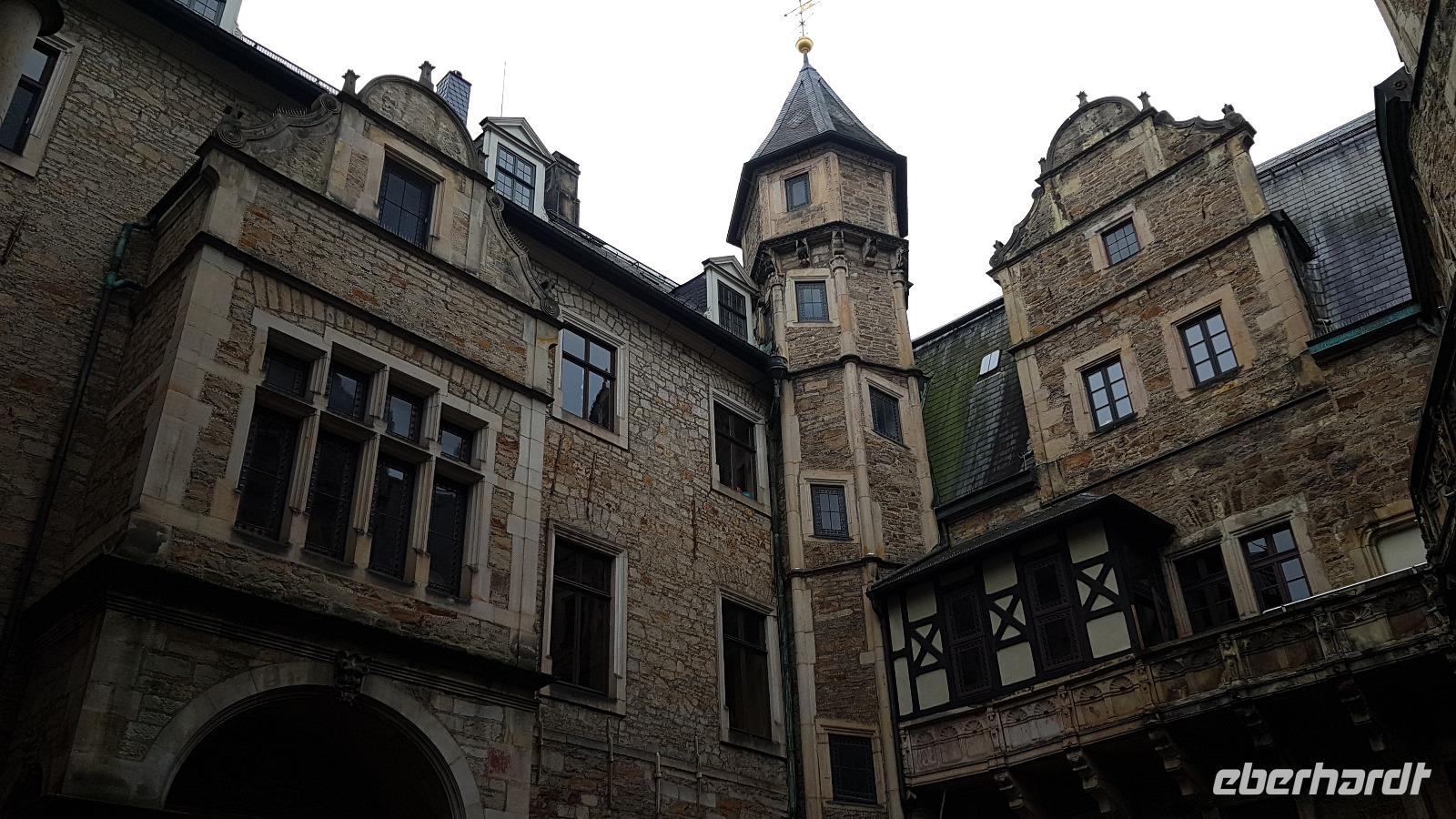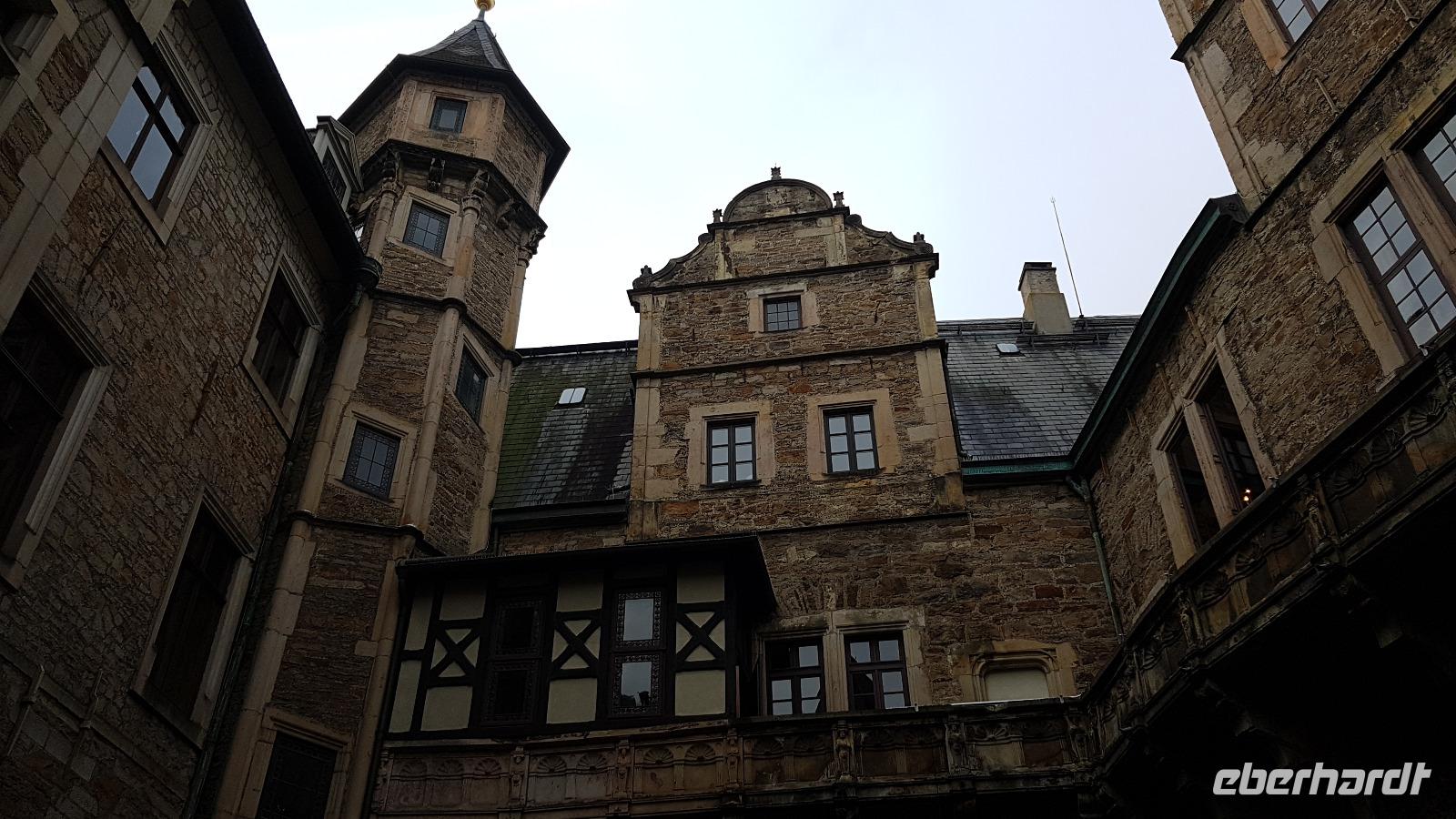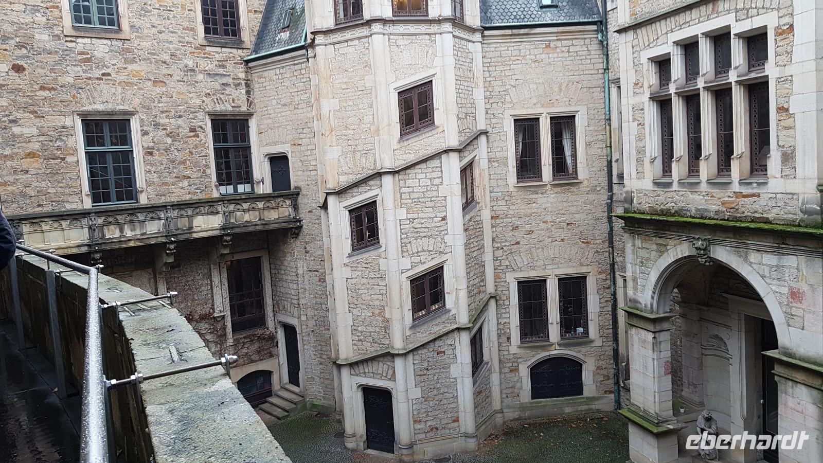 Heute fahren wir vom südlichsten Ende des Weserberglandes an das nördlichste: das Schloß Bückeburg ist unser Ziel. Wir folgen der Weser nach Norden und erfahren, das viele historische Gebäude hier im sogenannten Weserrenaissance-Stil erbaut sind, d.h., sie wurden nach der Reformation errichtet und haben die Barockzeit ziemlich "unbeschadet" überstanden, Merkmale wir die schrägen Fenster in den 8-eckigen Türmen konnten wir im
