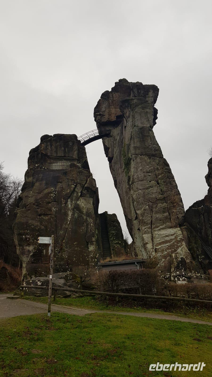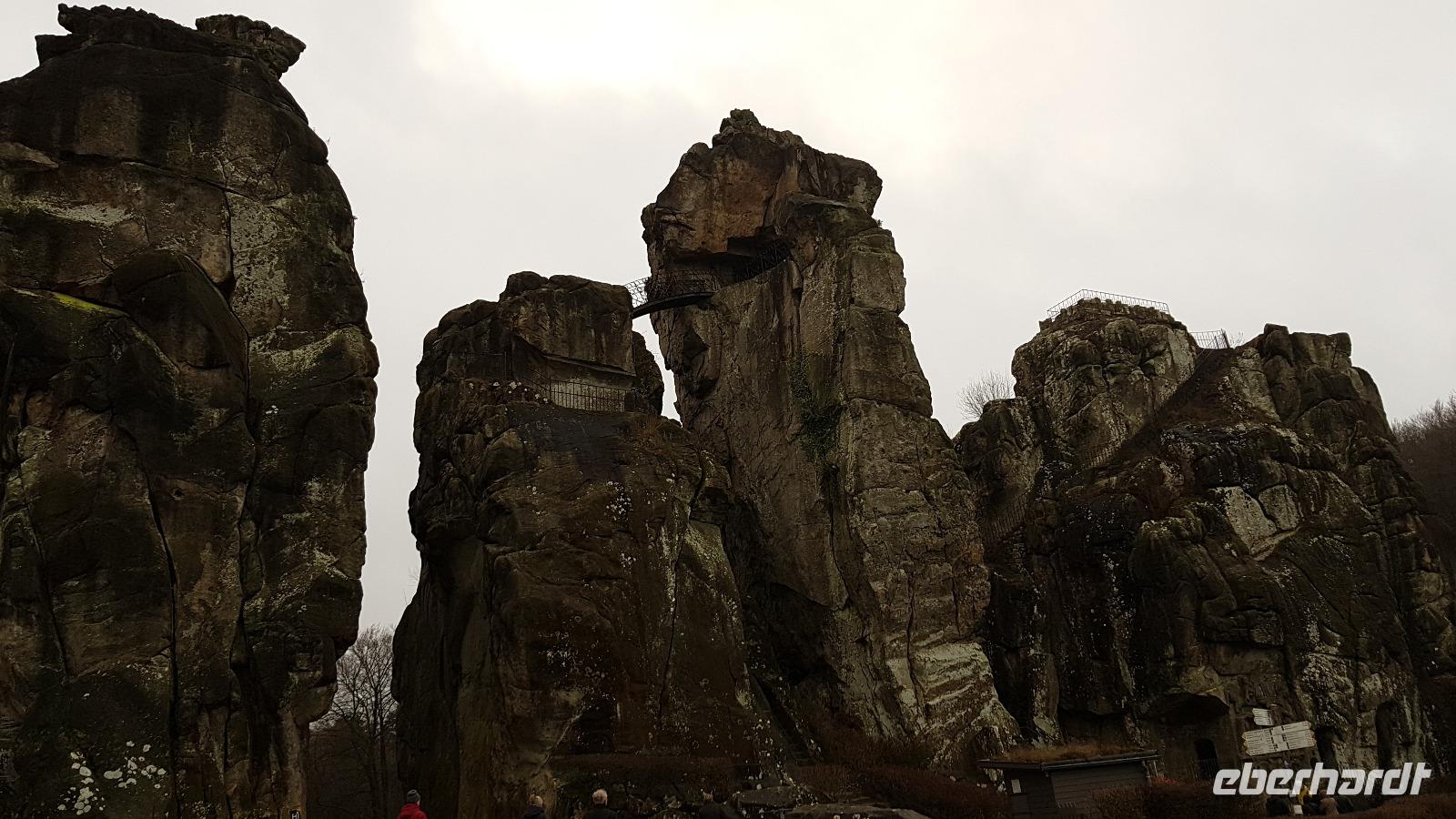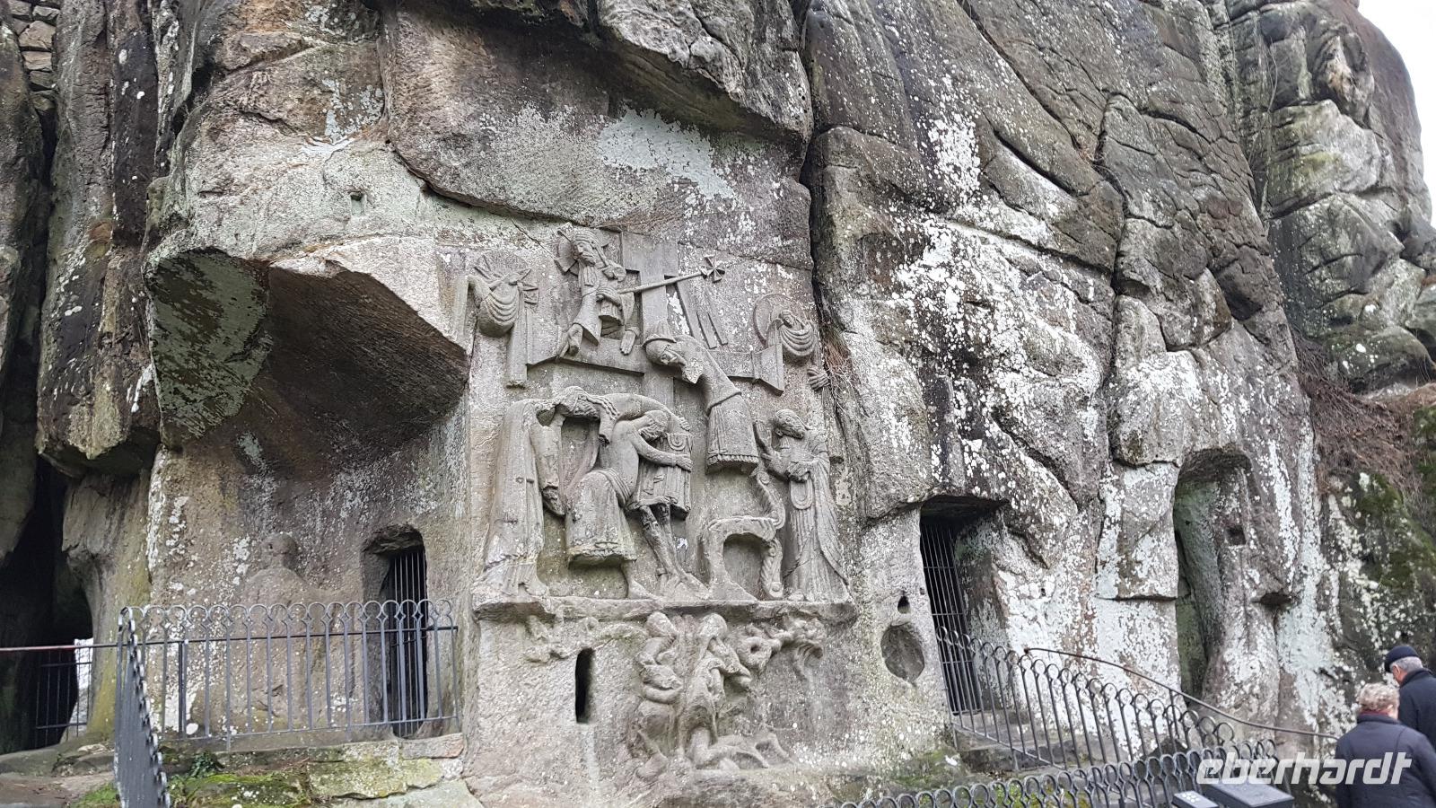 war dann unser erster Halt. 40 Meter ragen hier Felsformationen aus Sandstein in den Himmel, die Grottenanlage soll mittelalterlich sein und das Felsrelief ebenfalls- war es eine ehemals heidnische Stätte, die christianisiert wurde oder eine Nachbildung heiliger Orte in Jerusalem? Wir wissen es nicht, aber die rätselhaften Anlagen faszinieren. Einige zieht es hinauf auf die Aussichtsplattform, die hier im 19. Jahrhundert eingebaut wurde. Die Aussicht ist getrübt, der Niesel lässt gerade erst nach und die Wolken beginnen aufzureißen- zu früh für eine schöne Aussicht, trotzdem lohnend. Weiter geht unsere Fahrt zum berühmten