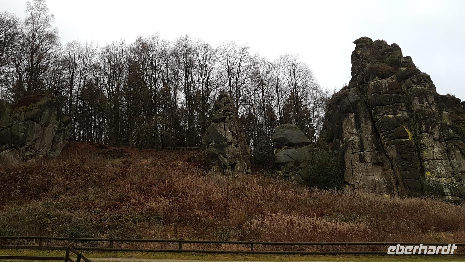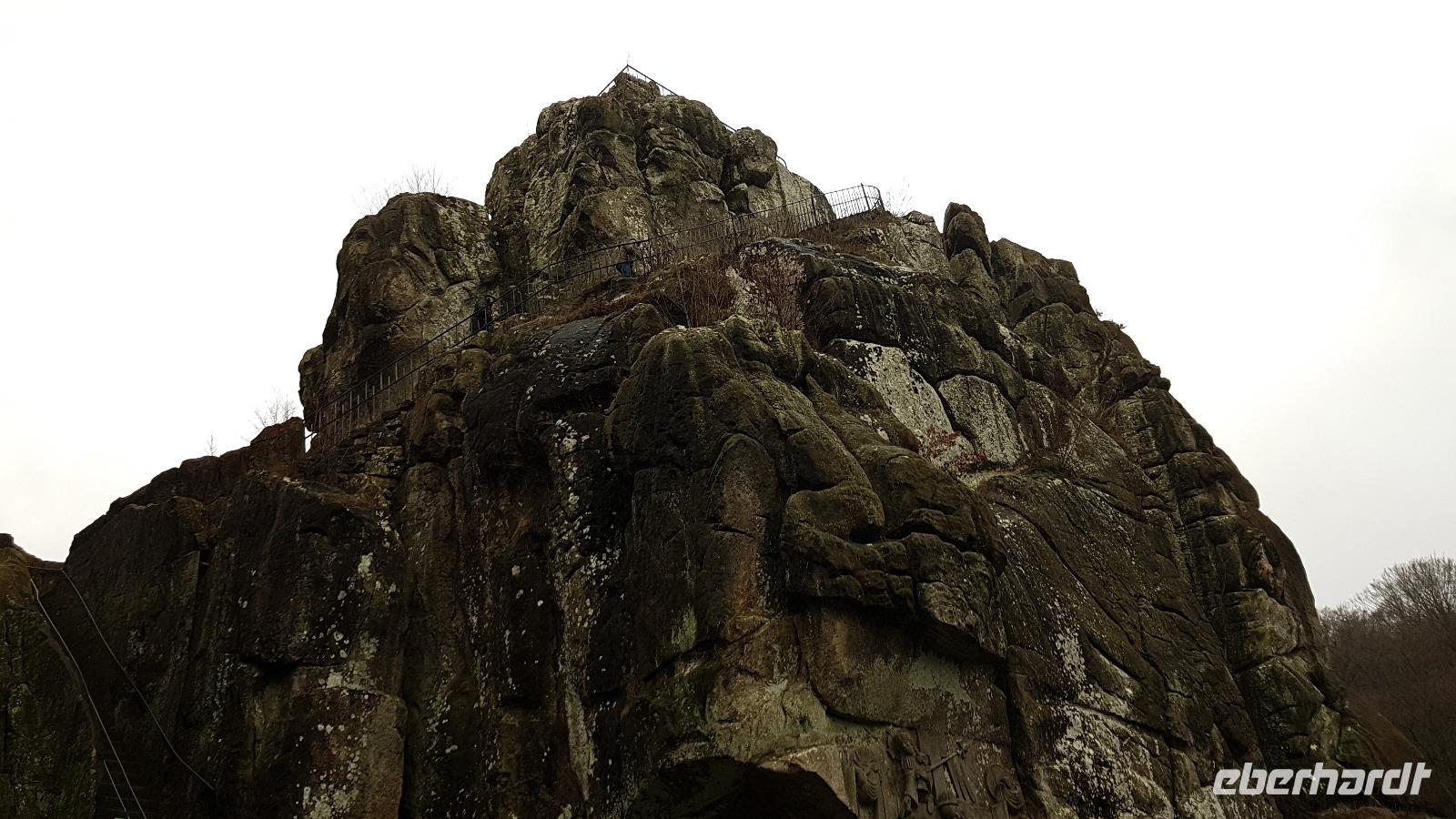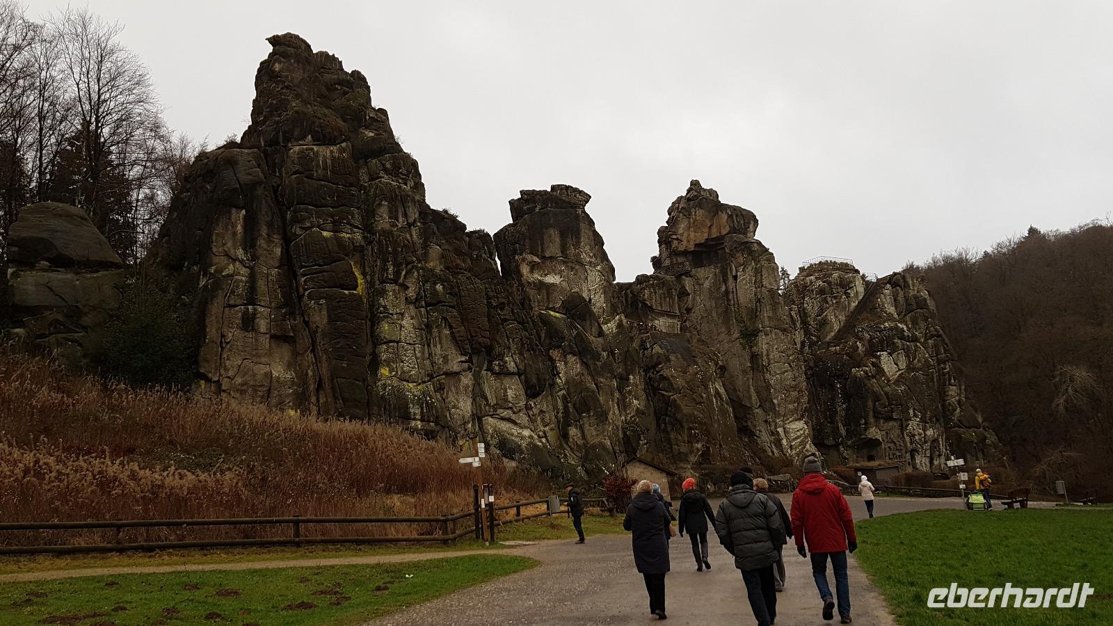war dann unser erster Halt. 40 Meter ragen hier Felsformationen aus Sandstein in den Himmel, die Grottenanlage soll mittelalterlich sein und das Felsrelief ebenfalls- war es eine ehemals heidnische Stätte, die christianisiert wurde oder eine Nachbildung heiliger Orte in Jerusalem? Wir wissen es nicht, aber die rätselhaften Anlagen faszinieren. Einige zieht es hinauf auf die Aussichtsplattform, die hier im 19. Jahrhundert eingebaut wurde. Die Aussicht ist getrübt, der Niesel lässt gerade erst nach und die Wolken beginnen aufzureißen- zu früh für eine schöne Aussicht, trotzdem lohnend. Weiter geht unsere Fahrt zum berühmten