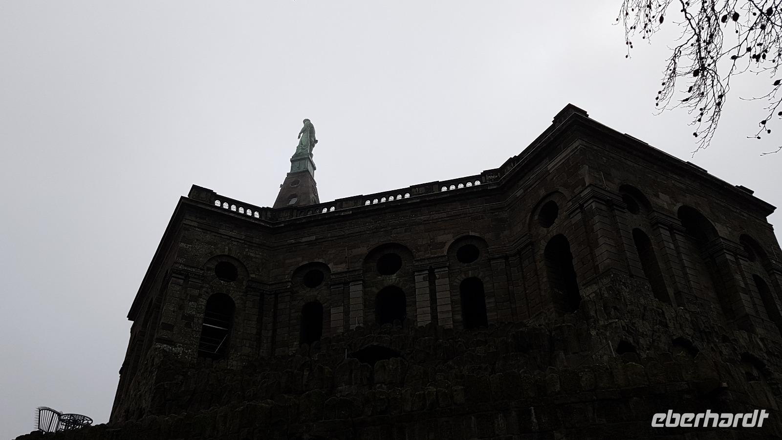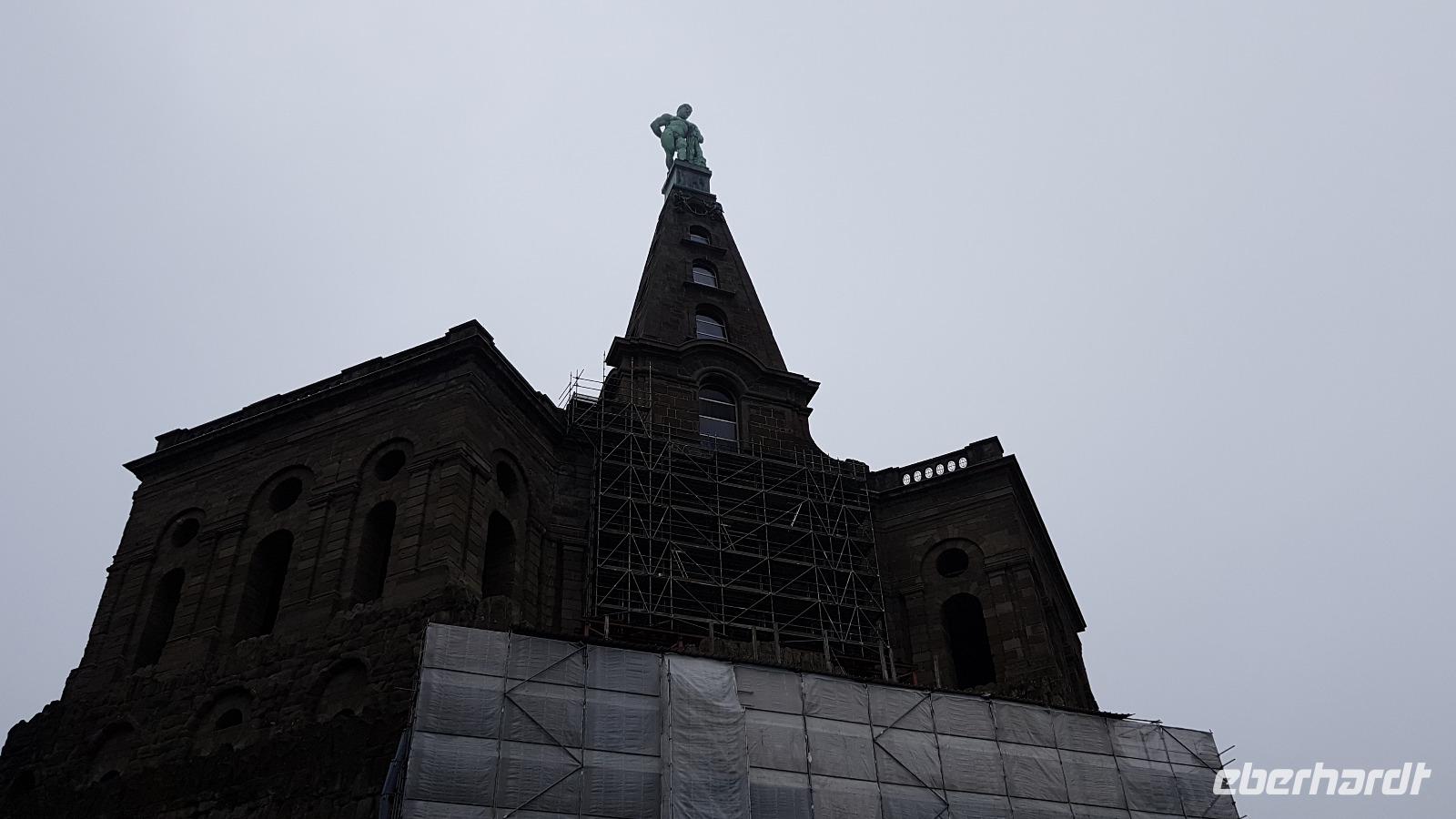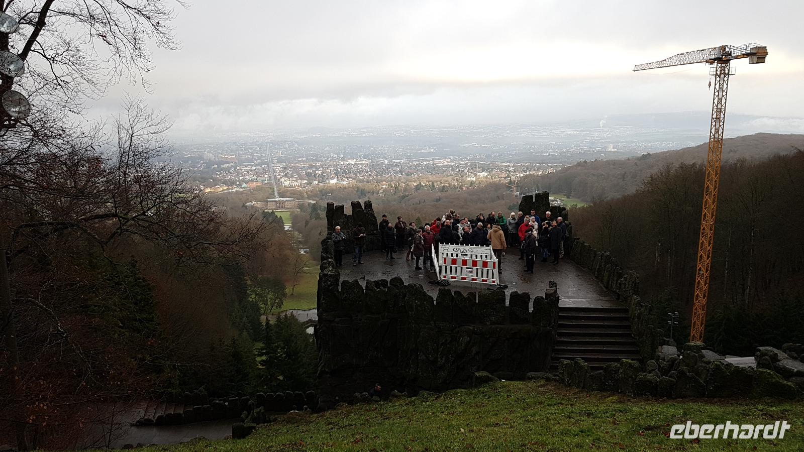 wir fahren ganz hinauf und haben Glück: Heute fährt der Shuttle-Bus nicht, da können wir uns mit unserem Bus oben hinstellen. Das gesamte Areal wurde aufwändig saniert in den zurückliegenden Jahren, erst seit Sommer diesen Jahres ist es wieder öffentlich zugänglich. Wir stärken uns kurz vom Bordservice und starten dann eine individuelle kleine Erkundungstour zum Denkmal. 1896 wurde es zu Ehren Kaiser Wilhelm I. errichtet und mit der letzten Sanierung sind unglaublich interessante Ausstellungen und Plattformen dazugekommen. Hier müßten wir mehr Zeit haben, genießen aber trotzdem den Ausblick von hier oben in 281 Metern über NN. Ganz in der Nähe befindet sich auch die Wittekindsburg, hier gab es bis 1938 eine Quelle, die eingefasst wurde und über der ein Hufeisen angebracht worden war. Nach einer Überlieferung wollte sich der heidnische Sachsenherzog Widukind nicht Kaiser Karl dem Großen beugen, der das Land christianisieren wollte, er verlangte einen Beweis für die Macht dieses Glaubens. Da soll sein Pferd mit den Hufen gescharrt haben und eine Quelle ans Tageslicht gebracht haben, eben jene in der Wittekindsburg. Durch dieses Quellwunder soll Widukind so beeindruckt gewesen sein, dass er das Knie beugte vor Karl dem Großen und sich unterwarf. "Diese Burg soll nun "min und din" (mein und dein) sein, bot Widukind an und Karl der Große soll erwidert haben:"So trage sie auch den Namen Min-din". So kam die Stadt