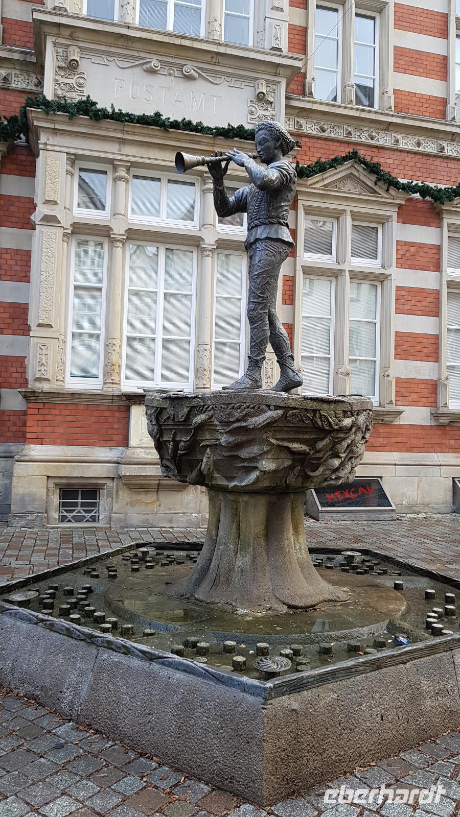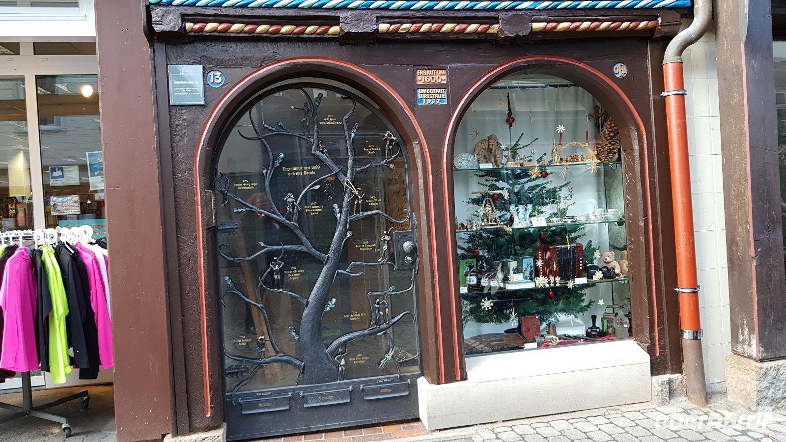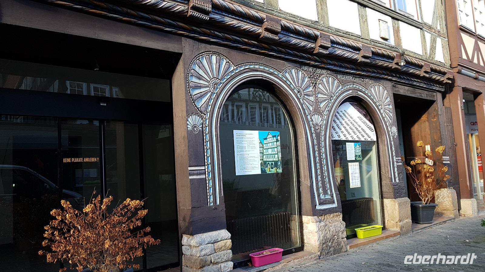 Hier konnten wir ein wenig spazieren und einen Kaffee, Tee oder Cappucchino von der Bordküche genießen. An der Mühlenbrücke trafen wir unsere Stadtführerinnen und wieder teilten wir uns in 2 Gruppen auf. Auf unterhaltsame Art und Weise lernten wir so Hann Münden kennen, Hintergründe so mancher Redensart, warum es z.B. heißt "dass sich die Balken biegen" und auch vieles über das Engagement der Bürger hier für den Erhalt ihrer Fachwerkhäuser. Hann Münden wurde während der Kriege gott sei dank nicht geschleift, d.h. es wurden beim Abzug der Truppen keine Brände gelegt. Trotzdem mußte die Bevölkerung in den Kriegen des Mittelalterns viel Leid erfahren. Weil sie sich nicht ergaben gab Tilli den Befehl, 3 Tage lang zu plündern und zu morden- wie entsetzlich. Mehr als 800 Bürger der Stadt wurden bestialisch ermordet, die Weser färbte sich rot von ihrem Blut. Dass der Wehrturm oberhalb der Stadt Tilli Schanze heißt hat nicht mit ihm zu Ehren zu tun- vielmehr soll es an seine Greueltaten erinnern. Natürlich besuchten wir auch das Grab eines berühmten Mannes des Mittelalters: Dr. Eisenbart. Er starb hier und im Sommer erinnert immer samstags eine "kleine Sprechstunde" des Dr. Eisenbart auf unterhaltsame Weise an ihn. Wir konnten auch einen kleinen Blick in die umgewidmete Kirche werfen, die hier ein neues Haus des Gebetes mit einem Cafe werden soll und auch im prächtigen Rathaus konnten wir den großen Saal bestaunen. Gerade rechtzeitig standen wir wieder vor dem Rathaus um das Glockenspiel mit einem Figuren-Auszug einer Behandlung des Dr. Eisenbart zu sehen. Begeistert sangen alle das bekannte Spottlied mit. Die ganze Zeit begleitete uns strahlender Sonnenschein, aber es war doch empfindlich kalt und teilweise windig, so nutzten alle die verbleibende Freizeit um sich in einem Cafe oder Restaurant einen Grog oder heißen Tee zu gönnen. Schließlich war es Zeit für den