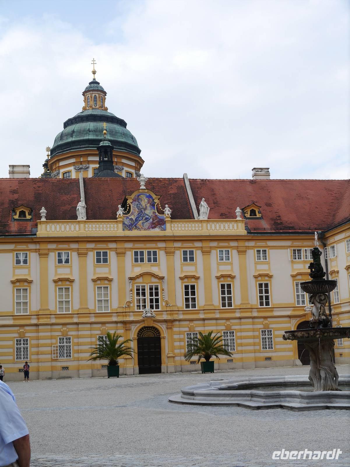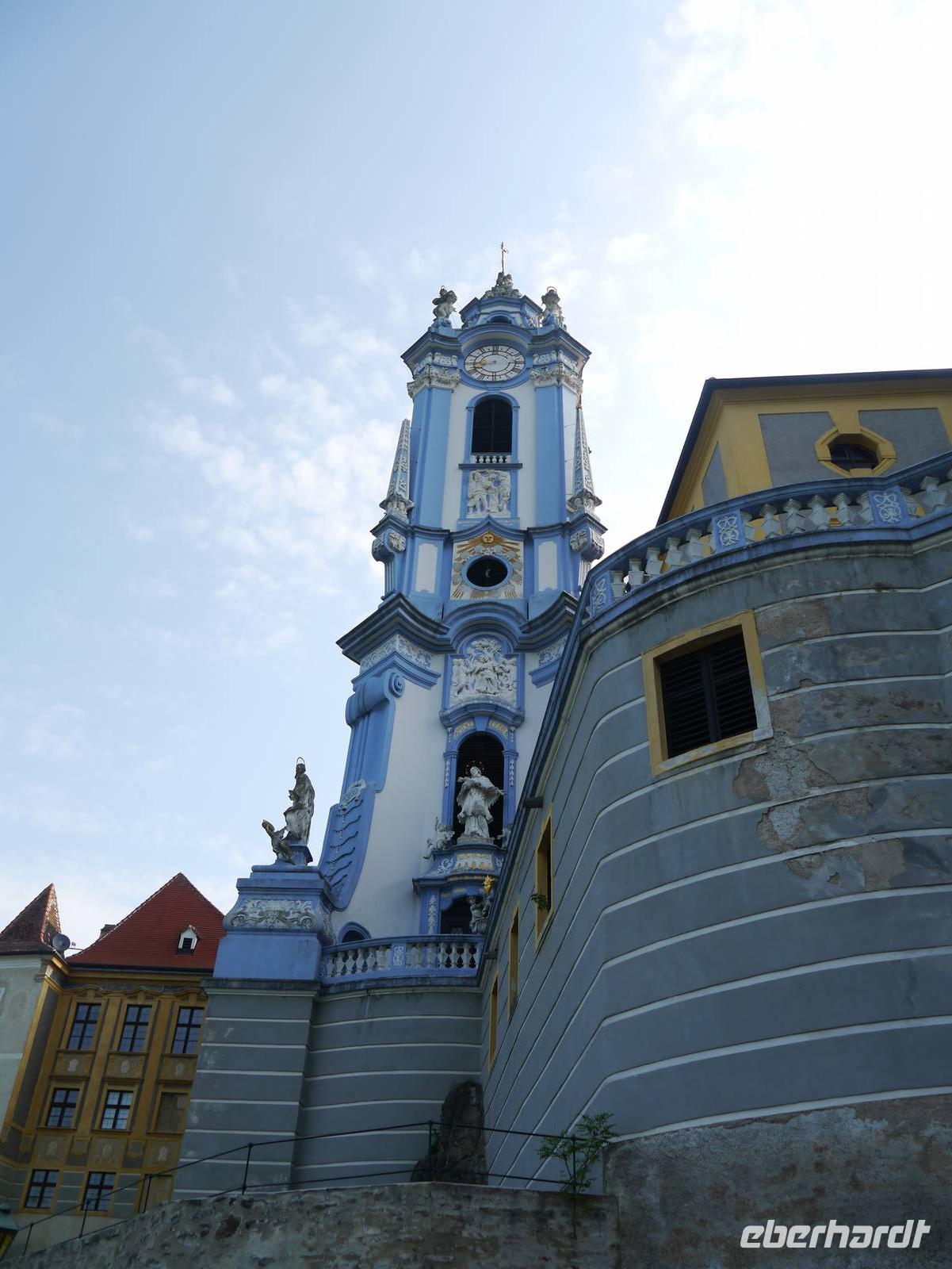 Am frühen Morgen legt die MS Rossini in Dürnstein an. Für alle Gäste, die den Ausflug in die Wachau gebucht haben, heißt es zügig von Bord zu gehen. Denn nur kurze Zeit später legt unser Schiff wieder ab, um uns weiter flussaufwärts wieder einzusammeln. Dürnstein ist umgeben von Weinterrassen. Die in heiterem Blau und Weiß strahlende Stiftskirche lugt hinter den Häusern hervor. Über dem barocken Städtchen thront die Kuenringerburg, in der im 12. Jahrhundert der englische König Richard Löwenherz gefangen gehalten wurde. In den schmalen Gassen laden Souvenirläden zur Verkostung und zum Kauf der vielseitigen Produkte aus Marillen ein. Es scheint, als könne man alles aus dieser Frucht herstellen: Marillenmarmelade, ~likör, ~seife, ~schokolade, ~schnaps, ~senf, ... Unser Ausflug führt uns per Bus entlang des Donauufers vorbei an Weindörfern, Burgruinen und natürlich unzähligen Marillenbäumen zum Stift Melk. Über den Vorhof des Stifts gelangen wir zur eindrucksvollen Ostfassade des Klosters. Beeindruckt kehren wir zurück zum Schiff, das inzwischen die Anlagestelle in Melk erreicht hat. Die letzten Flusskilometer bis nach Passau liegen vor uns, die wir vom Sonnendeck aus genießen. An diesem letzten Abend lädt der Kapitän zum traditionellen Kapitänsdiner. Festlich stoßen wir auf die vergangenen Tage an. Wie immer schmeckt auch dieses Essen wieder vorzüglich. Die Eisparade sorgt für einen krönenden Abschluss dieser Flussreise.