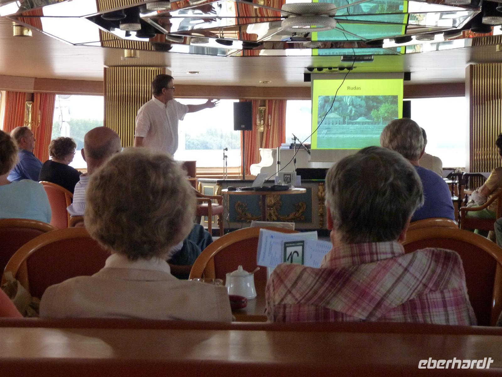 Nach dem Frühstück, mit wunderschöner Panoramasicht Donauknie, Panonische Tiefland vorbei an der Stadt Vac, stimmten wir uns bei dem Vortrag von Reisebegleiter Peter Rudolph auf die Bäderkultur Budapest ein.
