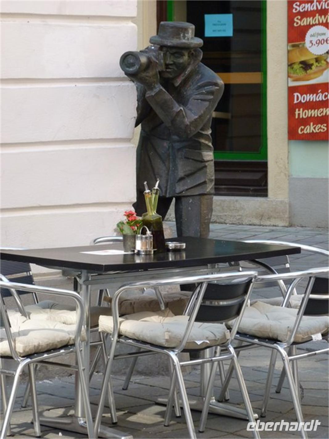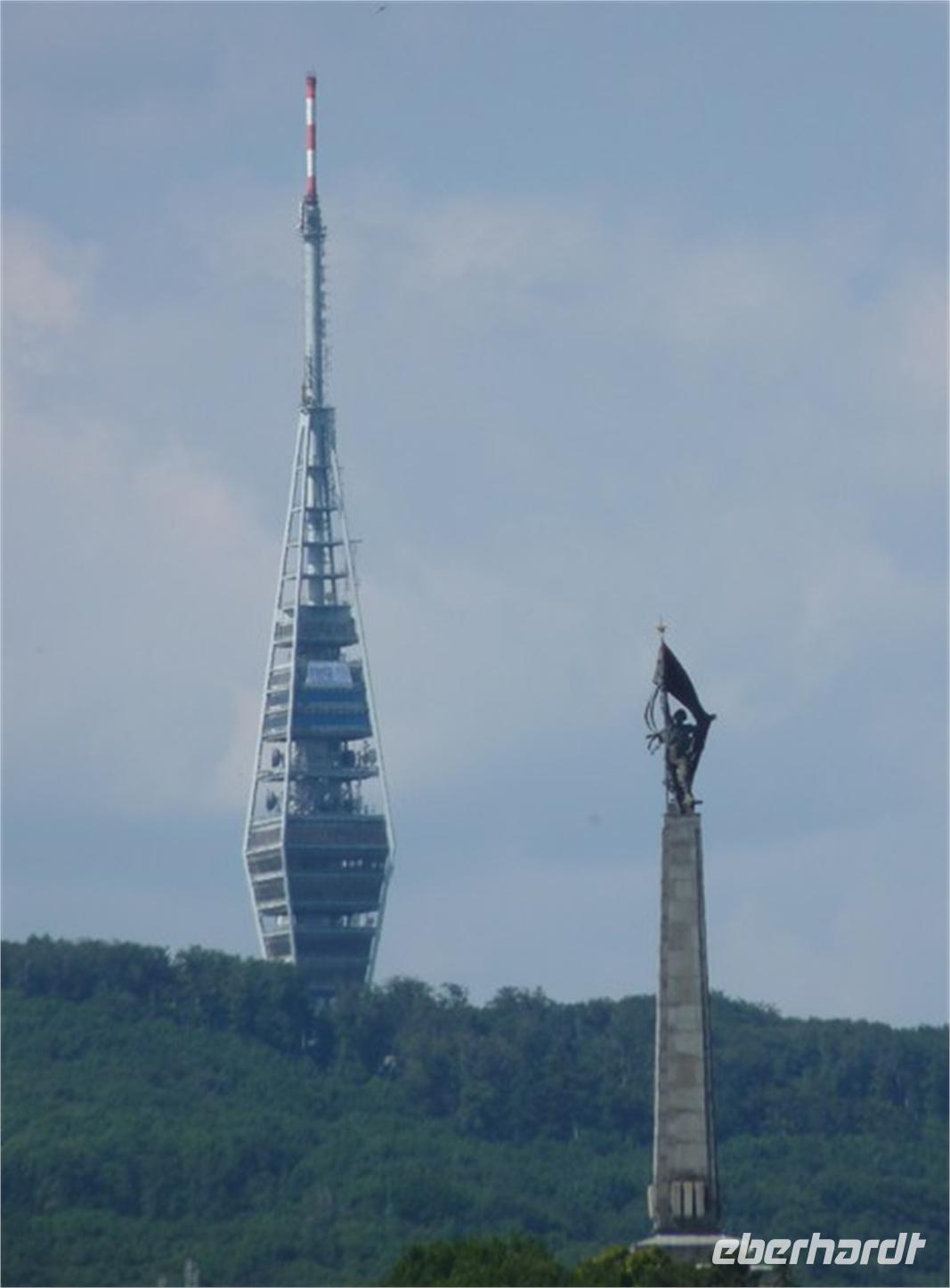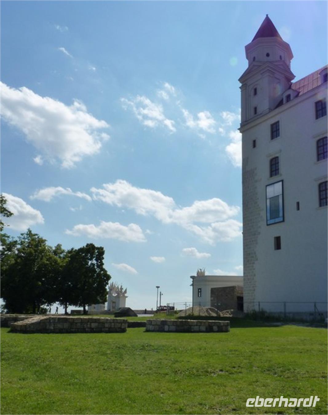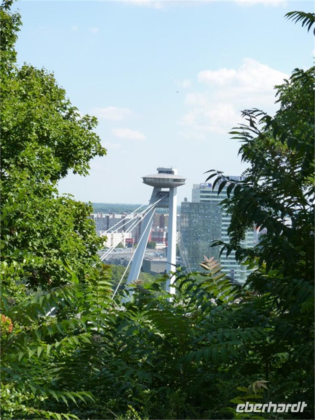 Von da aus erlebten die Gäste einen super Blick auf die Donau, im Vordergrund die neue Brücke inklusive Ufo (Restaurant mit Aussichtsplattform) und auf das Dreiländereck Slowakei- Ungarn- Österreich, denn die Stadtgrenzen von Bratislava sind zugleich Staatsgrenzen.