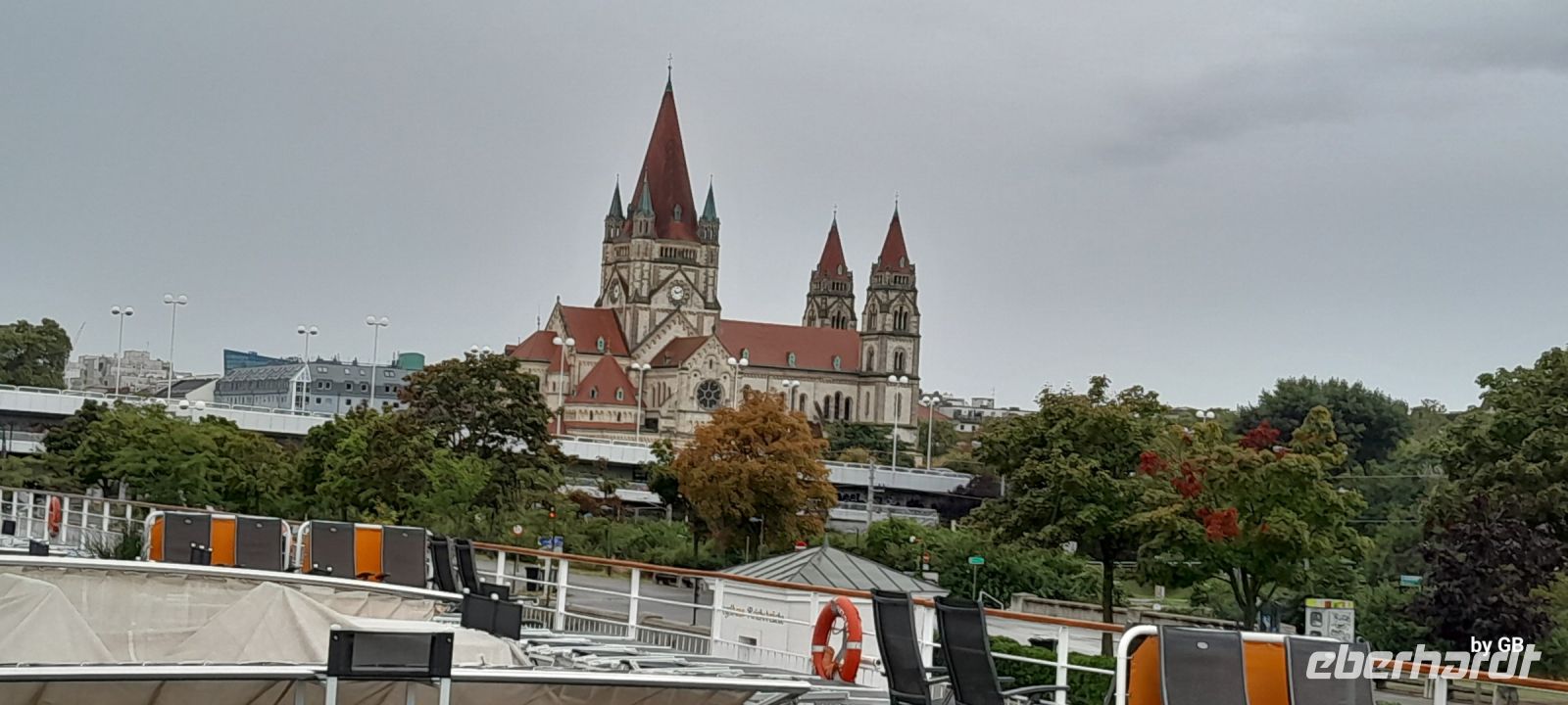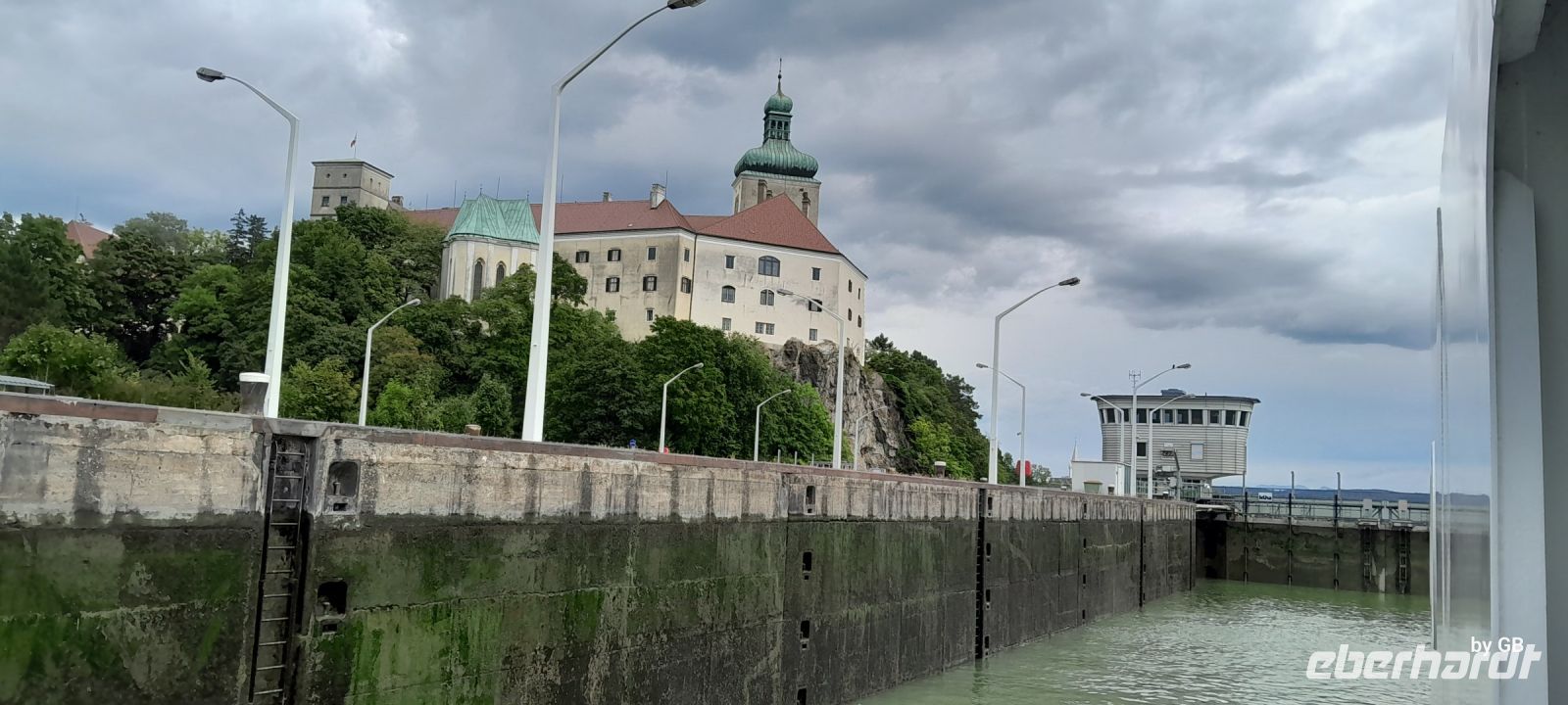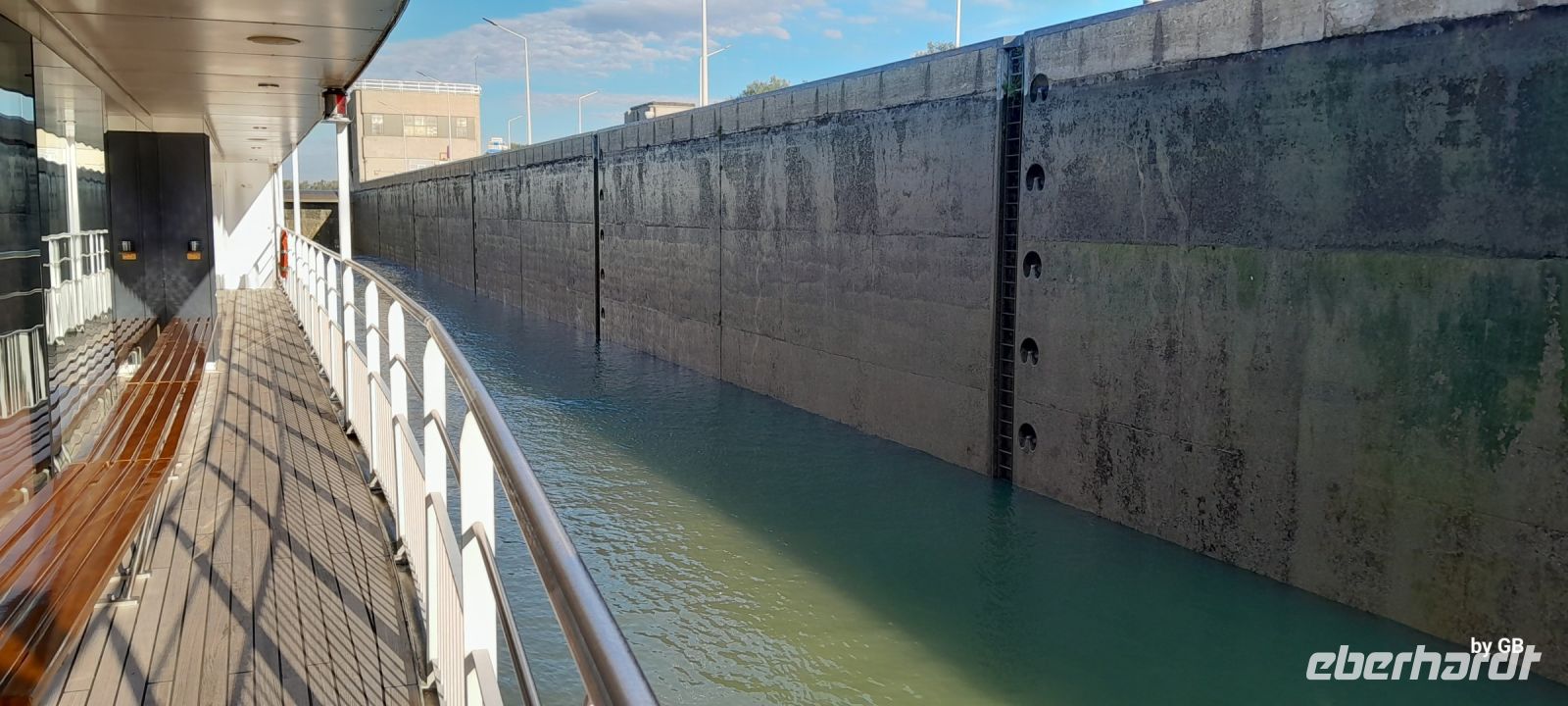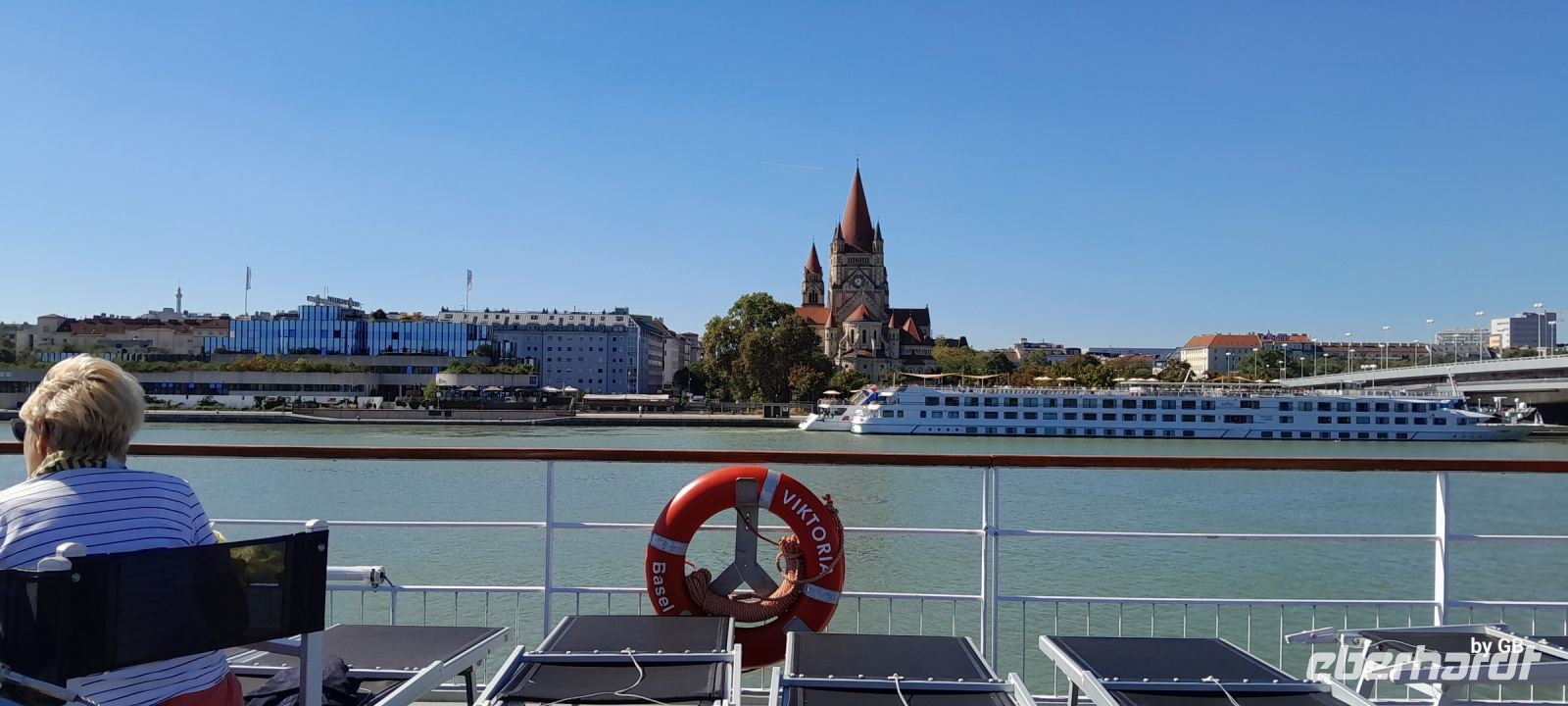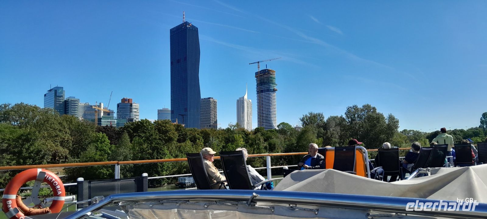 Die erste Nacht an Bord waren für einige Gäste doch gewöhnungsbedürftig. Es wurden einige Schleusen durchfahren, was natürlich neue Geräusche verursacht, das gleichmäßige Gleiten des Schiffes durch das Wasser unterbricht. Trotzdem waren alle gut gelaunt beim Frühstück und gespannt auf den ersten Tag. Der Vormittag war ganz entspannt. Man konnte an Deck die vorbeiziehenden Landstriche bestaunen, es ging an vielen interessanten orten vorbei, durch die Wachau, an vielen Burgruinen und Schlössern auf den Bergen vorbei. Auch konnten wir der Viktoria beim Schleusen zuschauen: immer wieder ein Erlebnis! Weiter ging es dann an Wien vorbei und wir konnten schon einige Sehenswürdigkeiten von Weitem erkennen: das Riesenrad des Praters, den Turm des Stefandomes, den Schornstein der Müllverbrennungsanlage im typischen „Hundertwasser-Design“, aber auch die moderne Seite links des Stroms mit ihren Hochhäusern der UNO City.