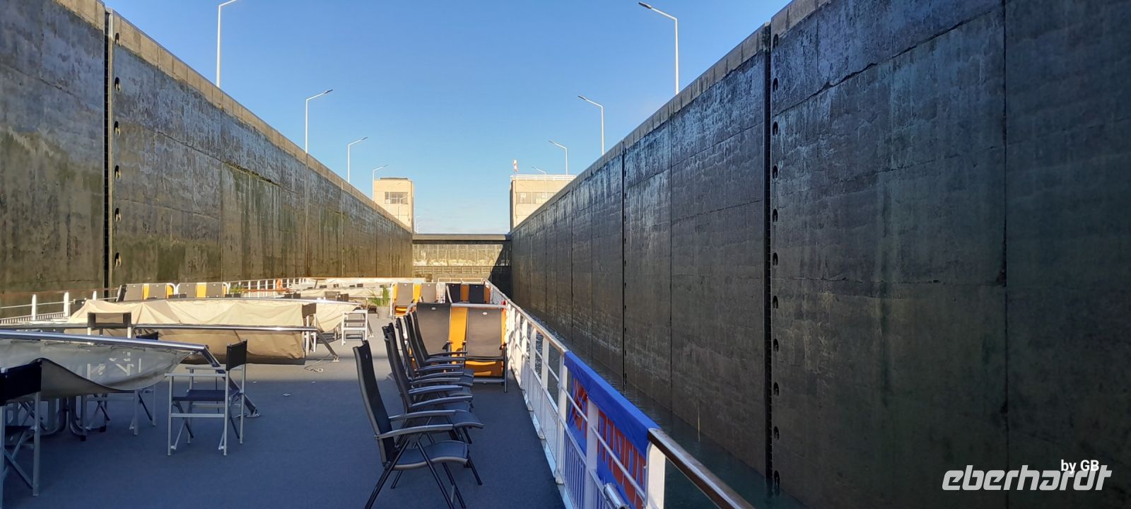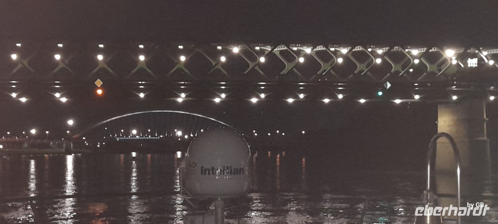 Nachdem alle Gäste an Bord waren, legte die „Viktoria“ auch ab und fuhr gemächlich die Donau stromabwärts Richtung Linz/Österreich. Kurz vor der Grenze konnten wir die erste Schleusung dieser Fahrt beobachten. Die Schleuse Jochenstein, noch auf deutschem Boden, war zügig passiert. Vorbei an Engelhartszell (bereits Österreich) gab es gleich die erste Attraktion zu bestaunen, die „Schlögener Schlinge“ – der größten natürlichen Mäander der Donau, die sich hier in zwei fast 180° Schleifen des Weg durch das Gestein gegraben hat. Sehenswert war noch das Panorama von LINZ, an dem wir nach Einbruch der Dunkelheit vorbeifuhren.