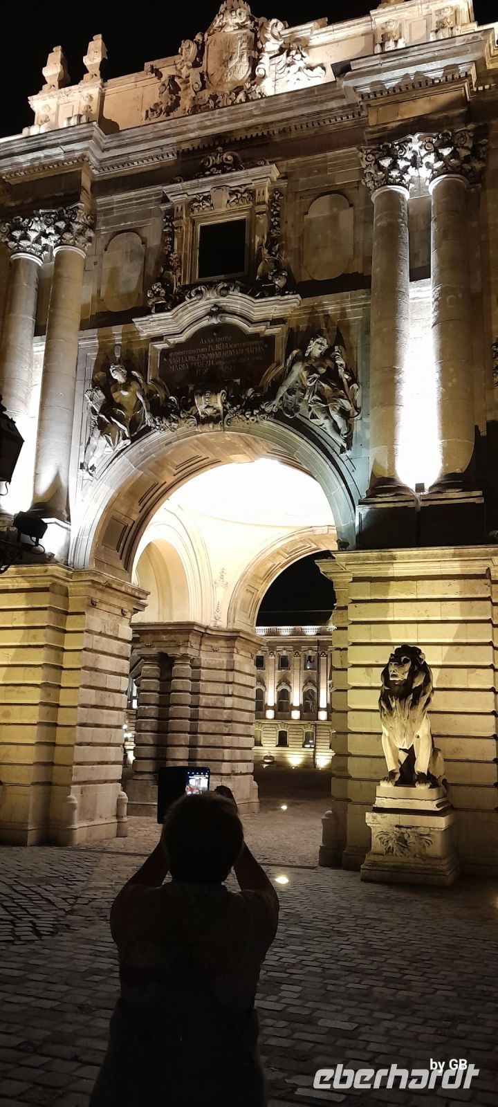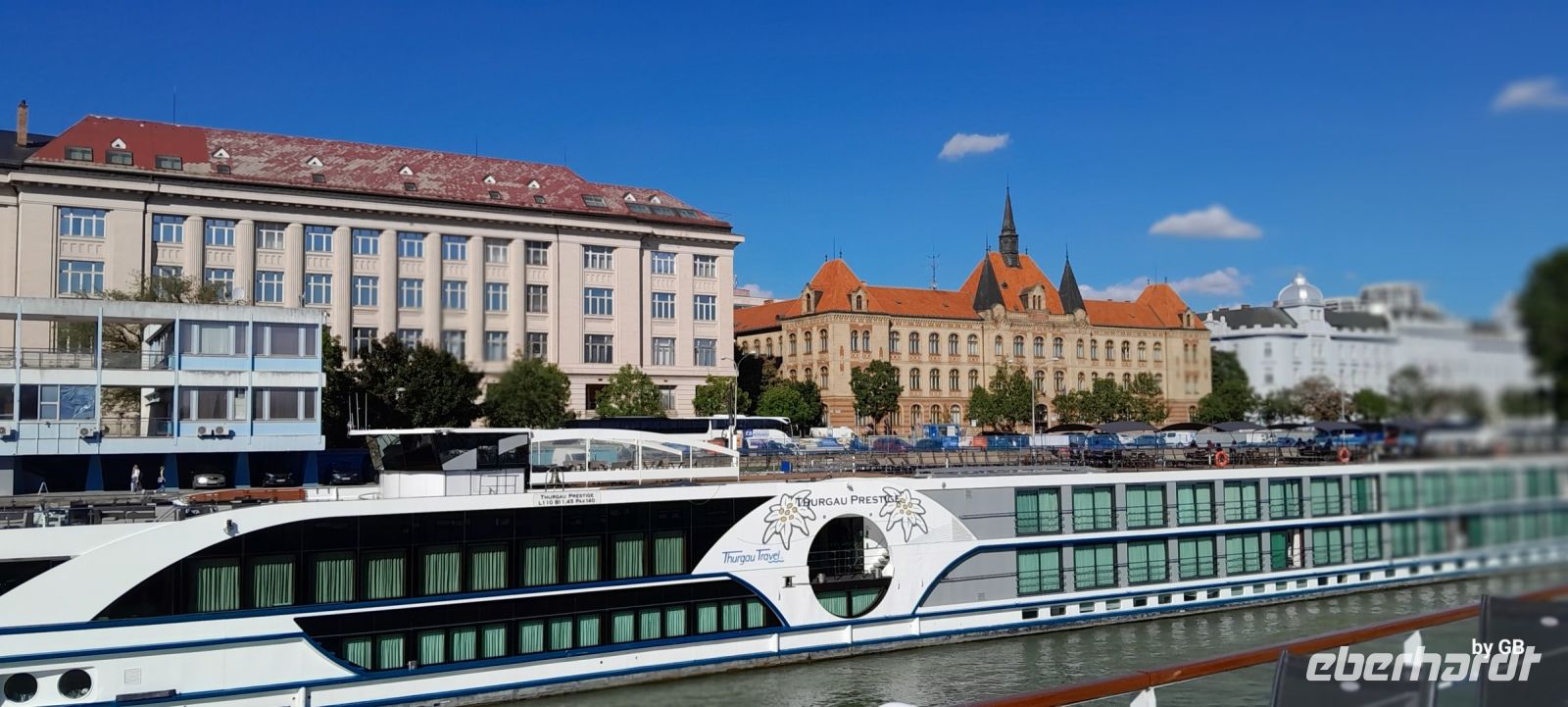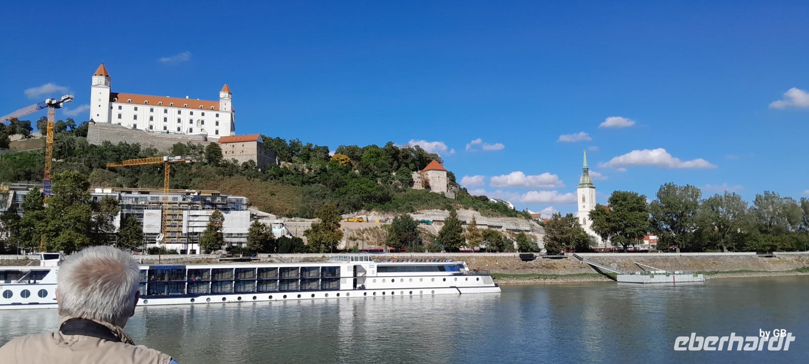 Drei Busse und drei Guides warteten auf die Passagiere der Viktoria. Unser Guide Peter, begann auf der Fahrt hoch zur Burg die Geschichte der Stadt auf unterhaltsame und witzige Art zu erklären. Auf der Burg gab es nach der Führung noch genug Zeit für WC und Fotos, und dann ging es mit dem Bus wieder hinunter in die Altstadt. Zu Fuß ging es an der Pestsäule und er deutschen Botschaft vorbei zum Alten Rathaus, Jesuiten- und Franziskaner-Kirche, aber auch zum Cafe Mayer mit dem „Schönen Naci“ an der Ecke und weiter zum berühmten „Cumil“ mit dem total fehl am Platze stehenden Hinweisschild in Englisch „Man at work“. Nach der offizielle Führung erklärte uns Peter noch den (einfachen) Weg zurück zum Schiff und entließ uns noch in die viel zu knappe Freizeit zur eigenen Erkundung; denn um 19.00 h sollten wieder alle an Bord sein. Danach legte unser Schiff sofort ab, und während wir unser leckeres Abendessen einnahmen, fuhr es uns bereits wieder die Donau hinunter Richtung Ungarn.
