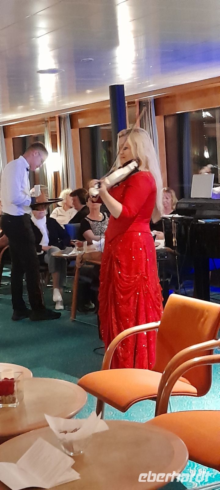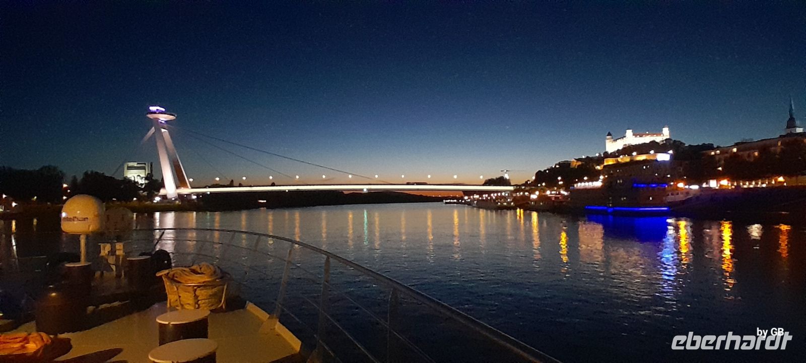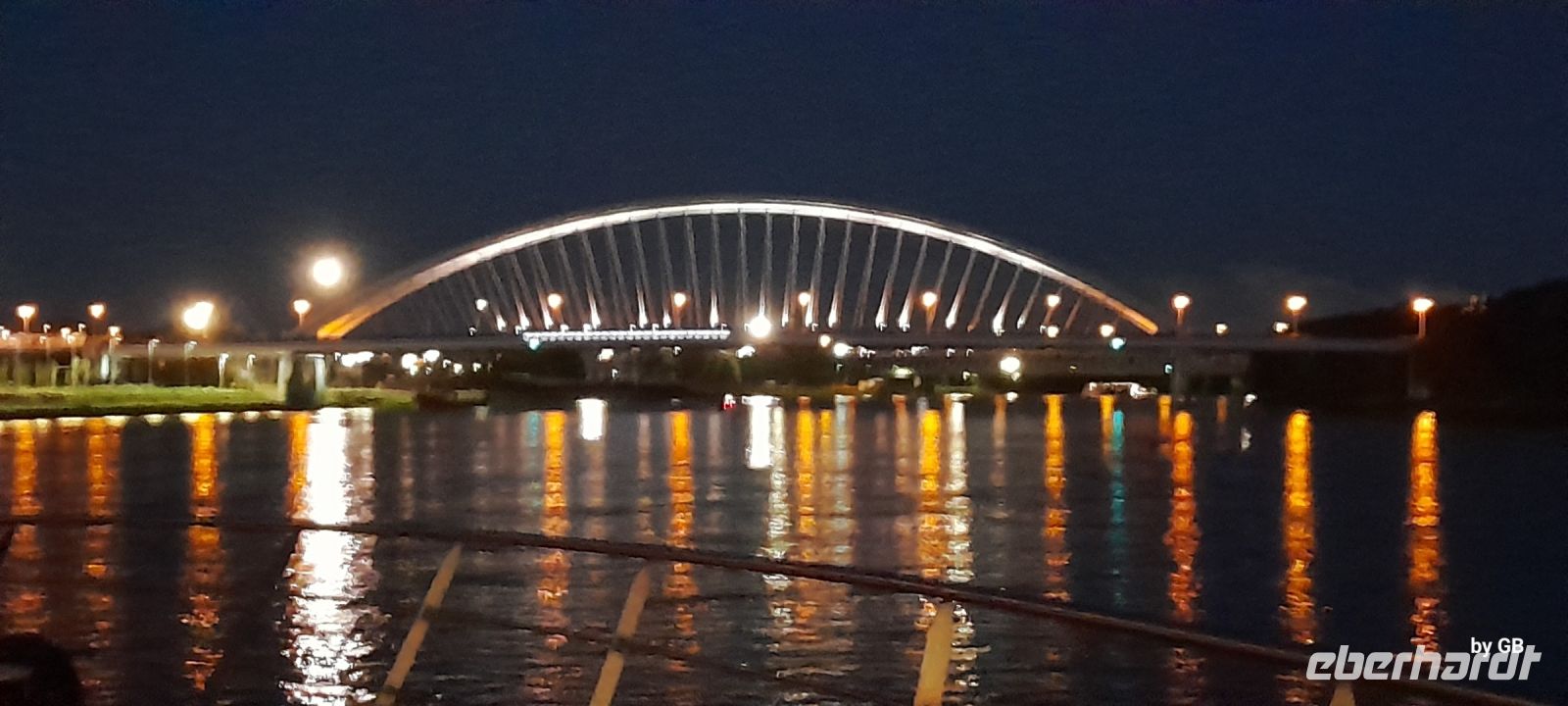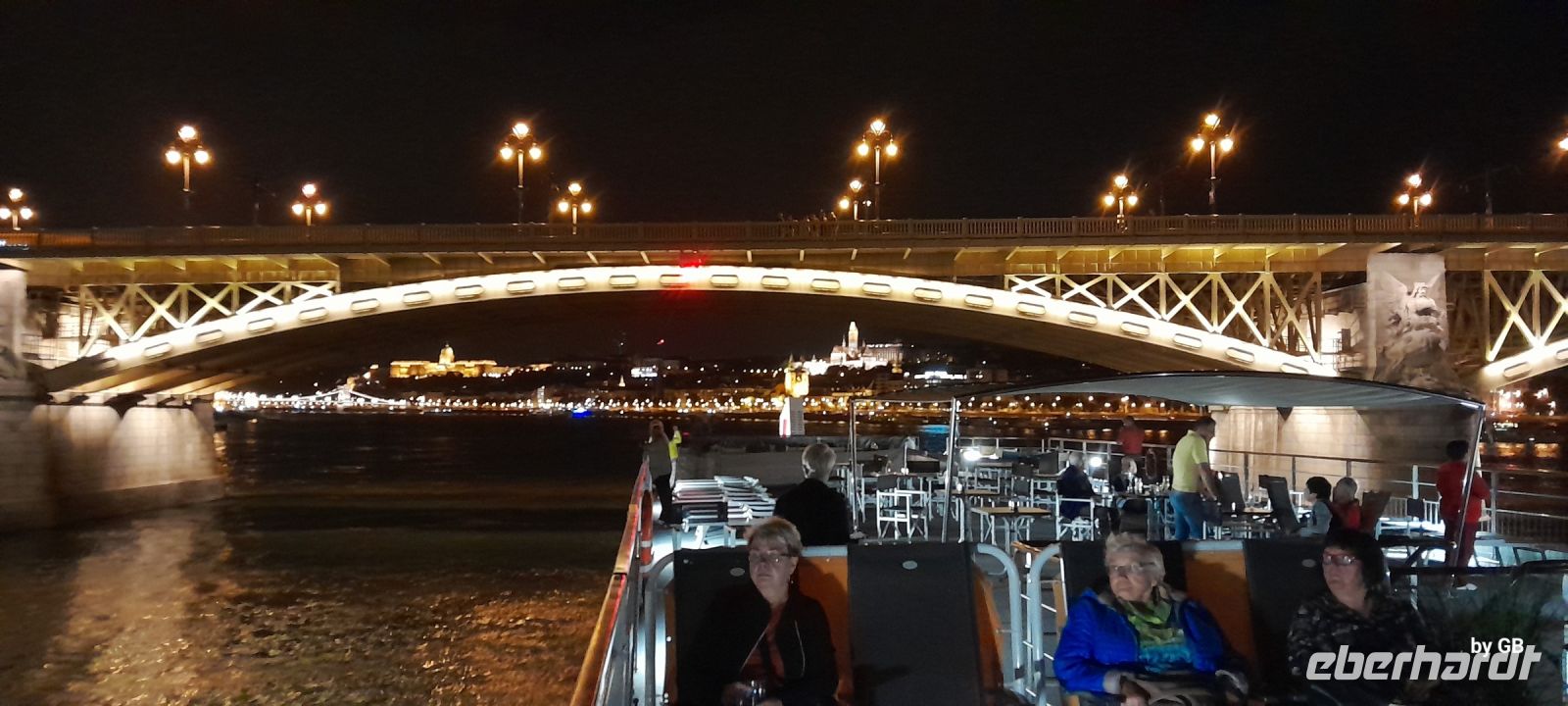 Nach dem Abendessen wurde noch eine Lichterfahrt durch die beleuchtete Stadt, die schönen Brücken und zum Burgpalast angeboten, die viel Anklang fand. Zurück an Bord legte unser Schiff sofort ab, um bei der Fahrt die Donau hinauf die beleuchtete Stadt nochmals vom Schiff aus zu sehen. Dazu spielte Frau Wettin, unser Gast-Star an Bord, stimmungsvolle Musik auf ihrer Geige. - Wiederum ein gelungener Tag!