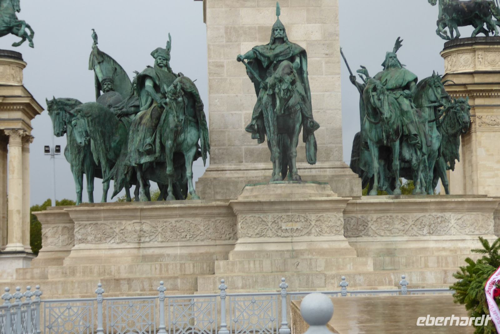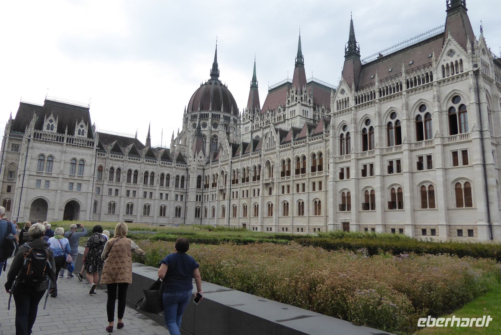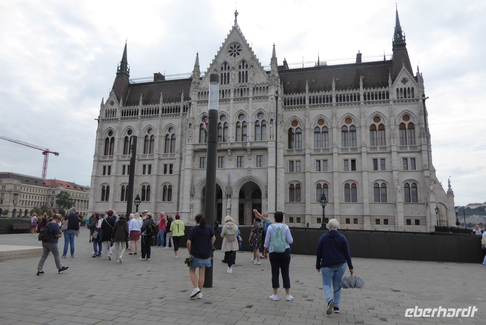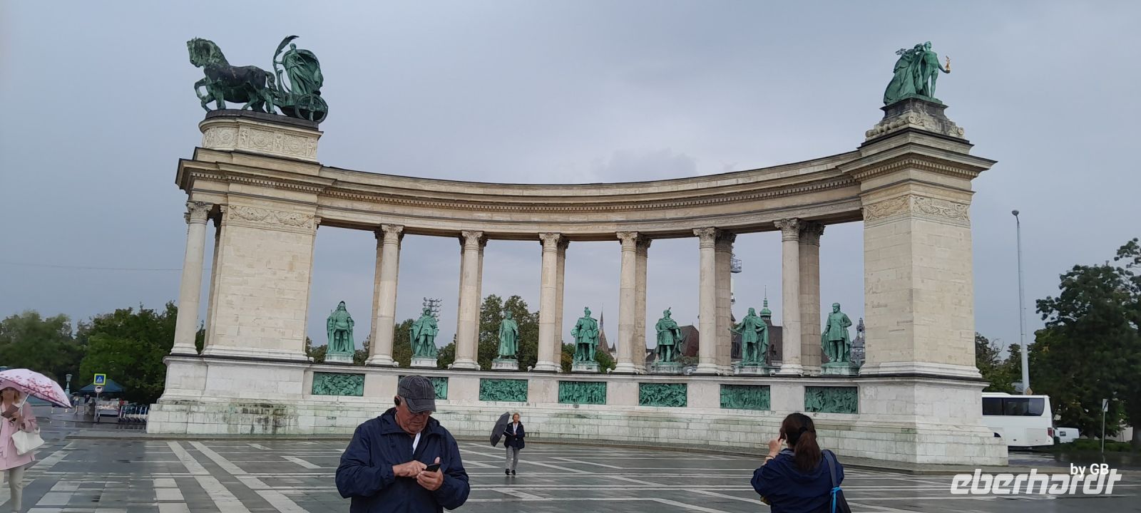 So starteten wir auf der Buda-Seite mit dem Guards Palace, auf dessen Stufen und Terrassen gerade eine Austellung von Bildern vom Balaton-Tourismus im Laufe der Jahre gezeigt wurde. Dann ging die Fahrt entlang der Donau, bis wir über die Margarethenbrücke auf die Pest-Seite fuhren. Auf der Fahrt unzählige Sehenswürdigkeiten, die uns unsere Stadtführerin im Vorbeifahren erklärte. Dann gab es eine längere Führung im Stadtwäldchen bis zum Heldenplatz-leider im Regen. Zurück ging es dann zur Donau und zum Parlamentsgelände, das uns Karla auf einem Spaziergang sehr ausführlich erklärte. So verging die Zeit wie im Fluge in dieser tollen Stadt, und um 13.00 h war die Führung vorbei. Leider war ein Besuch der Fischerbastei nicht möglich, da immer noch gebaut wird.