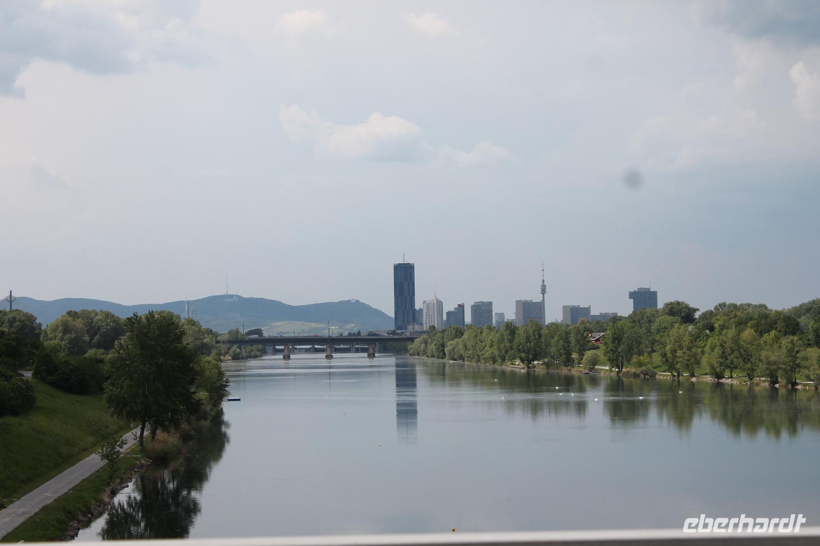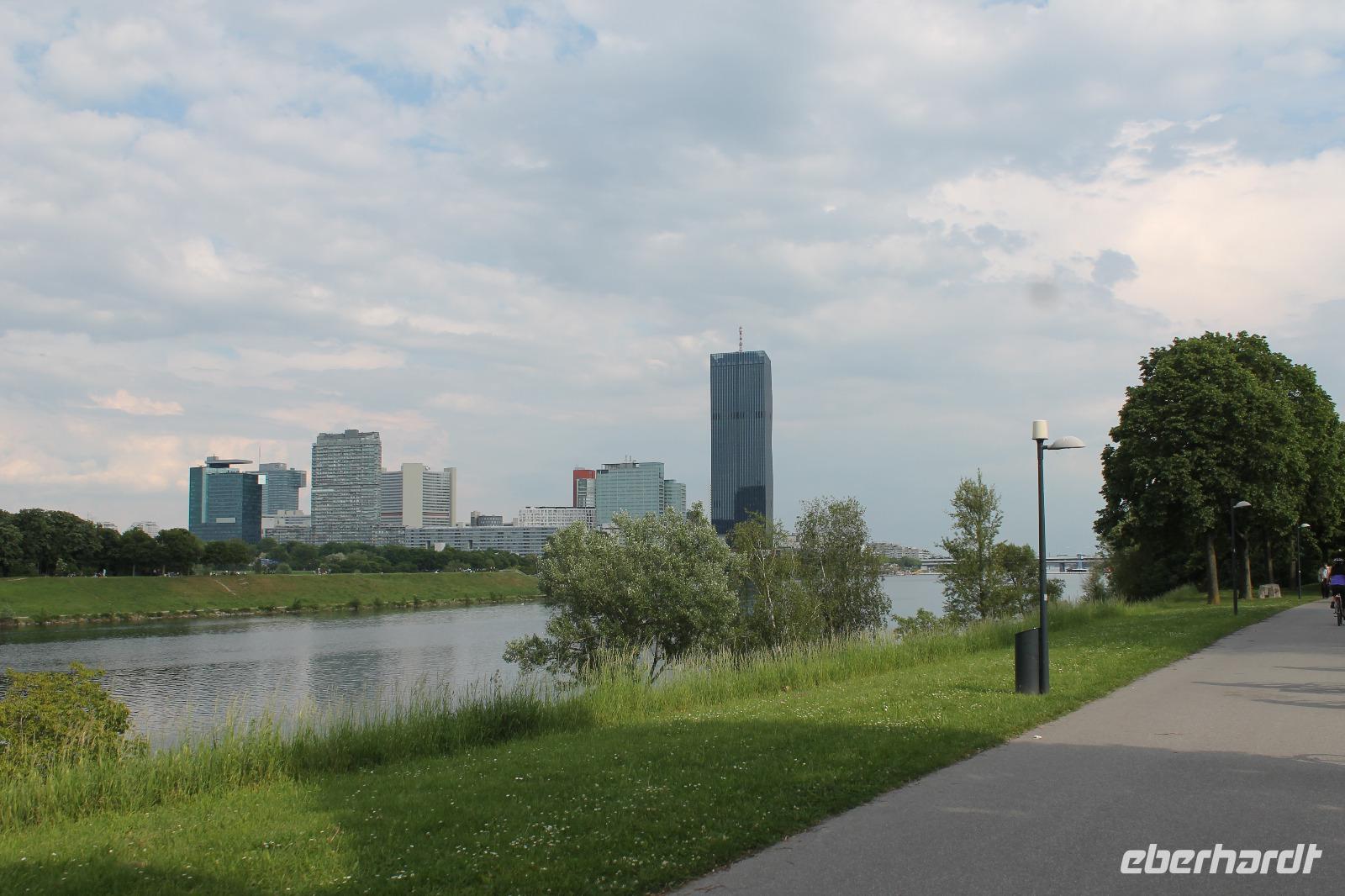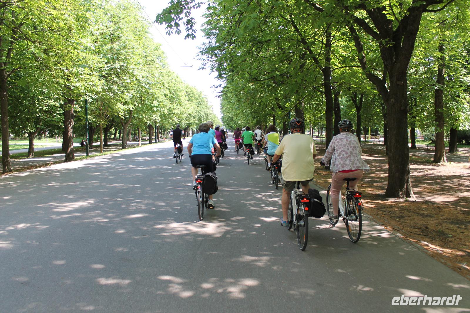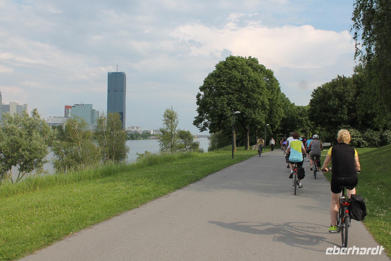 Wir lernten unseren neuen Guide kennen und wussten sofort, dass dieser Tag spitze werden musste! Mit Witz und tiefem Hintergrundwissen erzählte uns Horst „die Wahrheit" über Sissi, viel über die Gepflogenheiten der Wiener und über die Vergangenheit der Stadt. So radelten wir zuerst zum Riesenrad, dem Wahrzeichen des Praters, dann durch das ehemalige Jagdgebiet der Wiener Oberschicht , über die Donauinsel und immer entlang der Donau. Wir machten eine Kaffeepause in einem kleinen Bistro an der alten Donau und genossen die Entspanntheit des Tages. Im Anschluss radelten wir wieder in Richtung Schiff und knipsten noch ein Gruppenfoto vor den Wolkenkratzern Wiens.