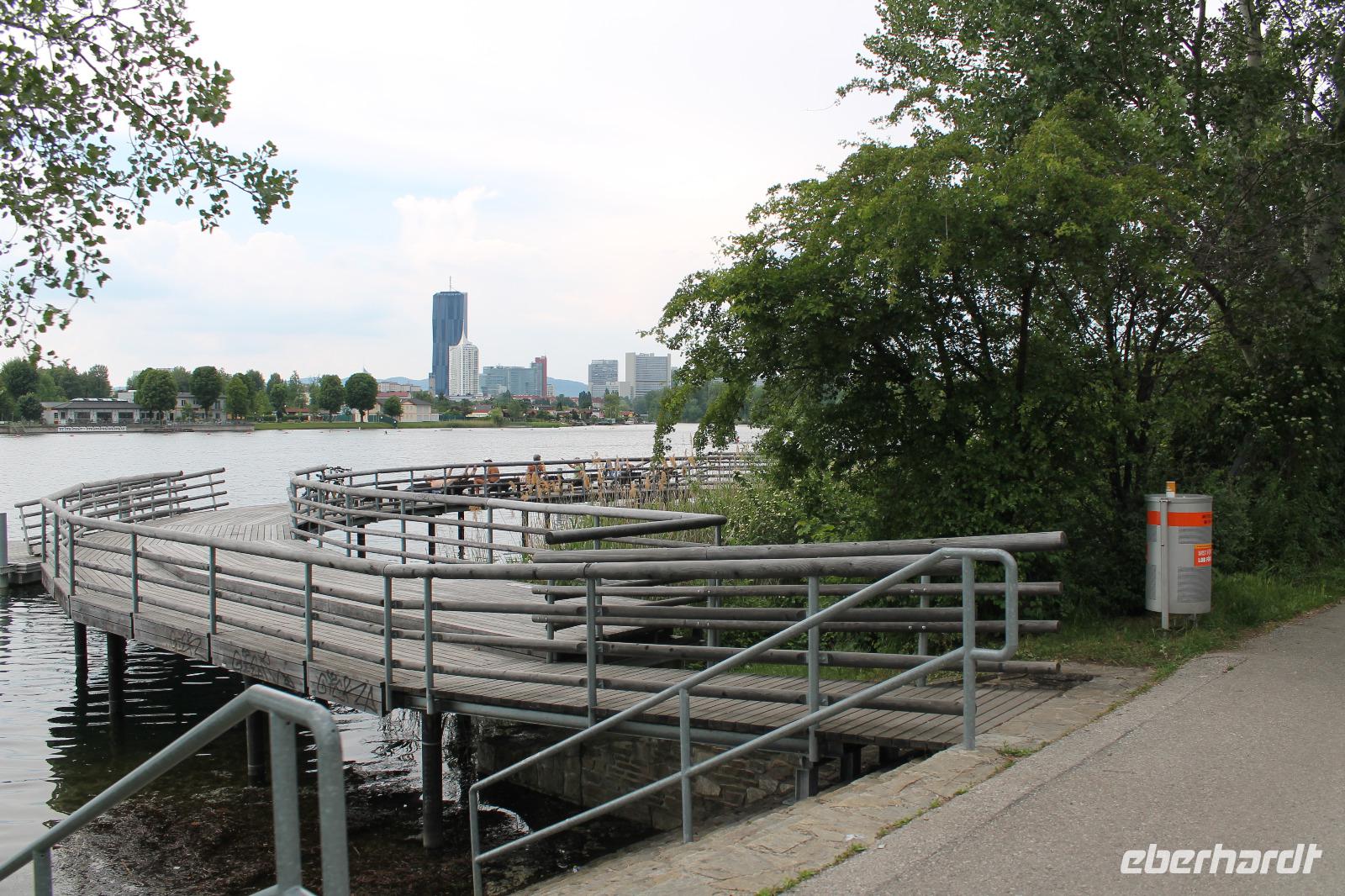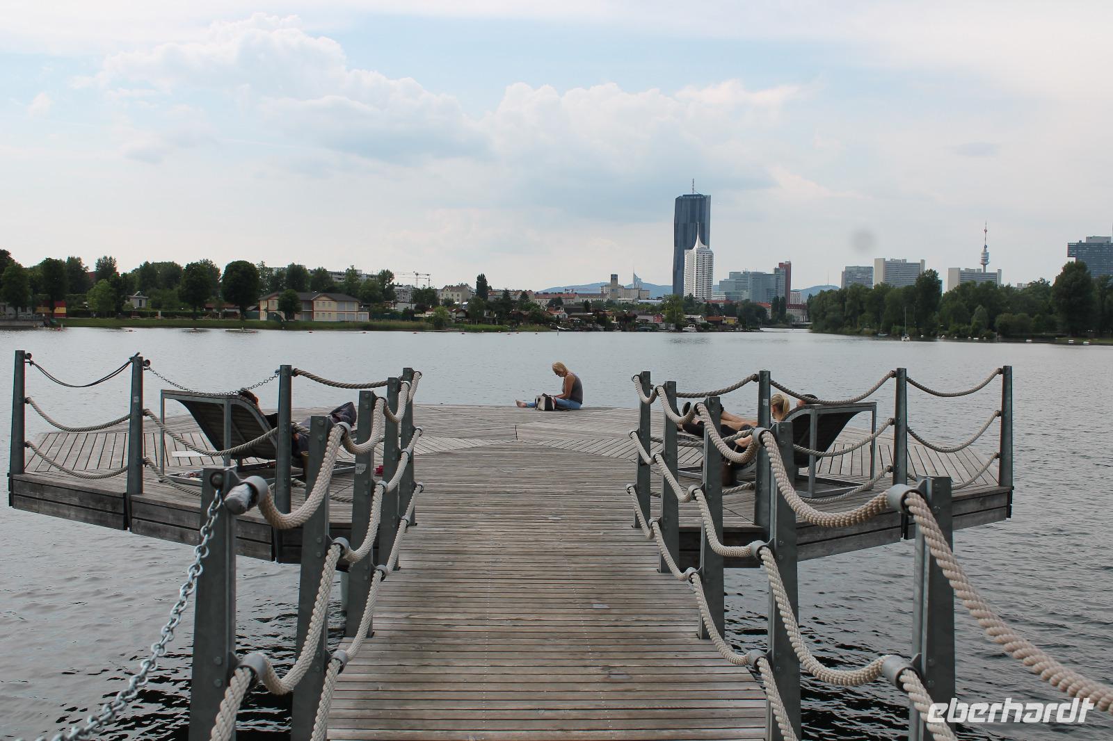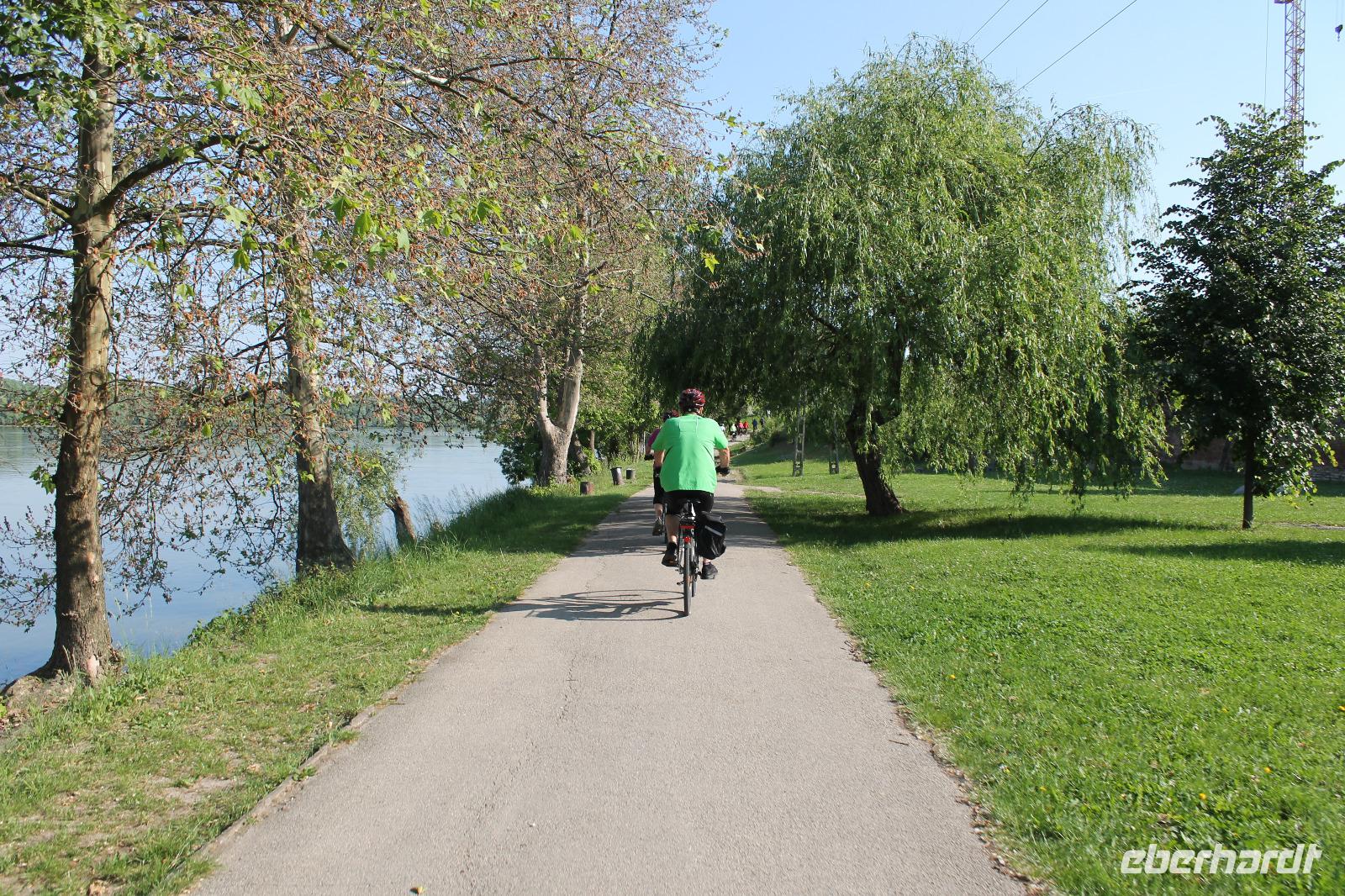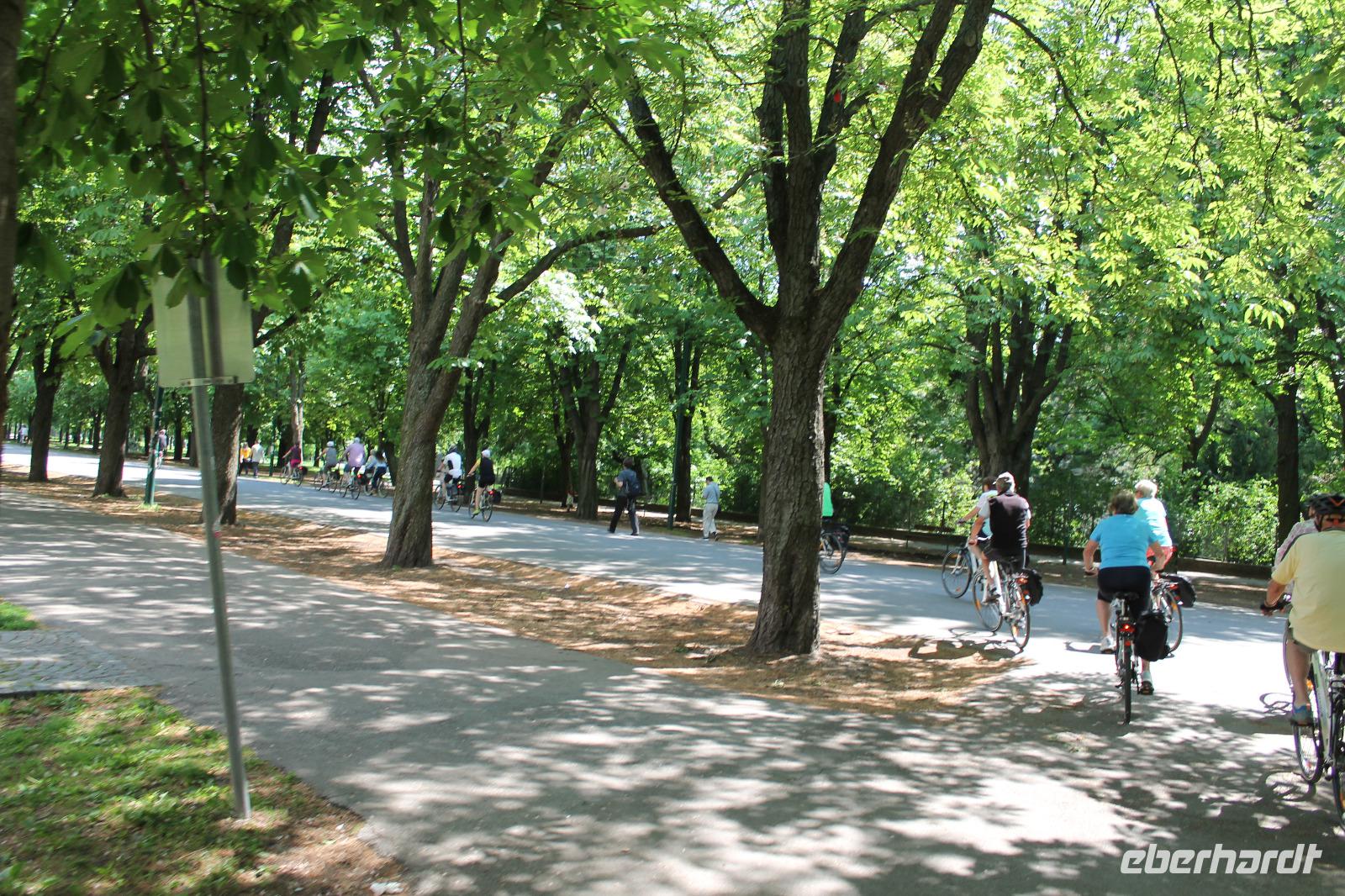 Wir lernten unseren neuen Guide kennen und wussten sofort, dass dieser Tag spitze werden musste! Mit Witz und tiefem Hintergrundwissen erzählte uns Horst „die Wahrheit" über Sissi, viel über die Gepflogenheiten der Wiener und über die Vergangenheit der Stadt. So radelten wir zuerst zum Riesenrad, dem Wahrzeichen des Praters, dann durch das ehemalige Jagdgebiet der Wiener Oberschicht , über die Donauinsel und immer entlang der Donau. Wir machten eine Kaffeepause in einem kleinen Bistro an der alten Donau und genossen die Entspanntheit des Tages. Im Anschluss radelten wir wieder in Richtung Schiff und knipsten noch ein Gruppenfoto vor den Wolkenkratzern Wiens.