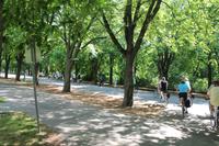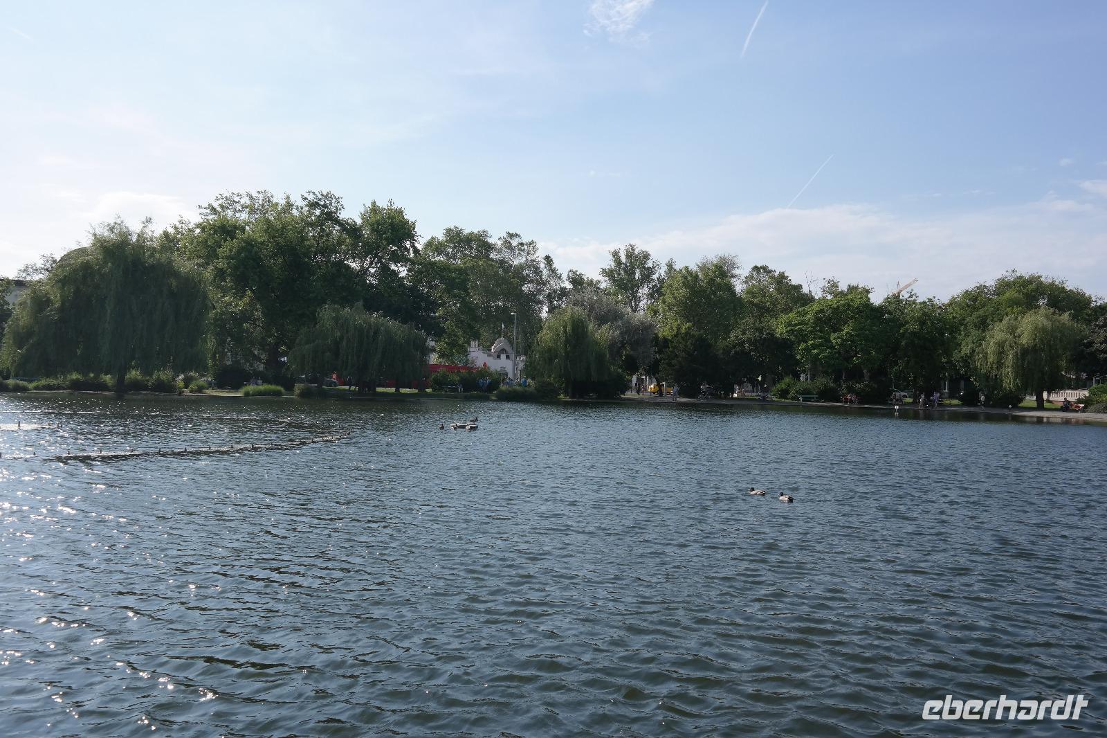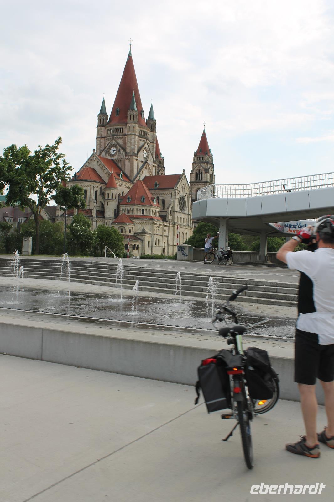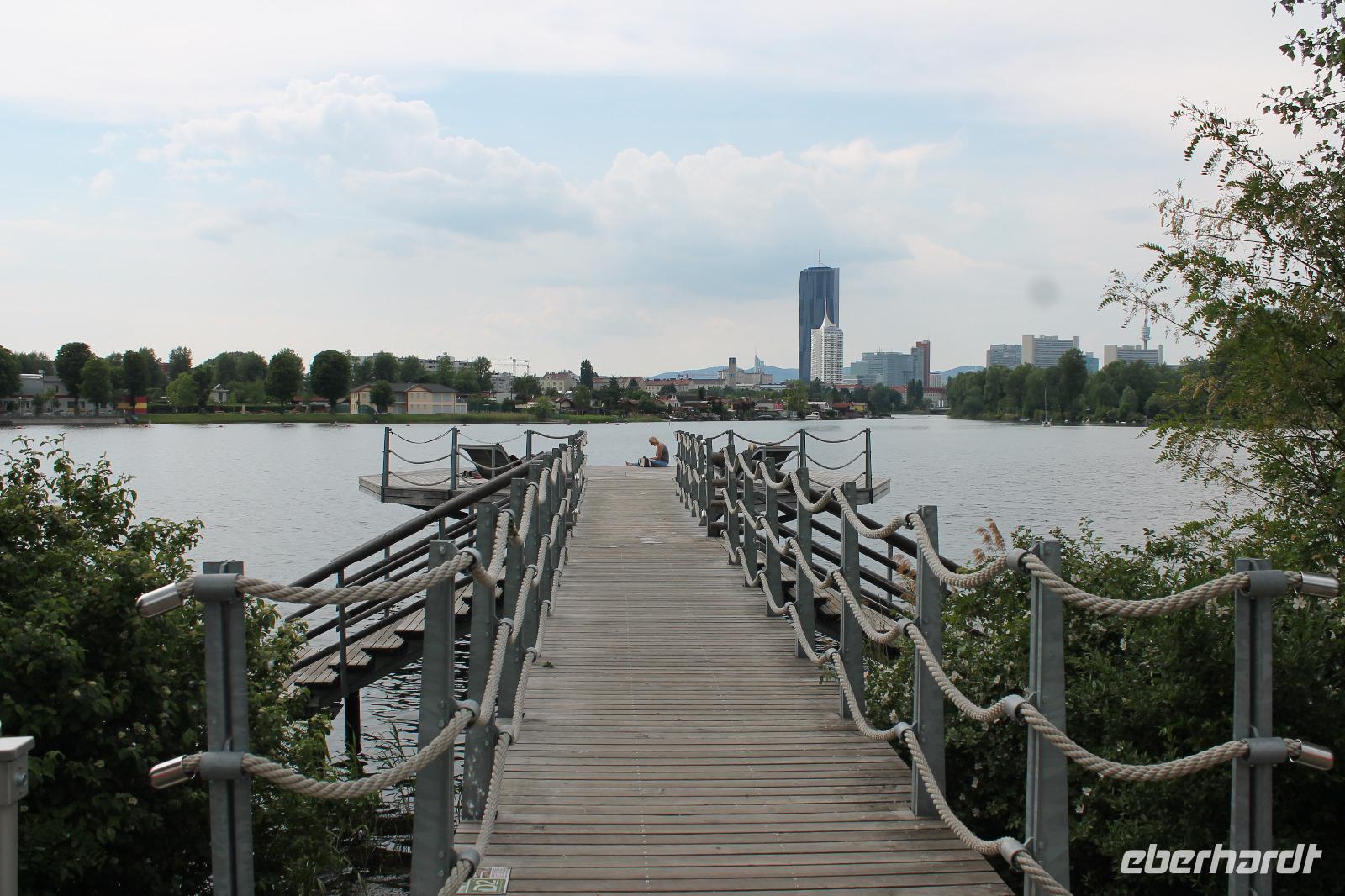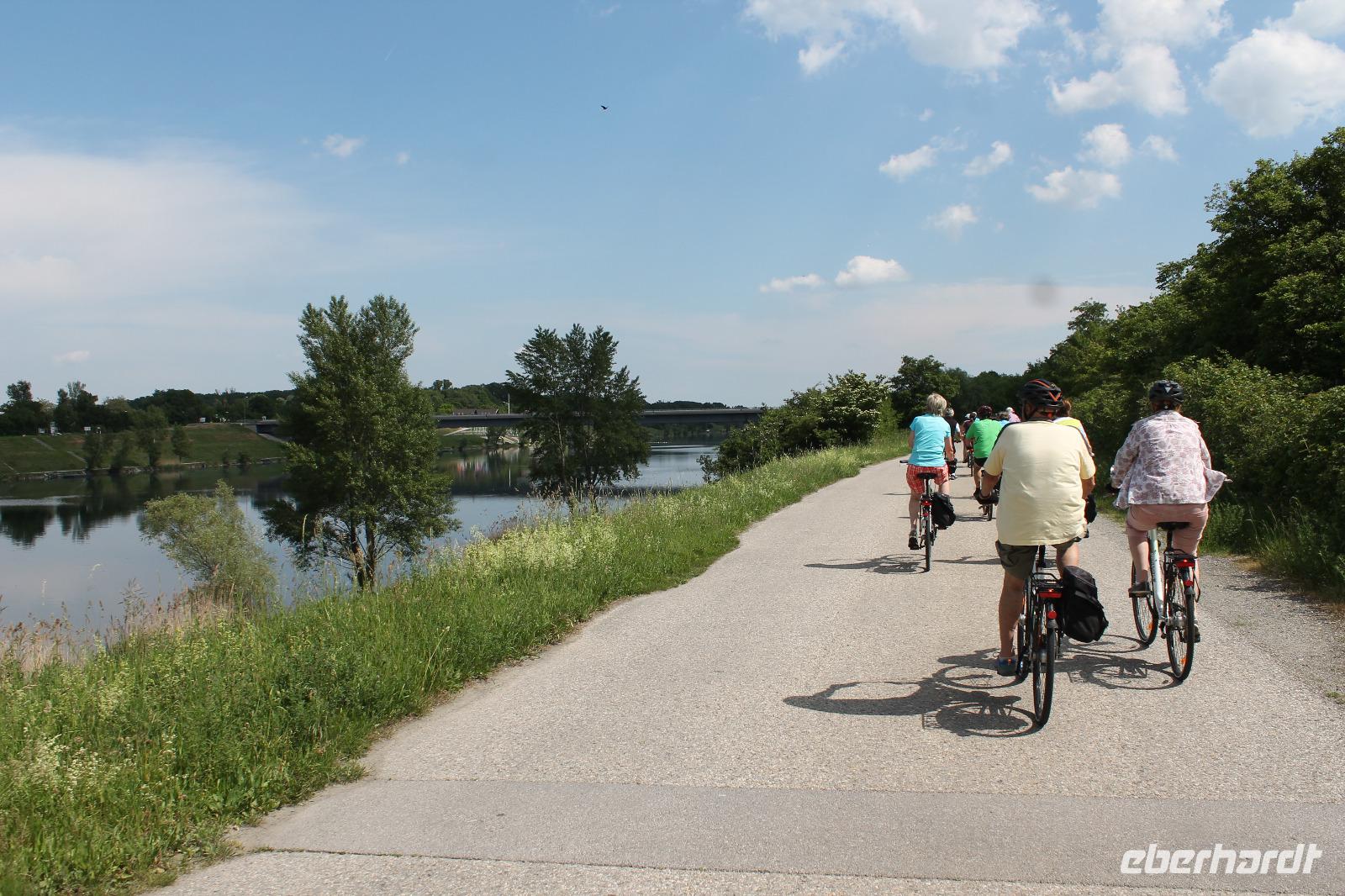 Wir lernten unseren neuen Guide kennen und wussten sofort, dass dieser Tag spitze werden musste! Mit Witz und tiefem Hintergrundwissen erzählte uns Horst „die Wahrheit" über Sissi, viel über die Gepflogenheiten der Wiener und über die Vergangenheit der Stadt. So radelten wir zuerst zum Riesenrad, dem Wahrzeichen des Praters, dann durch das ehemalige Jagdgebiet der Wiener Oberschicht , über die Donauinsel und immer entlang der Donau. Wir machten eine Kaffeepause in einem kleinen Bistro an der alten Donau und genossen die Entspanntheit des Tages. Im Anschluss radelten wir wieder in Richtung Schiff und knipsten noch ein Gruppenfoto vor den Wolkenkratzern Wiens.