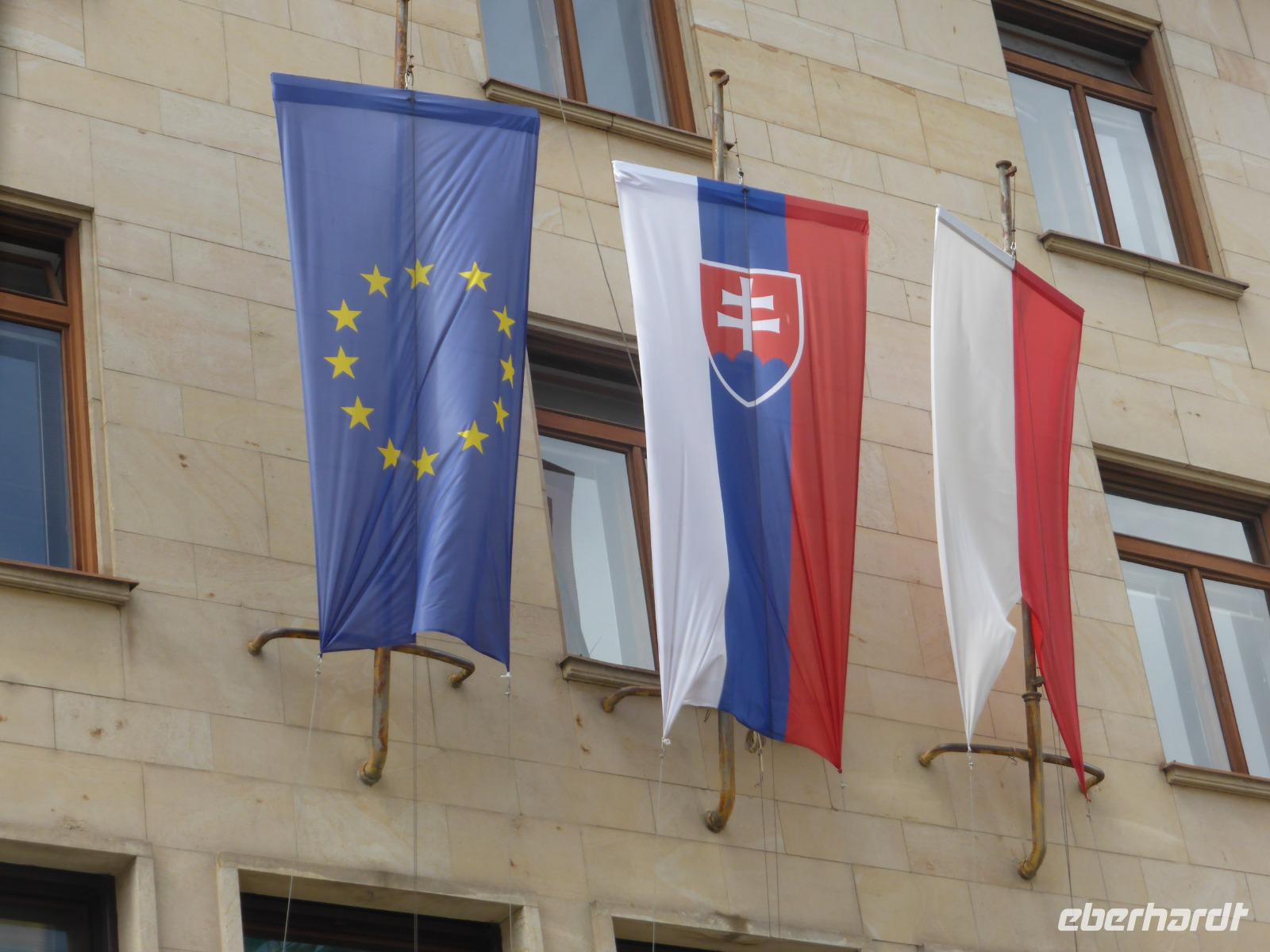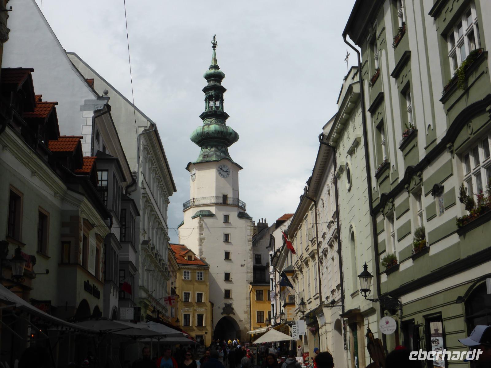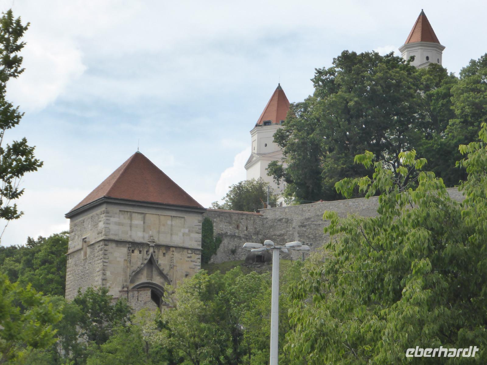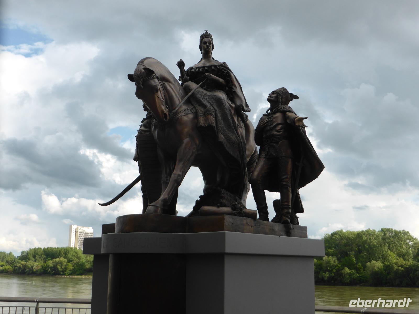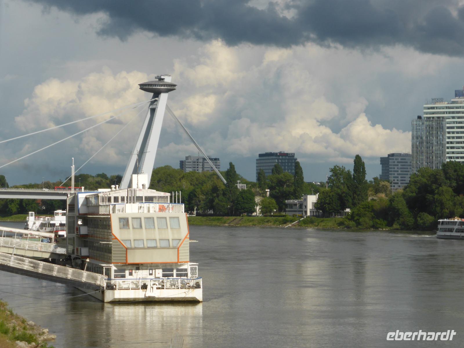 Die Radgäste unternehmen an fünf der sieben Reisetage eine halbtägige Radtour, nehmen aber zusätzlich an einigen Eberhardt-Inklusive-Ausflügen mit den anderen Gästen gemeinsam teil und genießen den Luxus des Schiffes selbstverständlich auch. Eine perfekte Mischung also, die's macht. Bratislava. Das Wetter geht so, hoffentlich wird es nicht regnen. Nach dem Mittagessen holen die Matrosen für uns die gepflegten 7-Gang-Räder mit Handbremsen und Rücktritt von Deck. Da stehen sie aufgereiht, machen einen guten Eindruck. Die Radgäste, gekleidet von freizeitmäßig bis „radfahrprofessionell" probieren das eine oder andere Rad aus und entscheiden sich schließlich für eines. Ein Jeder findet das ihm genehme. Wir freuen uns auf das Fahradfahren. Das Essen an Bord ist so wohlschmeckend und reichlich, da tut Bewegung doppelt gut. Aber: von Bratislava selbst, insbesondere der knuffigen und zauberhaften Altstadt mit den hübschen Häusern, den Gassen und Höfen möchten wir auch etwas mitbekommen. Bratislava liegt unmittelbar an der Donau, das Stadtzentrum ganz nah. Dort parken wir die Räder unter guter Obhut und mischen uns unter die vielen Gäste der Stadt. Der Radguide, ein professioneller Gästeführer, vermittelt uns viel Wissen über die Stadt. Wir sehen das Slowakische Nationaltheater, das Rathaus mit den bunten Majolika-Kacheln, die Altstadtgassen und den Michaelertorturm. So schön ist es hier in Bratislava, dass die kleine Stadtführung auch noch länger hätte dauern können. Aber alles gleichzeitig geht nunmal nicht. Wir radeln ostwärts Richtung Niederösterreich. Bratislava liegt nahe an der Österreichisch-Slowakischen Grenze. Die Morava, von Nord nach Süd Richtung Donau fließend, markiert auch heute noch die Staatgrenze zwischen Österreich und der Slowakei. Genau bis zur Stelle der Mündung in die Donau, einst war hier der eiserne Vorhang, fahren wir mit dem Rad, leider ein Stück auf einer verkehrsreichen Straße entlang. Angekommen sehen wir am anderen Donauufer schon Ungarn liegen. Über uns erheben sich die altslawischen Ruinenreste Devin; ein geschichtsträchtiger, identitätsstiftender Flecken Erde für das slowakische Volk. Eine Rast mit Kaffee und oder Eis und wir radeln zurück. Geschichtsträchtige Bauwerke resp. Ruinen und Naturschauspiele können dicht beieinander sein: so wir radeln an einem Teich vorbei, wo gerade ein Froschkonzert allererster Güte dargeboten wird. So klangvoll, dass sich etliche Naturliebhaber extra mit Videokamera hier eingefunden haben, um das Ganze als Video aufnehmen. Auch wir verweilen. Auf dem Rückweg nähern wir uns der „Rossini" auf den letzten wenigen Kilometern direkt am Ufer der Donau. Wir fahren auf der Promenade mit Blick zur futuristischen Neuen Brücke und an der Maria-Theresia-Statue vorbei bis zur „Rossini". Es hatte mal getröpfelt unterwegs, aber richtig nass wurden wir nicht, wie schön. Voller Eindrücke geben wir die Räder, für morgen mit einem kleinen Zeichen versehen, um das „eigene" wiederzuerkennen, wieder ab. Für den Rest des Tages genießen wir das körperliche und mentale Gefühl, aktiv gewesen zu sein und ...lassen uns natürlich das vorzügliche Dinner schmecken.