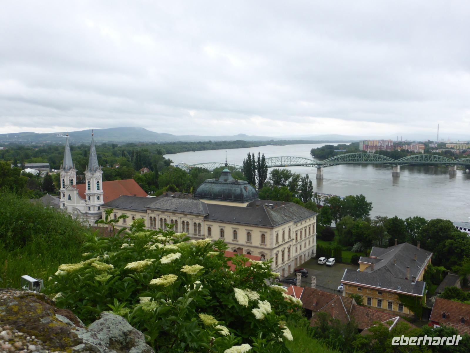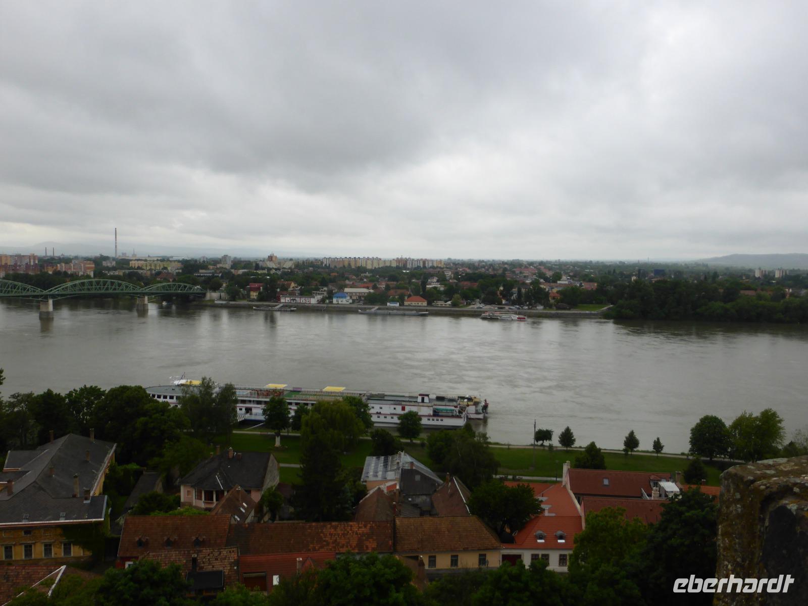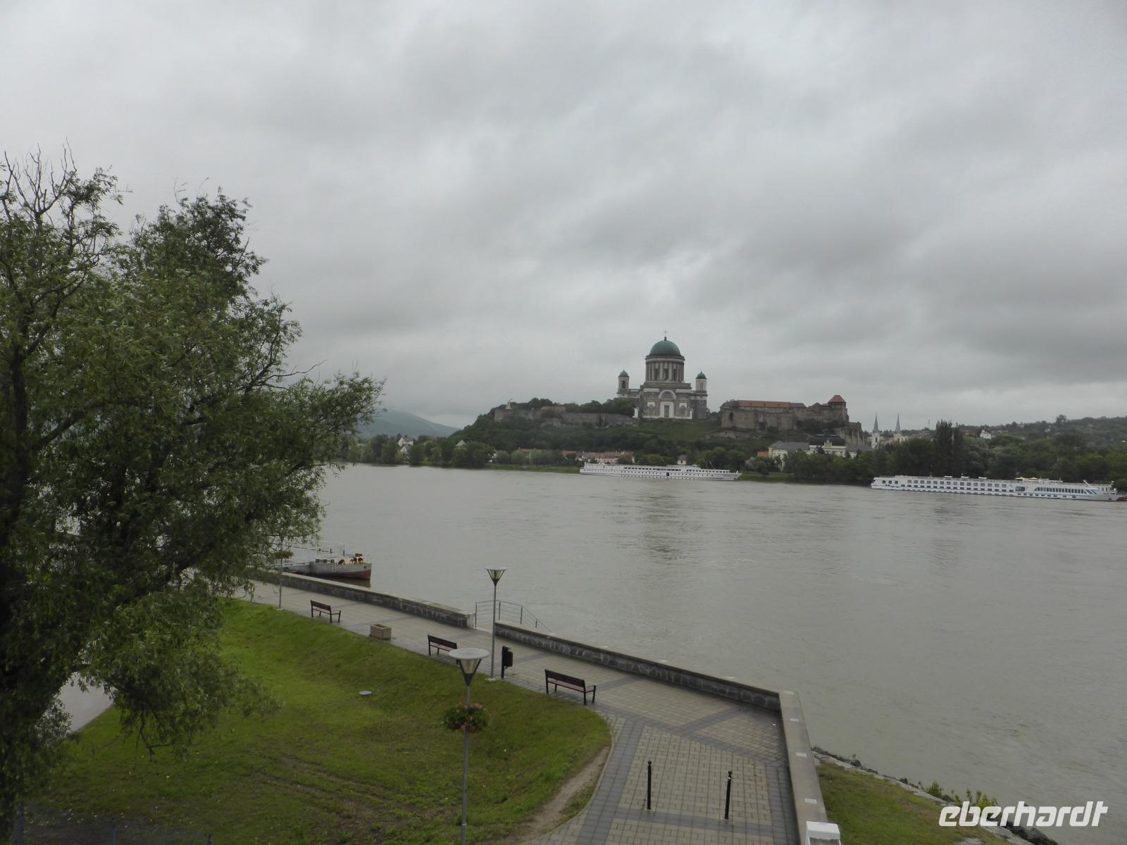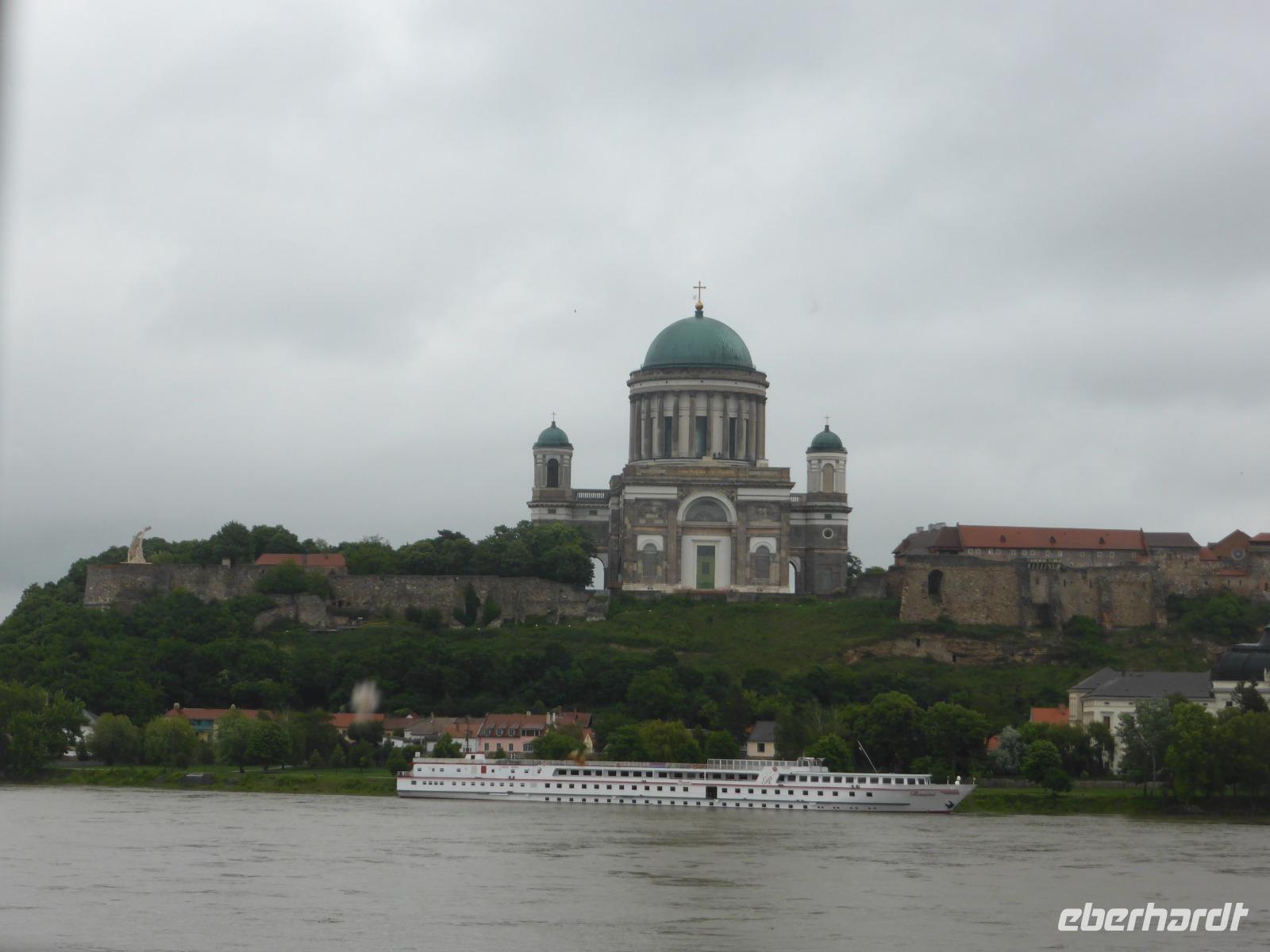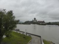 Die „Rossini" hat angelegt in Esztergom. Die Radtour findet heute am Vormittag statt. Leider regnt es und für den restlichen Tag ist auch kein Sonnenschein in Aussicht gestellt. Die gute Hälfte der Radgäste möchte nicht bei Regenwetter fahren und so macht sich der „harte Kern" mit dem Radguide auf den Weg. Die meisten Touristen überhaupt kommen wegen der Basilika in das kleine Städtchen. Sie ist die größte Kirche Ungarns, ihre massive Kuppel erinnert an den Petersdom in Rom und bestimmt das Stadtbild von Esztergom. Zuerst sollen wir den Berg erklimmen, auf der die Basilika thront. Es stellt sich heraus: das ist pillepalle. Wenn überhaupt, steigen wir nur wegen des nassen Pflasters vom Rad ab. Wir sind früher oben als die Busse mit den anderen Gästen, die etwa zeitgleich gestartet sind. Der Radguide führt uns durch die Kirche und sogar in die Krypta. Sehr beeindruckend. Die Aussicht nahe der Statue von König Stephan auf die Donau ist herrlich, wir sehen die „Rossini" liegen. Am Ufer gegenüber liegt die Schwesterstadt Sturova, bereits in der Slowakei. Die weitere Fahrt empfinden wir als idyllisch trotz des Regens. Das Cafe, in welchem wir eine Pause machen möchten, öffnet erst später. Weiterfahren ob des Regens macht nicht so recht Sinn, so drehen wir um. Eine Besichtigung des malerischen Stadtteils Vizivaros von Esztergom, dem ältesten Städtchen am Donauknie, lassen wir uns aber nicht nehmen. Die barocken Gassen sind zauberhaft, der Marktplatz mit dem Rathaus sehr beschaulich. Eine „alte Bekannte" begegnet uns hier: die Heilige Elisabeth zu Thüringen, geboren als Prinzessin in Esztergom in Ungarn, bekannt durch die Legende des Rosenwunders, als sie von der Wartburg bei Eisenach den Armen in der Stadt heimlich Brot bringen wollte. Zuguterletzt fahren wir noch über die Maria Valeria Brücke zum anderen Donauufer, um die Sicht auf das Ensemble der Basilika von gegenüber auf uns wirken zu lassen. Pitschenass werden wir schlussendlich in den letzten Minuten auf dem Weg zur „Rossini". Aber, und nicht geschummelt: es war ein schöner Radausflug, der uns zufrieden stimmt.