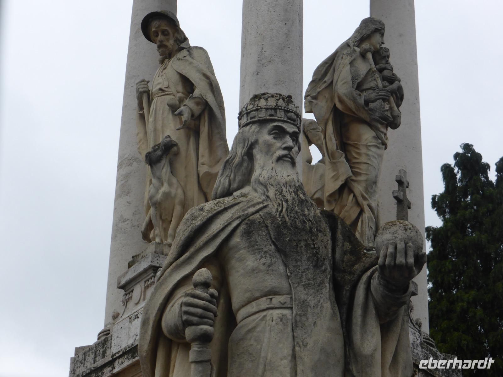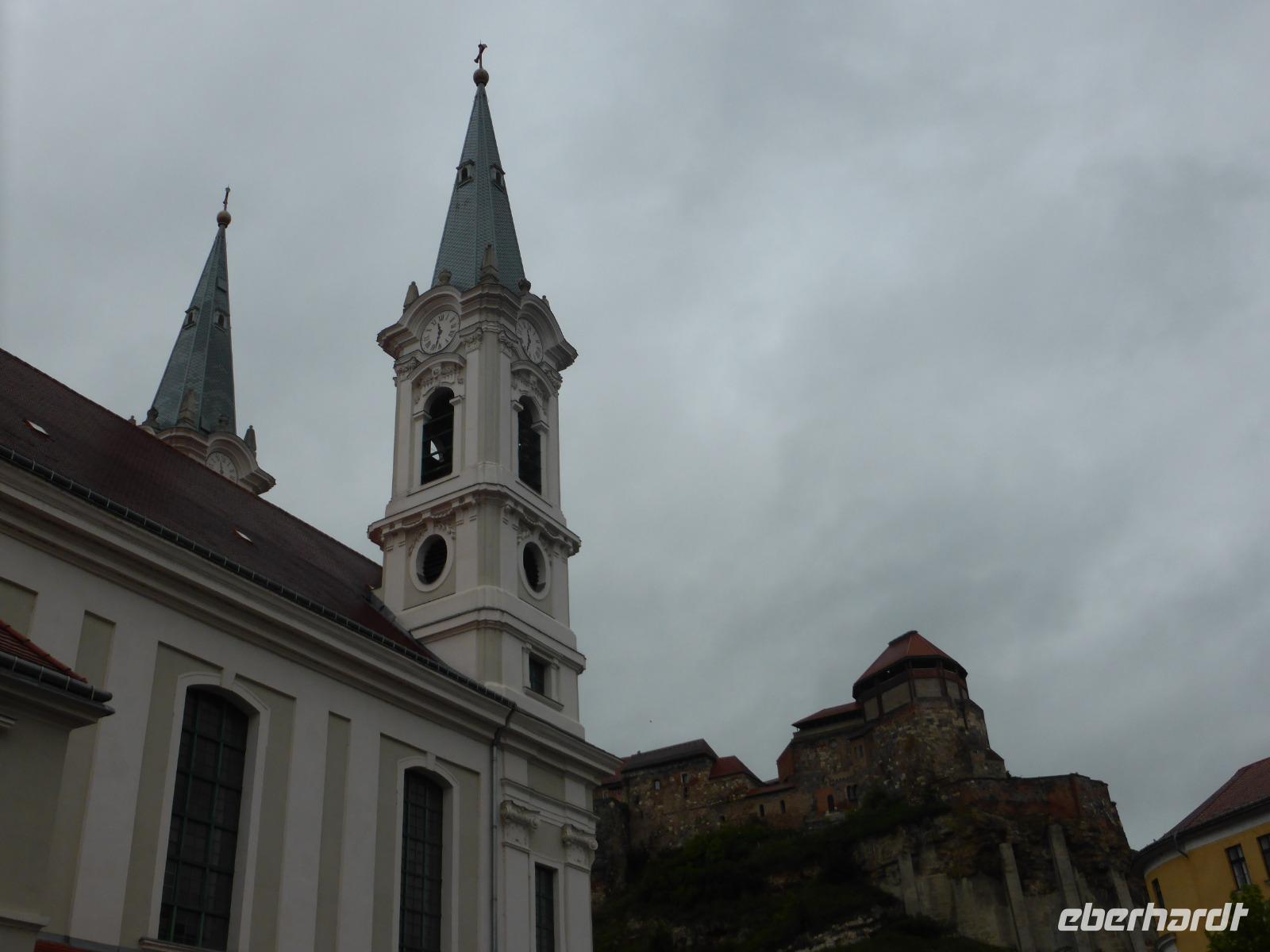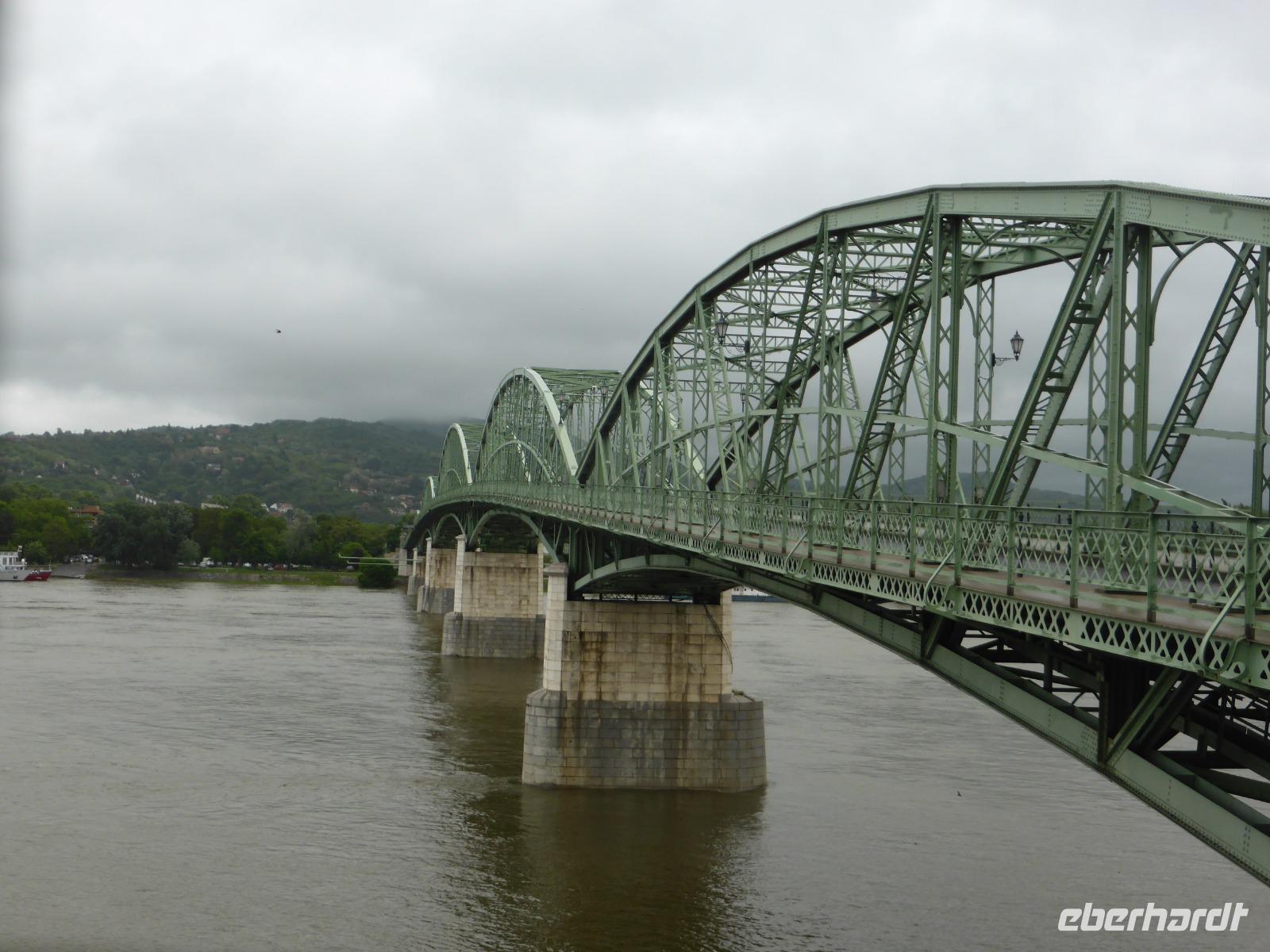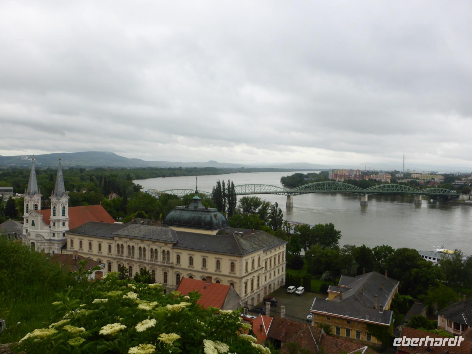 Die „Rossini" hat angelegt in Esztergom. Die Radtour findet heute am Vormittag statt. Leider regnt es und für den restlichen Tag ist auch kein Sonnenschein in Aussicht gestellt. Die gute Hälfte der Radgäste möchte nicht bei Regenwetter fahren und so macht sich der „harte Kern" mit dem Radguide auf den Weg. Die meisten Touristen überhaupt kommen wegen der Basilika in das kleine Städtchen. Sie ist die größte Kirche Ungarns, ihre massive Kuppel erinnert an den Petersdom in Rom und bestimmt das Stadtbild von Esztergom. Zuerst sollen wir den Berg erklimmen, auf der die Basilika thront. Es stellt sich heraus: das ist pillepalle. Wenn überhaupt, steigen wir nur wegen des nassen Pflasters vom Rad ab. Wir sind früher oben als die Busse mit den anderen Gästen, die etwa zeitgleich gestartet sind. Der Radguide führt uns durch die Kirche und sogar in die Krypta. Sehr beeindruckend. Die Aussicht nahe der Statue von König Stephan auf die Donau ist herrlich, wir sehen die „Rossini" liegen. Am Ufer gegenüber liegt die Schwesterstadt Sturova, bereits in der Slowakei. Die weitere Fahrt empfinden wir als idyllisch trotz des Regens. Das Cafe, in welchem wir eine Pause machen möchten, öffnet erst später. Weiterfahren ob des Regens macht nicht so recht Sinn, so drehen wir um. Eine Besichtigung des malerischen Stadtteils Vizivaros von Esztergom, dem ältesten Städtchen am Donauknie, lassen wir uns aber nicht nehmen. Die barocken Gassen sind zauberhaft, der Marktplatz mit dem Rathaus sehr beschaulich. Eine „alte Bekannte" begegnet uns hier: die Heilige Elisabeth zu Thüringen, geboren als Prinzessin in Esztergom in Ungarn, bekannt durch die Legende des Rosenwunders, als sie von der Wartburg bei Eisenach den Armen in der Stadt heimlich Brot bringen wollte. Zuguterletzt fahren wir noch über die Maria Valeria Brücke zum anderen Donauufer, um die Sicht auf das Ensemble der Basilika von gegenüber auf uns wirken zu lassen. Pitschenass werden wir schlussendlich in den letzten Minuten auf dem Weg zur „Rossini". Aber, und nicht geschummelt: es war ein schöner Radausflug, der uns zufrieden stimmt.