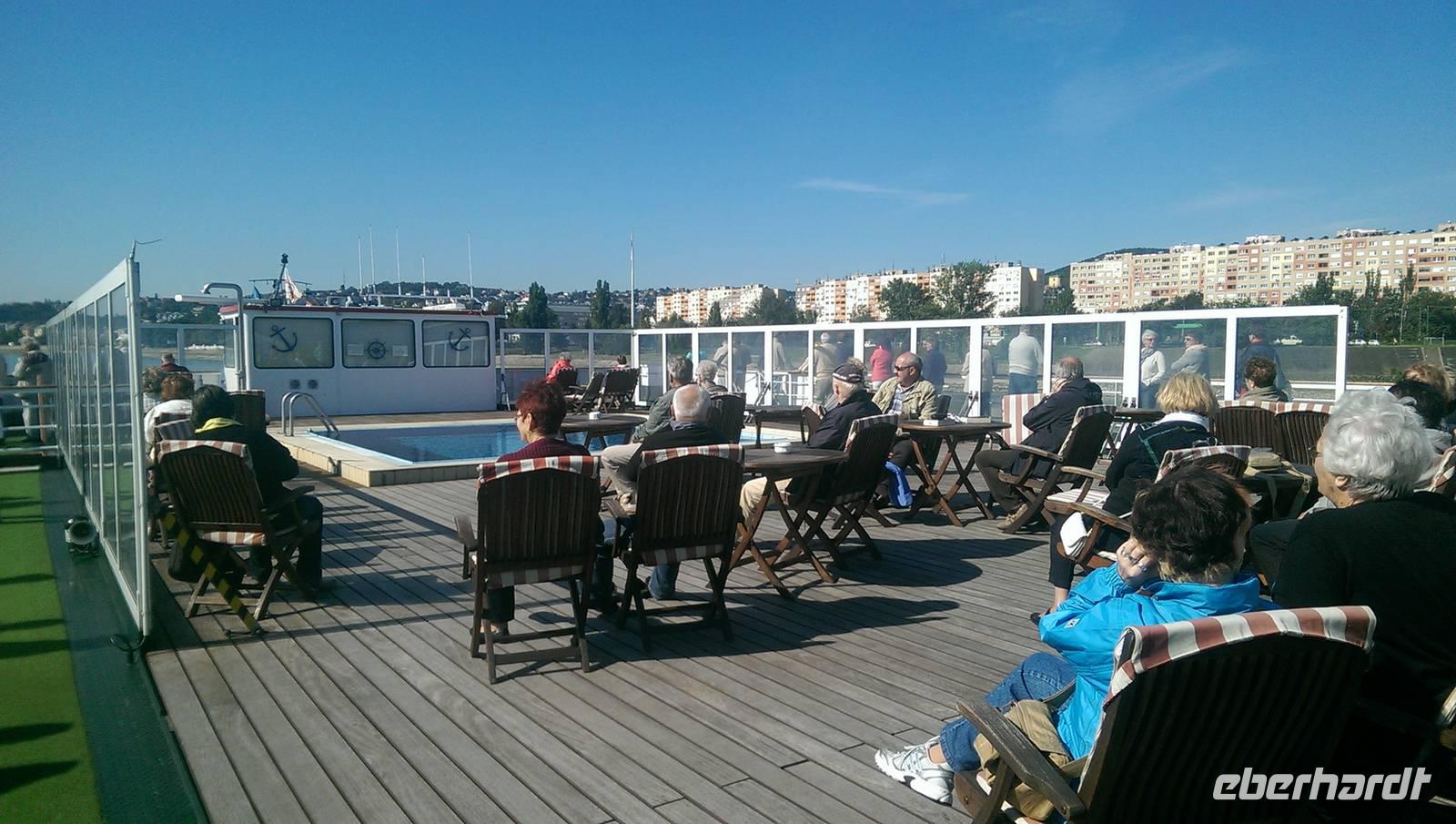Mit „Egészségedre" (zu Deutsch „Prost") begrüßen wir Ungarns Hauptstadt Budapest, da die Crew zur Einfahrt einen Sektempfang vorbereitet. Wir legen an und uns bietet sich die Möglichkeit vor dem Mittagessen noch einmal in die Markthalle zu gehen. Hier kaufen viele als Mitbringsel für Zuhause Palinka, Gulaschpaste oder Paprikapulver - ganz typische ungarische Produkte. Am frühen Nachmittag beginnt die Stadtführung, welche uns zum Heldenplatz, zur Fischerbastai, der Burg und dem Gellertberg führt. Das servierte Abendessen ist wie immer ausgezeichnet. Am Abend sehen wir bei einer Lichterfahrt die bezaubernde Stadt bei Nacht. Sie ist eine Perle an der Donau. Wir kehren mit hunderten von Bildern auf die „MS Rossini" zurück und genießen die Ausfahrt mit dem Schiff aus Budapest. Wir sehen zum letzten Mal das Parlament herrlich beleuchtet.