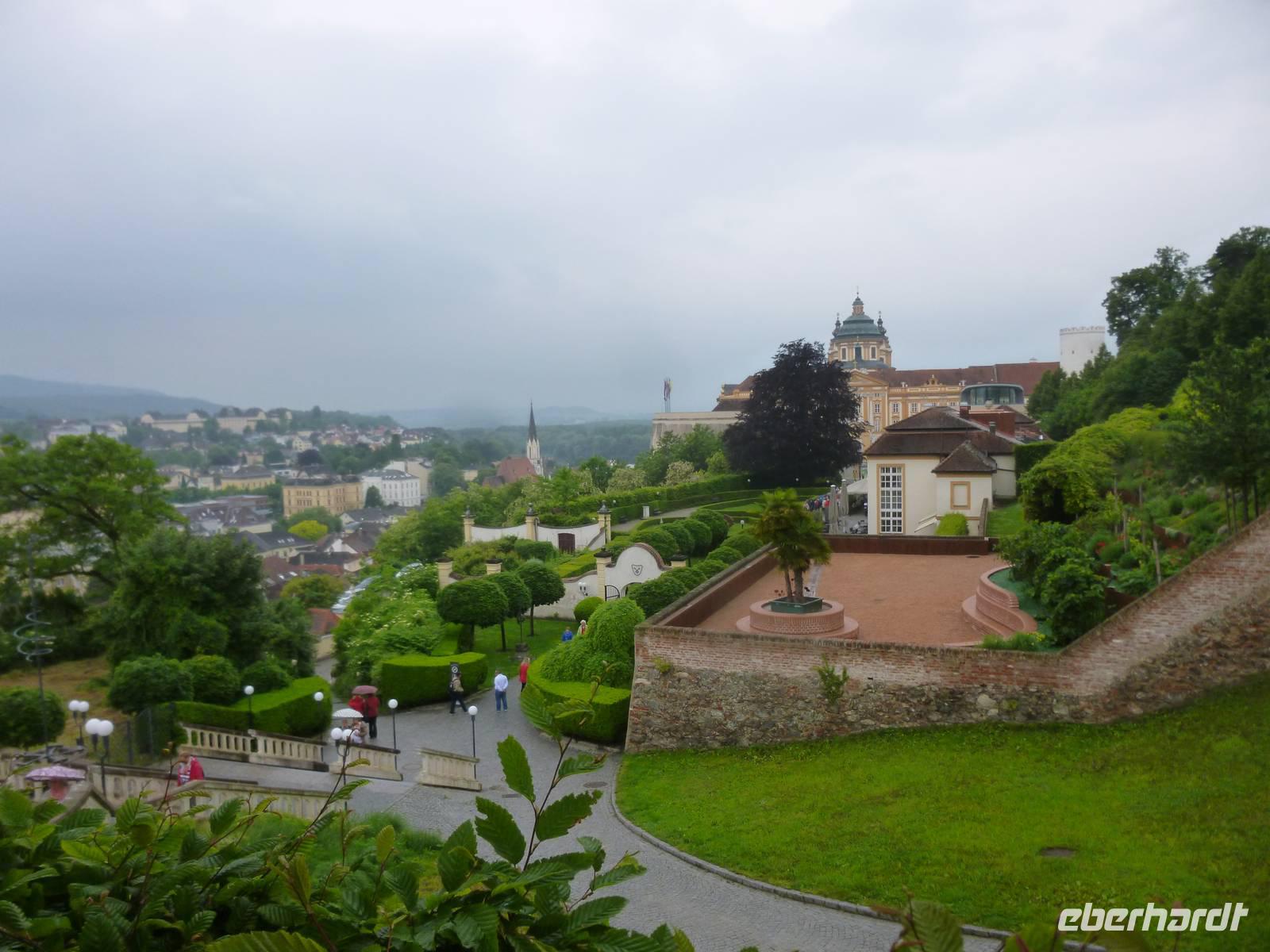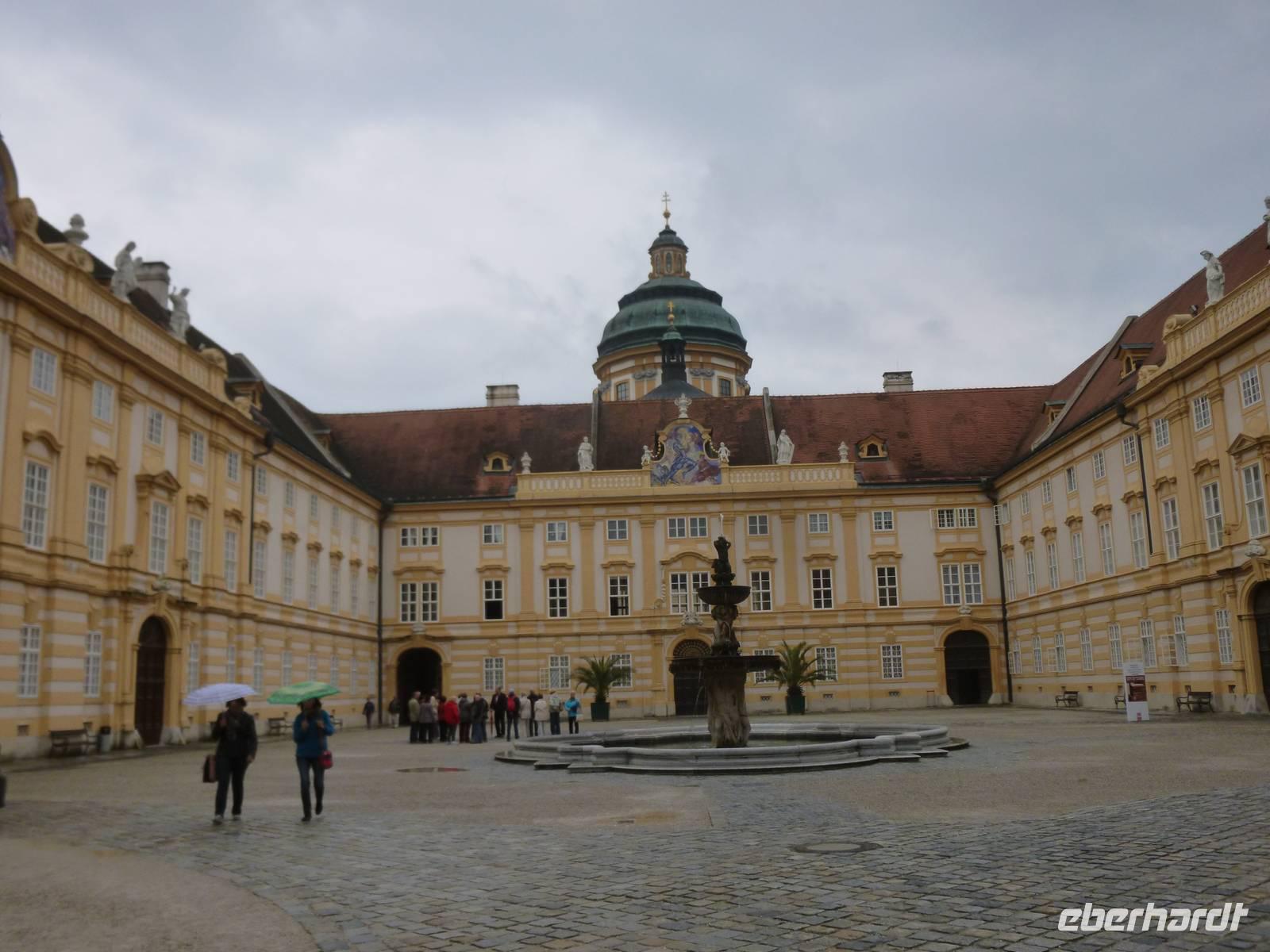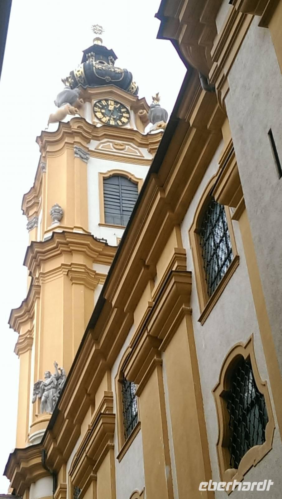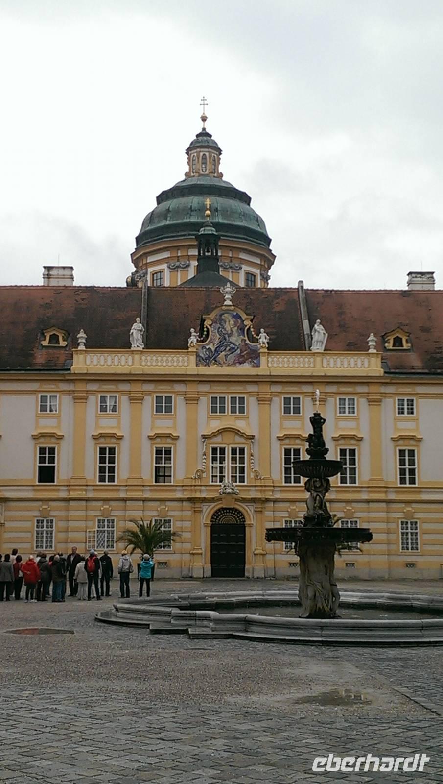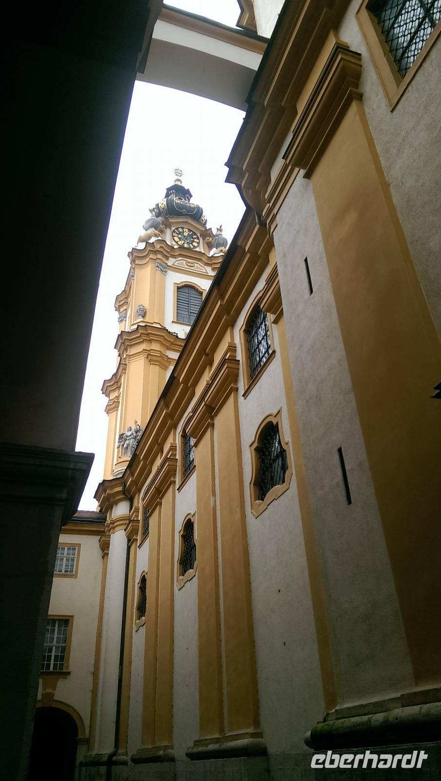 Im Stift Melk . Die sehr schön restaurierte Fassade des Stifts beeindruckte uns sehr. Nach einem kurzen Spaziergang fuhren wir zurück zum Schiff.