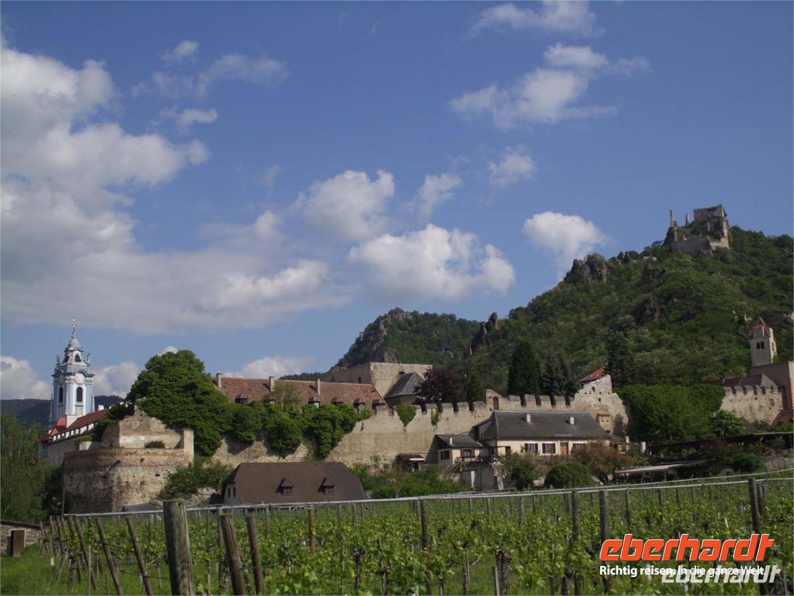 Unser Schiff legt in Krems an. Durch das Steiner Tor betreten wir die alte ummauerte Stadt und schlendern durch die Gassen, vorbei an prachtvoll restaurierten Barockhäusern. Die Wachau gehört zu den schönsten Landschaften an der Donau. Davon können wir uns bei der Weiterreise nach Dürrnstein überzeugen. Bewaldete Hügel und Weinberge säumen unseren Weg. Dann