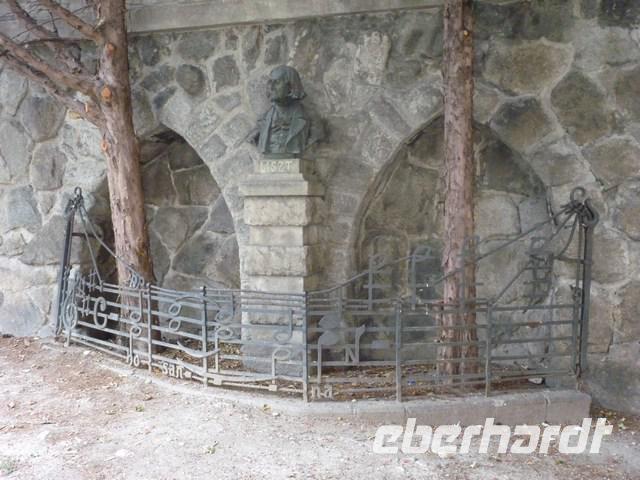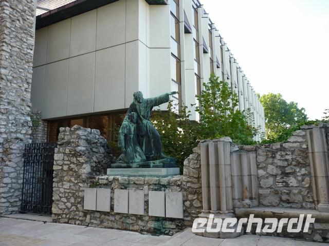 Halbkreisförmig unter Säulen, stehen die Statuen historischer Persönlichkeiten.