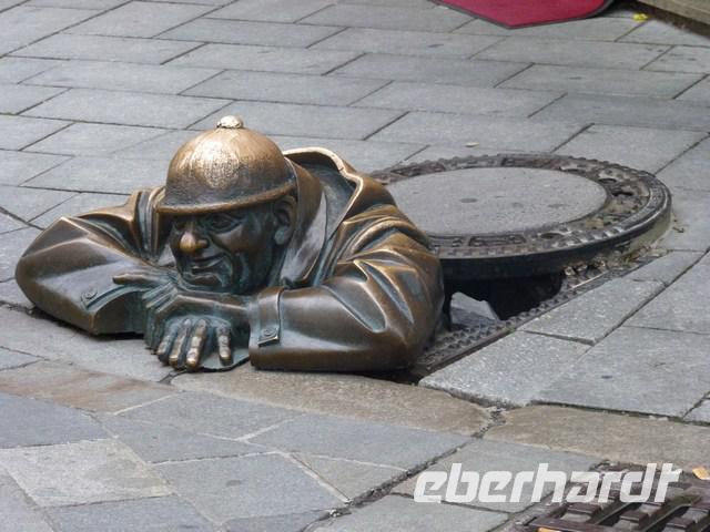Anziehungspunkte und lustige Zwischenstopps in der Altstadt sind die verschiedenen kuriosen Figuren, wie der „Gaffer" eine Bronzefigur die aus dem Gullyschacht schaut.