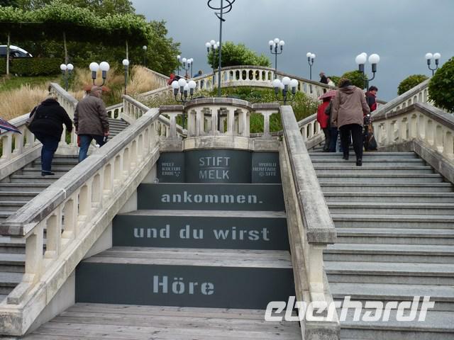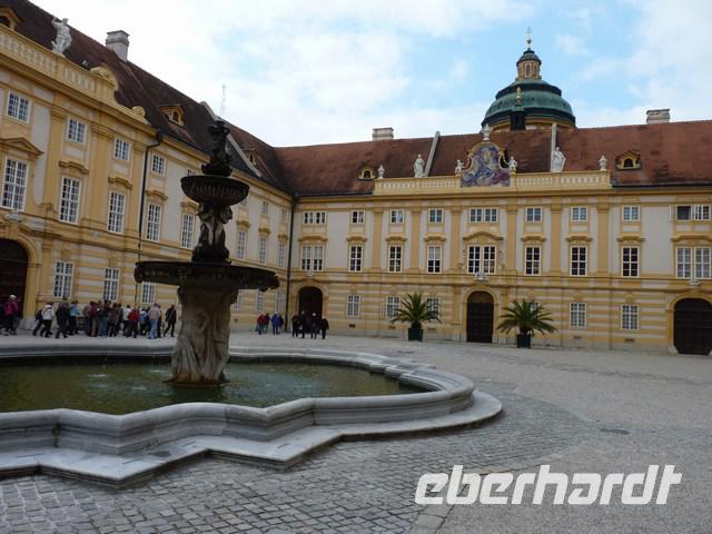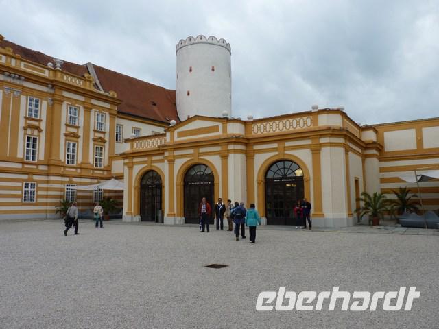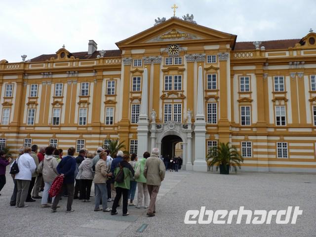 Weiter ging es per Bus durch die schöne Wachau, entlang der Weinberge und Marillenplantagen. Unser Ziel war das Stift Melk. Die sehr schön restaurierte Fassade des Stifts beeindruckte uns sehr.