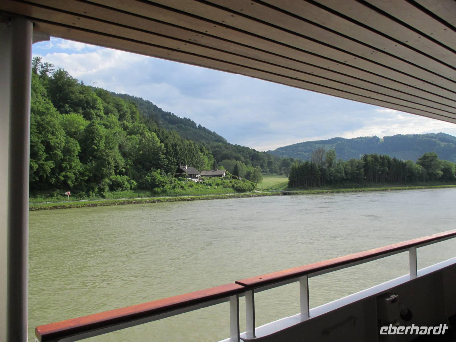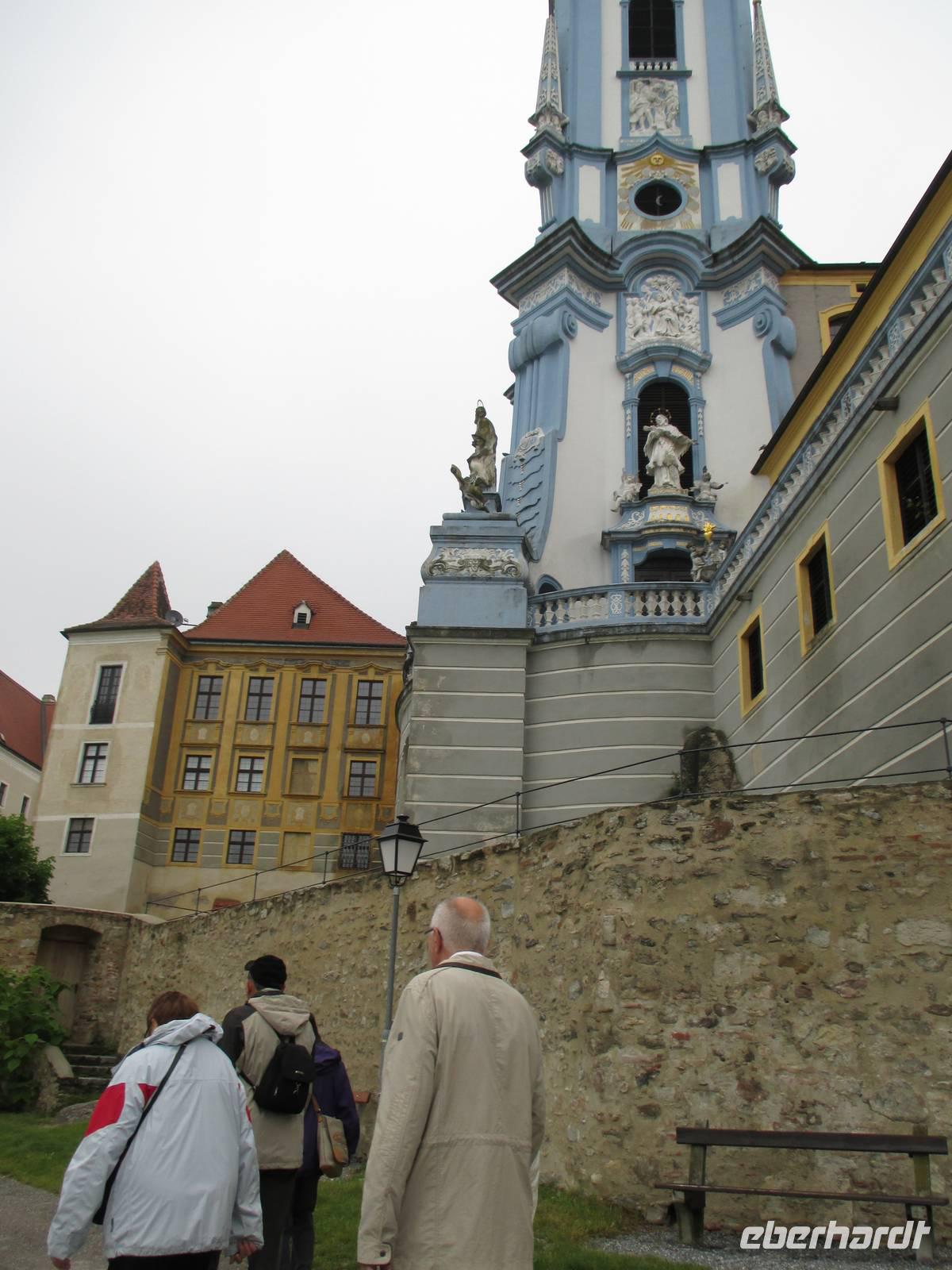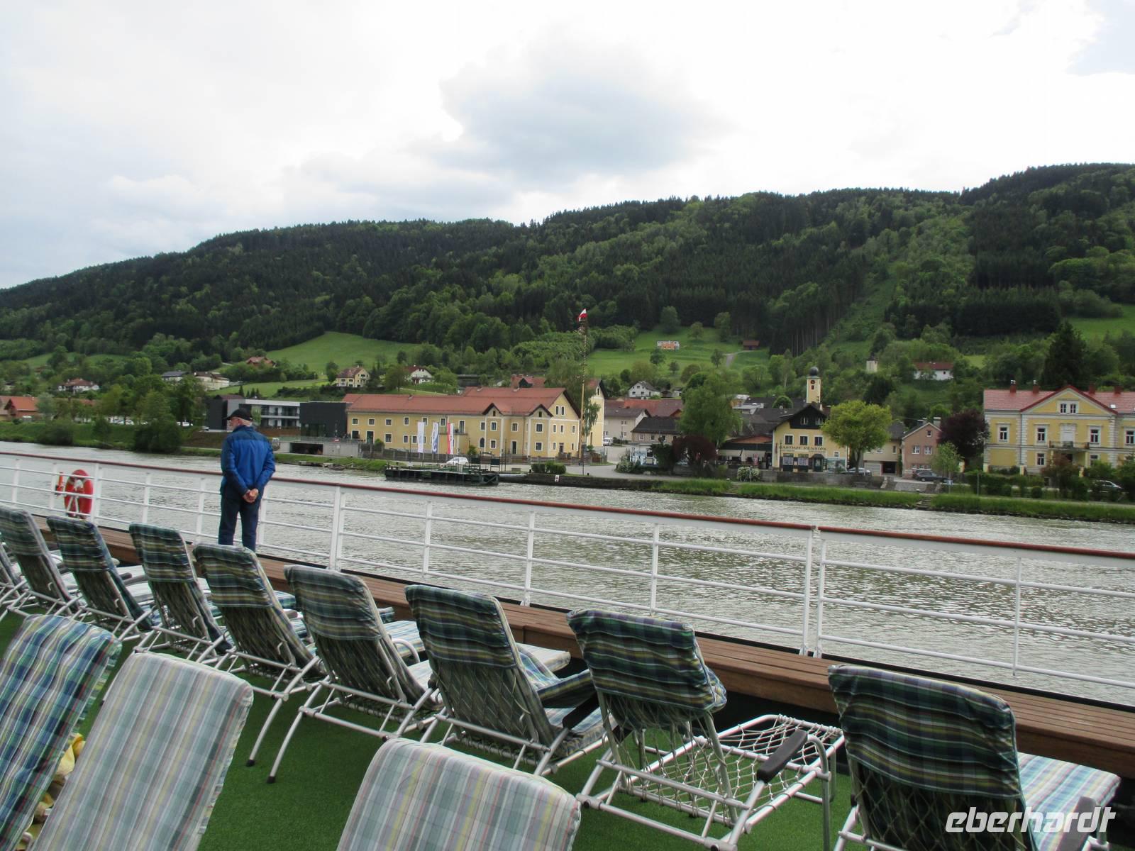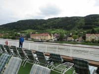 Die Wachau ist ein besonders schöner Landstrich beiderseits der Donau in Niederösterreich, der durch den Weinanbau, die Verarbeitung der speziell hier wachsenden Marillen und den Fremdenverkehr geprägt ist. Die Rossini legte während des Frühstücks in Dürnstein, der kleinsten Stadt Österreichs, an. Es begann ein geführter Stadtrundgang mit Erklärungen zur Geschichte des Ortes und seiner historischen Gebäude. Wahrzeichen ist der blau-weiße Pfarrkirchturm. Anschließend gab es Gelegenheit, leckeren Marillenschnaps zu kosten oder Souvenirs einzukaufen. Die anschließende Busfahrt führte uns nach Melk. Das weltbekannte Stift ist ein imposanter, bestens restaurierter Gebäudekomplex, dessen Höhepunkt die Stiftskirche darstellt. Die besonders prunkvolle Innenausstattung beeindruckte die Reisegäste. Manche nutzten die Zeit für einen Besuch des Klostergartens, andere genossen die herrliche Sonne bei einem leckeren Eis. Mit der Fahrt zum Schiff endete der letzte Ausflug der Reise, die Rossini legte während des Mittagessens ab in Richtung Passau. Inzwischen war endlich das Sommerwetter angekommen, die Gäste konnten das Sonnendeck ausgiebig zur Entspannung nutzen.