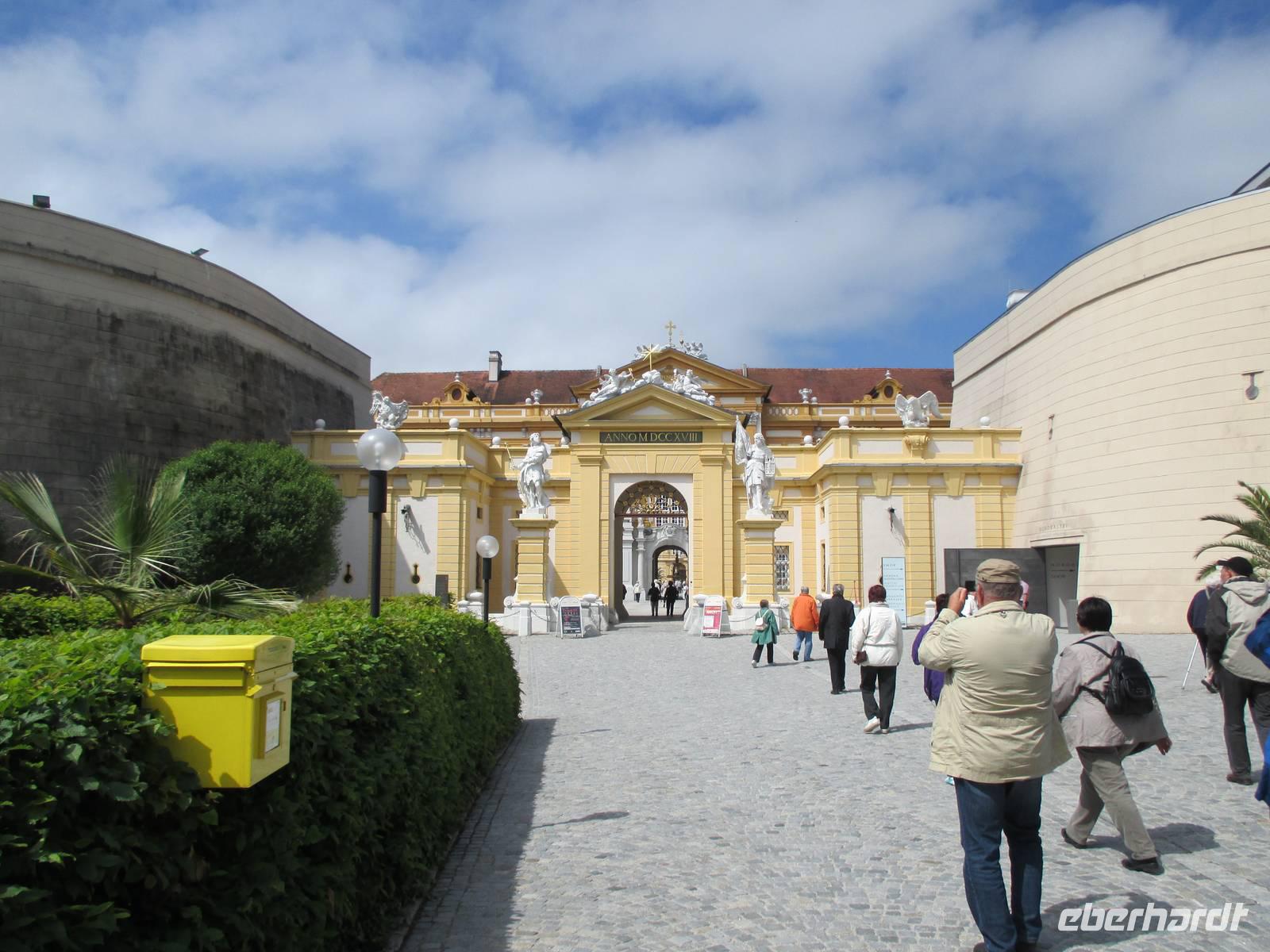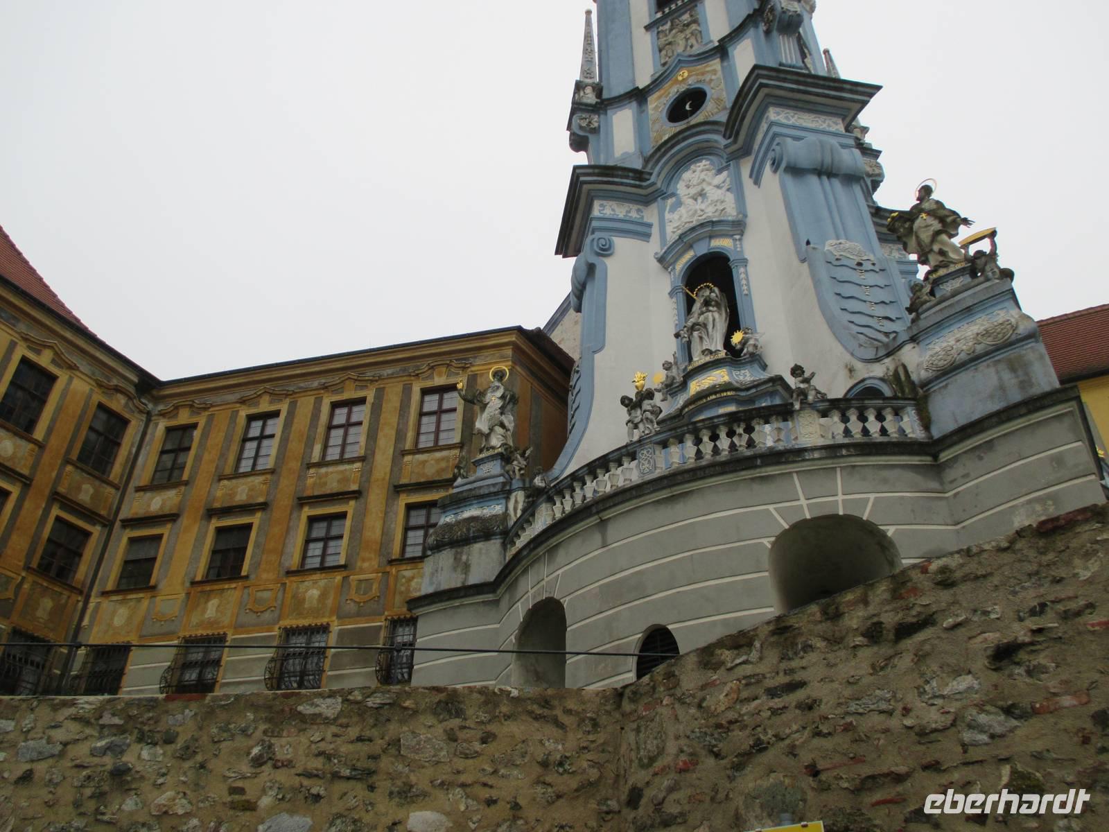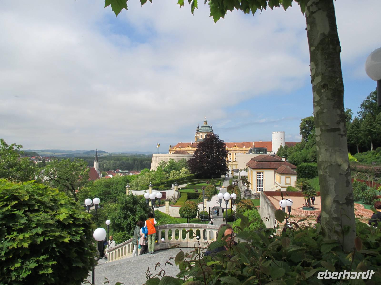 Die Wachau ist ein besonders schöner Landstrich beiderseits der Donau in Niederösterreich, der durch den Weinanbau, die Verarbeitung der speziell hier wachsenden Marillen und den Fremdenverkehr geprägt ist. Die Rossini legte während des Frühstücks in Dürnstein, der kleinsten Stadt Österreichs, an. Es begann ein geführter Stadtrundgang mit Erklärungen zur Geschichte des Ortes und seiner historischen Gebäude. Wahrzeichen ist der blau-weiße Pfarrkirchturm. Anschließend gab es Gelegenheit, leckeren Marillenschnaps zu kosten oder Souvenirs einzukaufen. Die anschließende Busfahrt führte uns nach Melk. Das weltbekannte Stift ist ein imposanter, bestens restaurierter Gebäudekomplex, dessen Höhepunkt die Stiftskirche darstellt. Die besonders prunkvolle Innenausstattung beeindruckte die Reisegäste. Manche nutzten die Zeit für einen Besuch des Klostergartens, andere genossen die herrliche Sonne bei einem leckeren Eis. Mit der Fahrt zum Schiff endete der letzte Ausflug der Reise, die Rossini legte während des Mittagessens ab in Richtung Passau. Inzwischen war endlich das Sommerwetter angekommen, die Gäste konnten das Sonnendeck ausgiebig zur Entspannung nutzen.