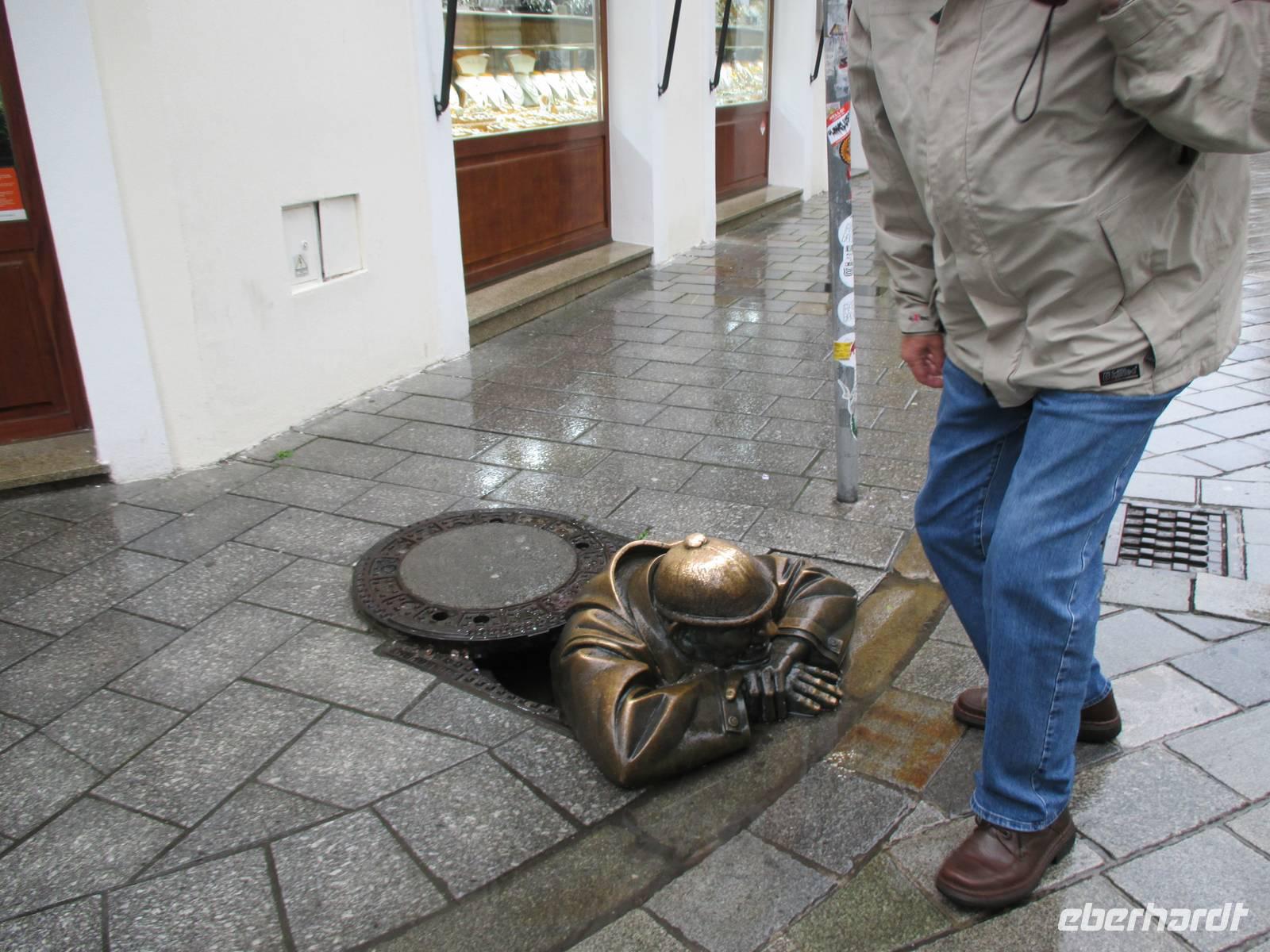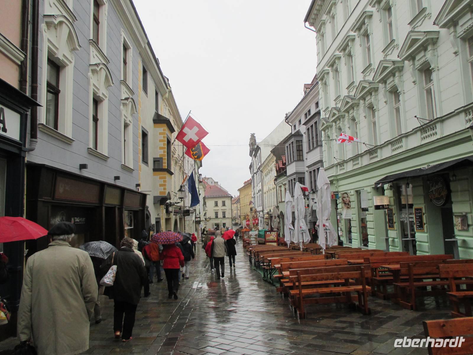 Gut gelaunt und ausgeschlafen begann mit einem guten Frühstück der Vormittag auf der „Rossini". Ab 9:00 Uhr standen die Reiseleiter aus den Bussen für die Buchung von fakultativen Ausflügen und Klärung von Fragen und Anliegen im Salon zur Verfügung. Unser Josef, der Reiseleiter auf dem Schiff, erläuterte die Sehenswürdigkeiten auf der Fahrstecke nach Bratislava, insbesondere in Wien gab es viel zu vom Schiff aus zu sehen. Ab 10:30 Uhr gab er bei einem Vortrag in der Panoramabar den Gästen viele interessante Informationen zur gesamten Donau, der Geschichte, den Staustufen und Kraftwerken sowie den politischen Verhältnissen entlang des Flusses. Während des Mittagessens erreichten wir Bratislava, die Hauptstadt der Slowakei. Die Busse für die Stadtrundfahrt standen überpünktlich bereit, nur der Wettergott wollte nicht so richtig mitspielen. Während der Busfahrt durch die die Botschafts- und Villenviertel, vorbei am Präsidentenpalast, vielen Ministerien, Banken und historischen Gebäuden auf dem Weg hinauf zur Burg saßen wir trocken und warm, beim Ausstieg am neuen Parlamentsgebäude und dem Weg zur Panoramaaussicht auf der Burg, die immerhin schon US-Präsident Bush genossen hat, begleiteten uns Kälte, Sturm und Regen. Das schlechte Wetter schreckte aber den Großteil der Gäste nicht ab, auch am anschließenden geführten Rundgang durch die historische Altstadt teilzunehmen. Drei örtliche Reiseleiter zeigten und erläuterten den interessierten Gästen ihre aufblühende Stadt. Beim Abendessen erfuhren wir vom Kapitän, dass auf Grund eines starken Sturms und hoher Wellen die Schleuse Gabcikovo gesperrt und eine Weiterfahrt gegenwärtig nicht möglich ist. Ein Unwetter auf dem Balkan und den angrenzenden Gebieten hat viele Schäden angerichtet und wirkt sich nun auf unser weiteres Programm aus.