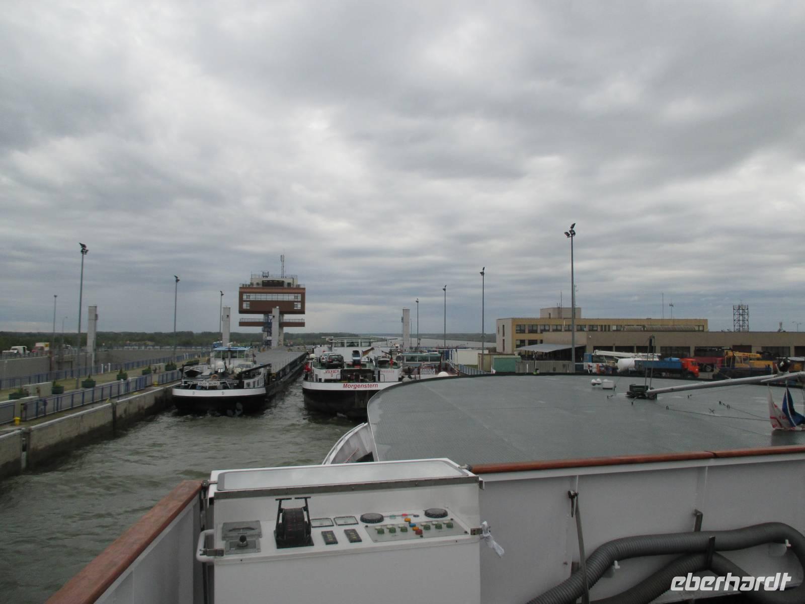 Währenddessen hatten wir die Schleuse Gabicikovo erreicht. Infolge des hohen Wasserstandes musste das Schiff ca. 3 h warten, bis die Passage freigegeben und die Fahrt in Richtung Wien fortgesetzt werden konnte.