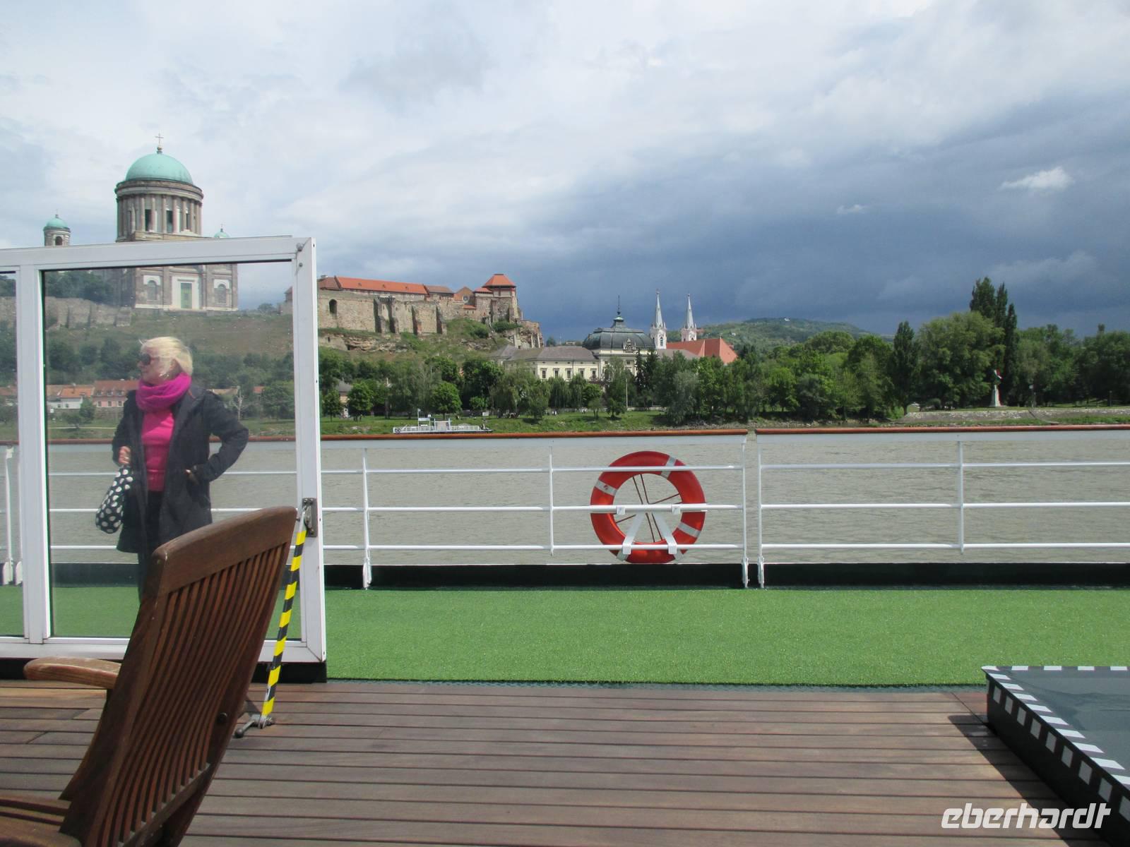 Von Budapest aus fuhr der Bus durch die Berge des Donauknies nach Ezstergom, wo zeitgleich die Rossini anlegte. Unmittelbar nach der Einschiffung wurde das wiederum leckere Mittagessen serviert. Nach dem Nachmittagskaffee las Josef, der Reiseleiter des Schiffes, lustige Geschichten vor. Der Musiker Alexej Prokopan aus der Ukraine, der sonst jeden Abend mit seinem Keyboard zum Tanz aufspielt, zeigte sein Können bei einem klassischen Klavierkonzert. Für die Zeit nach dem Abendessen hatten die Reiseleiter von Eberhardt-Travel, GSR und Eberhardt-Reisen ein Donauquiz vorbereitet. Es gab Kofferbänder, Brotdosen, Tassen, Sekt und Reisegutscheine zu gewinnen. Wie jeden Abend konnte dann noch der leckere Mitternachtssnack verzehrt werden.