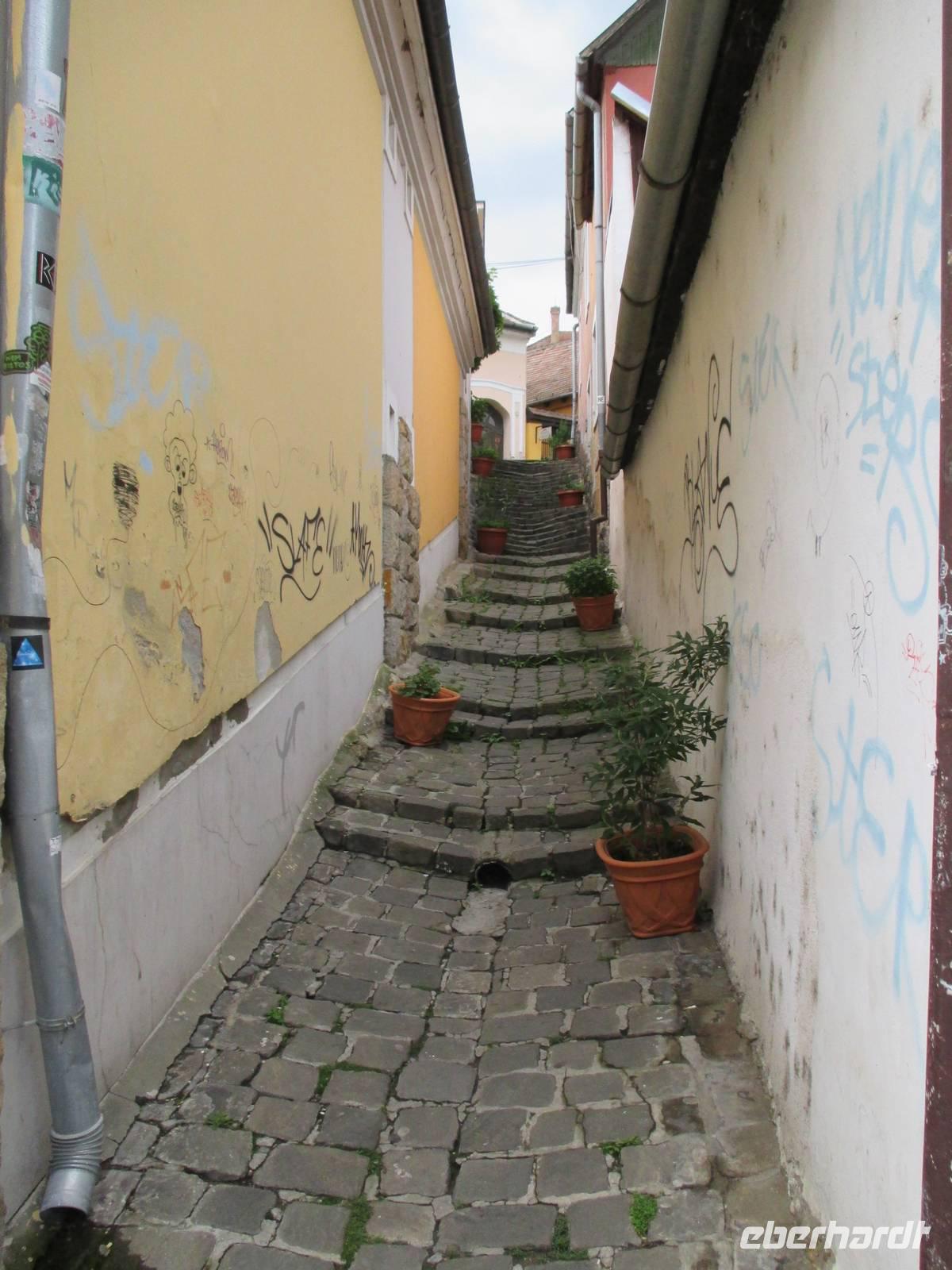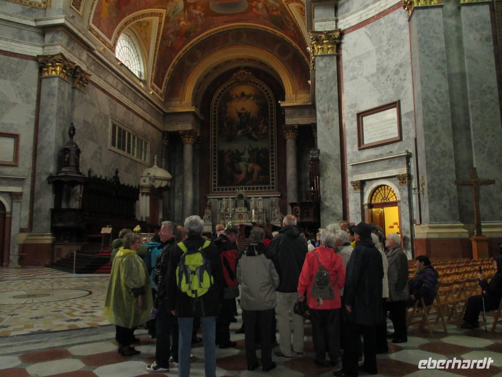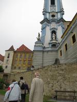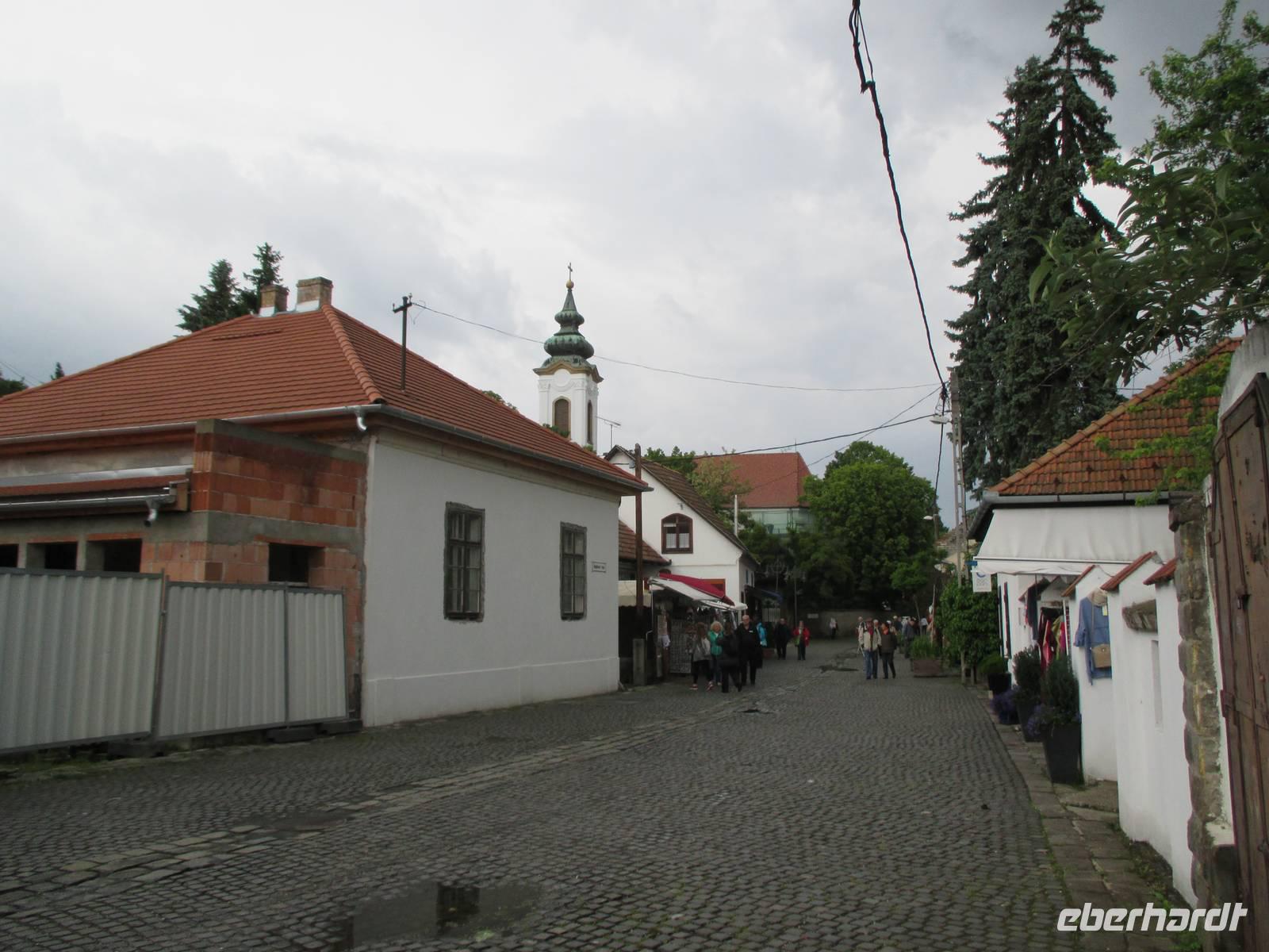 Nachdem das Schiff außerplanmäßig über Nacht in Bratislava bleiben musste, war die Überraschung groß, dass um 6:00 Uhr morgens plötzlich die Motoren angingen und die Fahrt fortgesetzt werden konnte. Allerdings war der Zeitplan nun durcheinander geraten und es wurde getüftelt, wie das Programm weiter gestaltet werden konnte. Für die Schiffsbesatzung stellte sich erst einmal die Aufgabe, trotz anhaltenden Regens und starken Winds heil die große Schleuse mit einem Wasserunterschied von 20 m zu passieren. Nachdem das gelungen war, legten wir nach dem Mittagessen außerplanmäßig in Esztergom an, dem ersten Reiseziel in Ungarn. Um 14:30 Uhr begann der eigentlich auf der Rückfahrt vorgesehene Busausflug in die Stadt Esztergom und zum Künstlerdorf Szentendre. Die Stadt Ezstergom liegt am Donauknie. Hier ändert die Donau, die bis dahin von West nach Ost geflossen ist, die Richtung, sie fließt jetzt nach Süden. Die strategisch wichtige Lage war entscheidend für die wechselvolle Geschichte der Stadt, hier wurde hoch über der Donau die gewaltige Basilika errichtet, die heute die größte Kirche in Ungarn ist. Auf der Busfahrt entlang der Donau gaben die örtlichen Reiseleiter vielfältige Auskünfte und Informationen über die Historie des Landstriches sowie über die Lebensverhältnisse und Besonderheiten des ungarischen Volkes und seiner Menschen.Der Ausflug führte dann nach Szentendre und pünktlich zum Ausstieg aus dem Bus machte auch der Regen mal eine Pause. Das Dorf mit seinen alten Bauernhäusern hat wegen seiner Ursprünglichkeit und Idylle viele Kunsthandwerker, Maler und Bildhauer angezogen. Inzwischen ist in fast jedem Gebäude ein Geschäft untergebracht, in dem sowohl die im Ort hergestellten Kunstartikel, aber auch Massenprodukte und typisch ungarische Souvenirs verkauft werden. Nach einem individuellen Spaziergang durch den Ort ging es zurück zum Schiff.