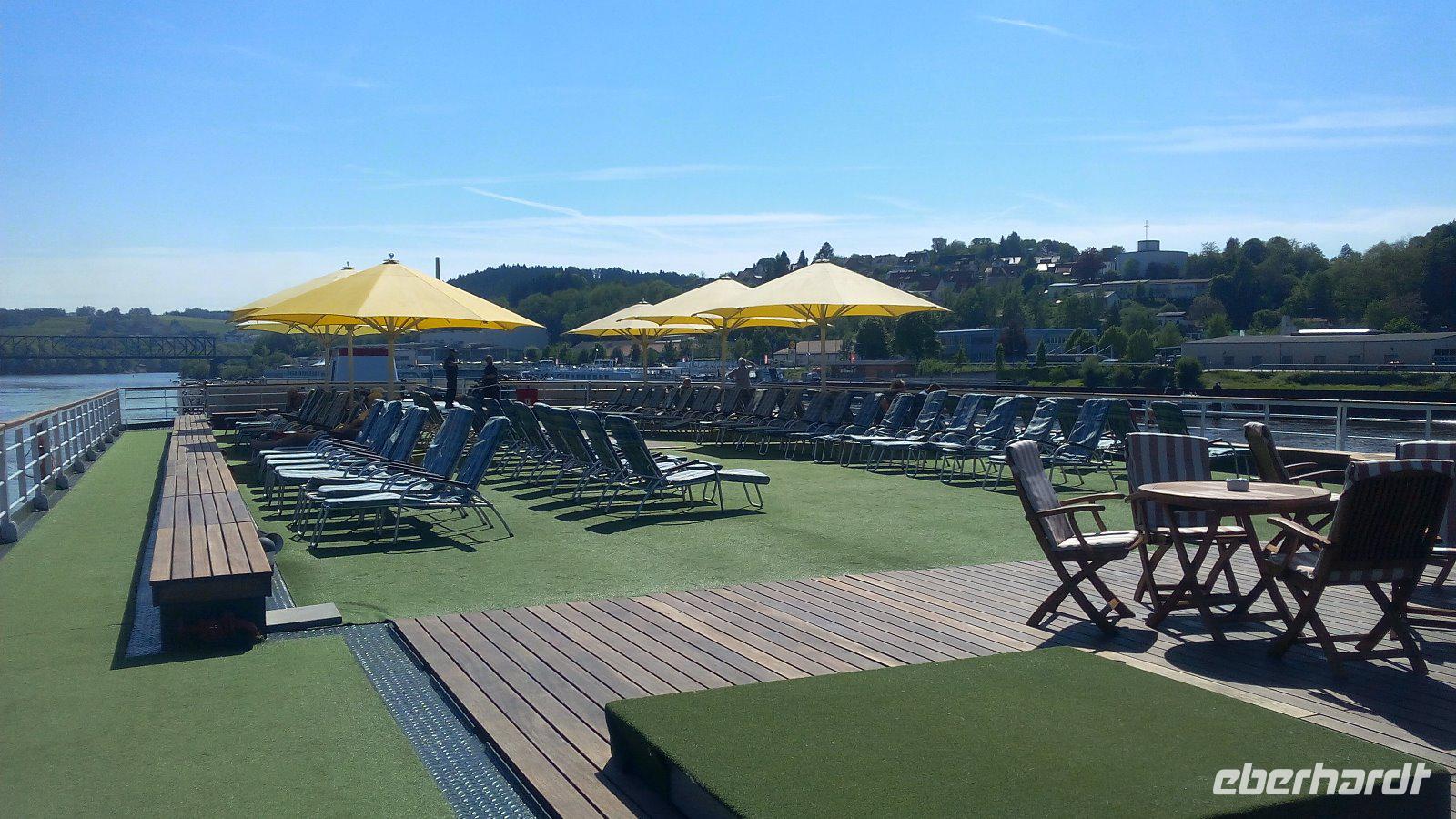 Aber ab 07.00 Uhr treffen wir uns zum Frühstück. Die Aktiven unter uns kommen da schon von der Frühgymnastik, die man auf dem Sonnendach mit Jozef (unserem Reiseleiter des Schiffes) mitmachen kann.
