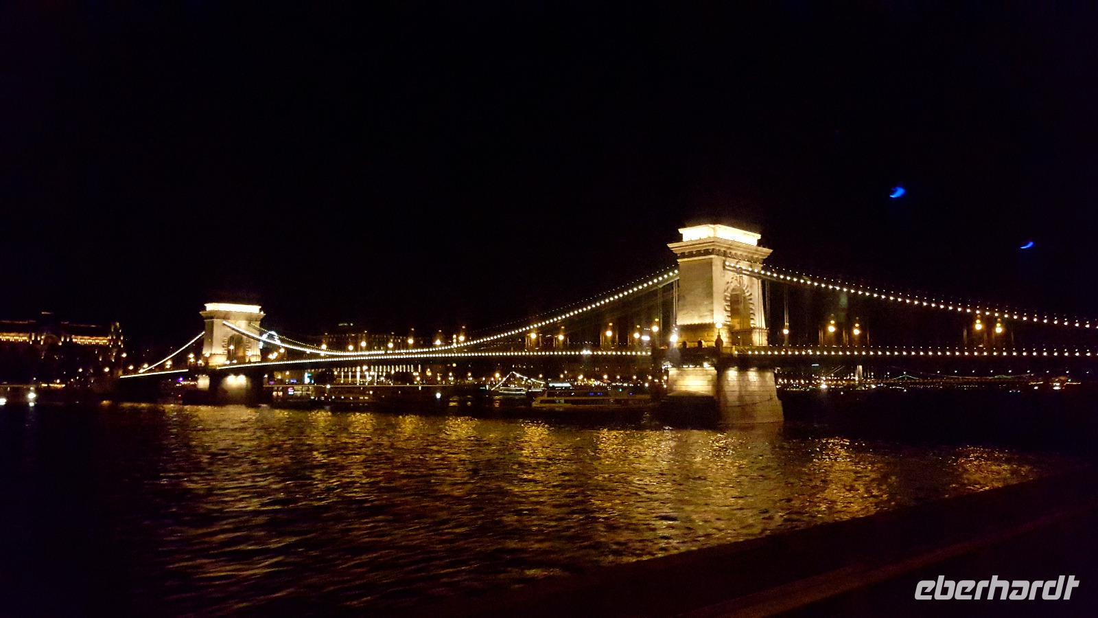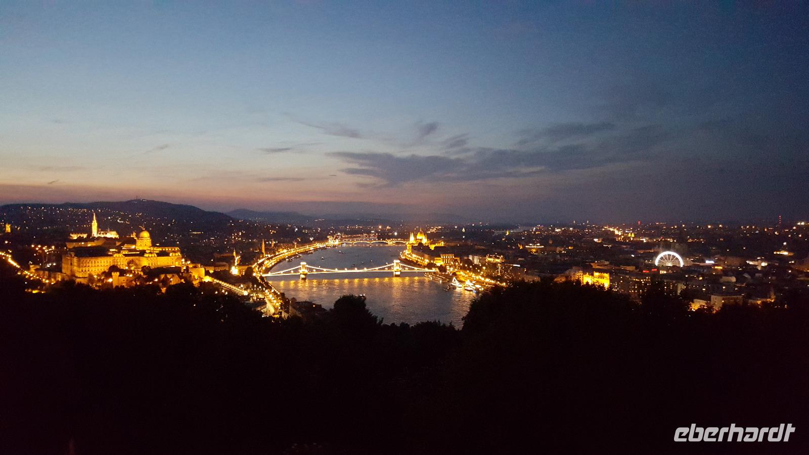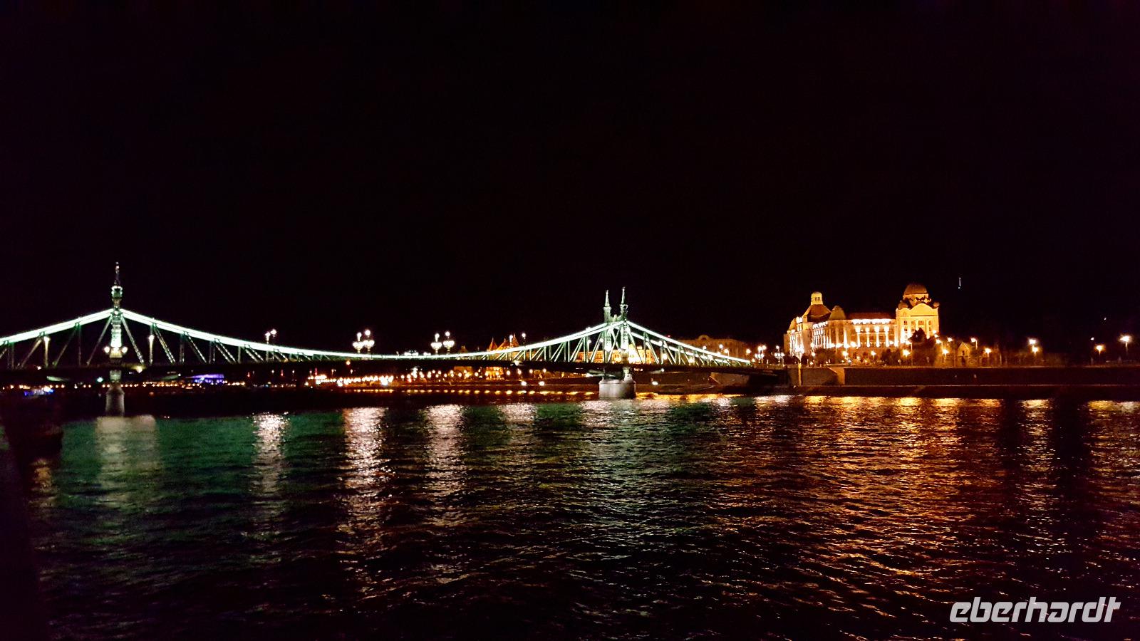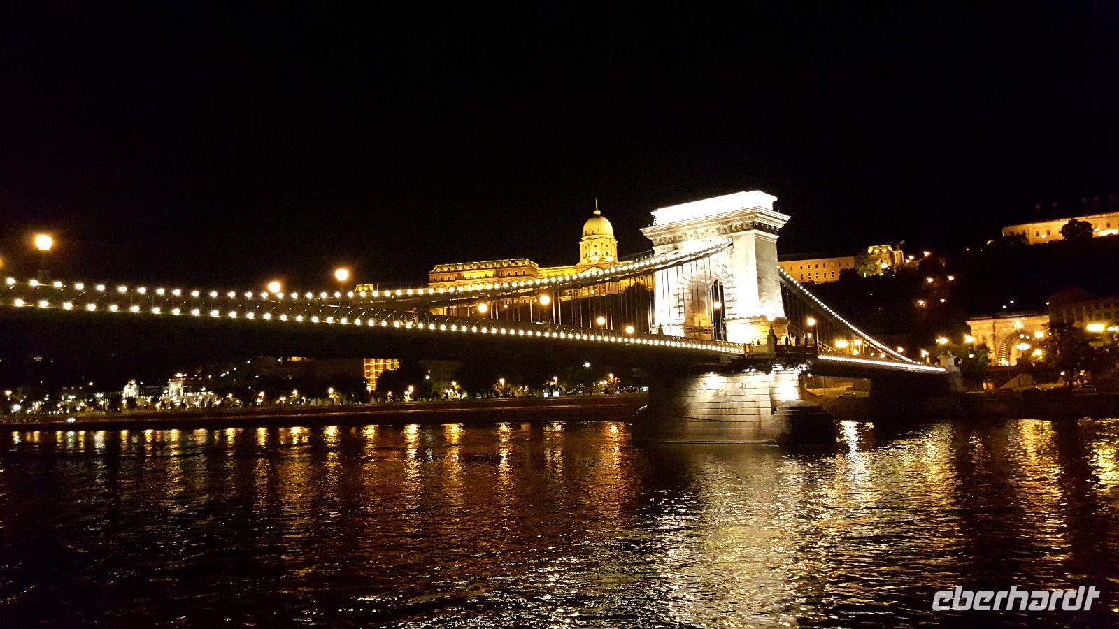 Wir haben immer noch nicht genug von Budapest und fahren gegen 21.00 Uhr noch einmal auf den Gellertberg und durch die Stadt um Budapest bei Nacht erleben zu können. Ein Erlebnis der besonderen Art. Nachdem alle Gäste wieder an Bord sind legen wir gegen 24.00 ab. Einige Gäste halten sich auf dem Sonnendeck auf, um die Fahrt stromaufwärts durch das beleuchtete Budapest zu beobachten.