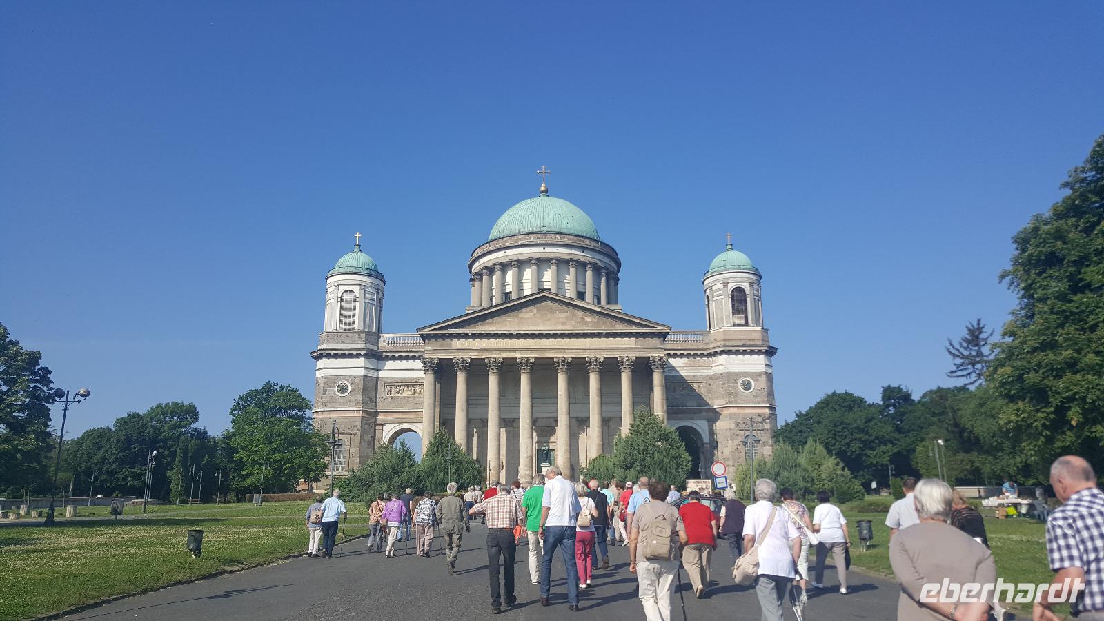 Wir haben heute eine der reizvollsten Strecken auf ungarischer Seite vor uns. Die ca. 60 km lange Strecke zwischen Esztergom und Szentendre bezeichnet man als Donauknie. Wir fahren entlang dieser Strecke mit dem Bus und besuchen als erstes Esztergom. Von Weitem ist die Kuppel der Kathedrale zu erkennen und ihre Dominanz verrät auch, worin die Bedeutung des Ortes liegt. Die Stadt war und ist Sitz des Erzbischofs und das Zentrum der katholischen Kirche in Ungarn. Wir sind zeitig unterwegs und die ersten Gäste, die auf dem Platz vor der Kathedrale stehen und andächtig den Glockenklang hören.